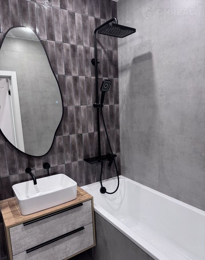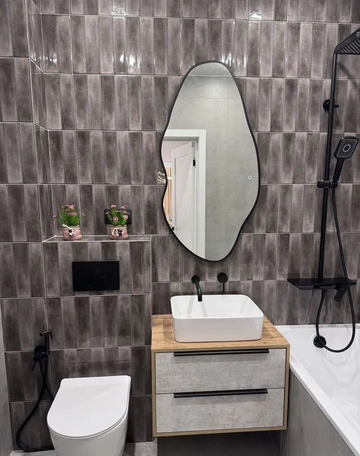 В ванной установлен тёплый пол, качественная сантехника премиальных брендов.