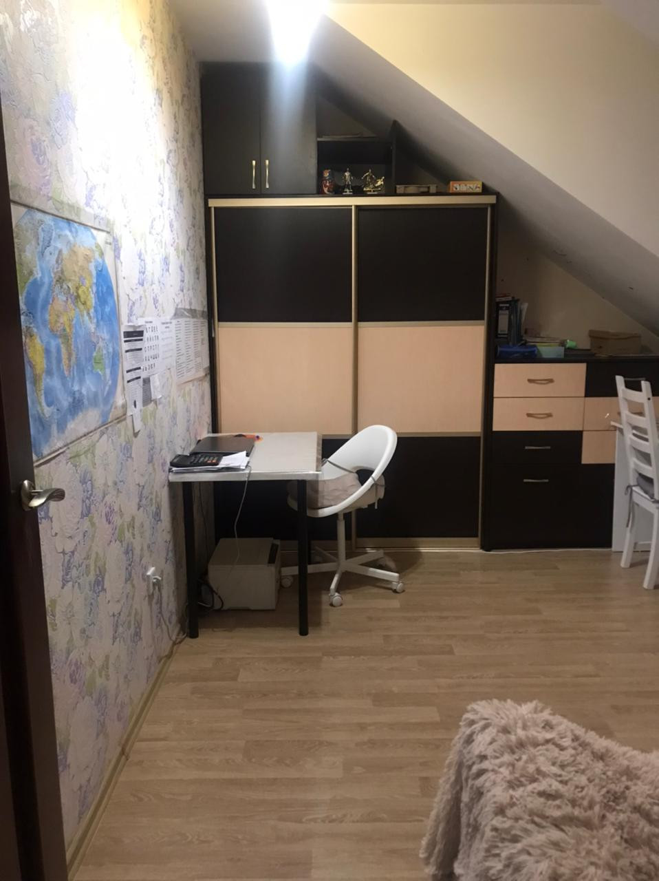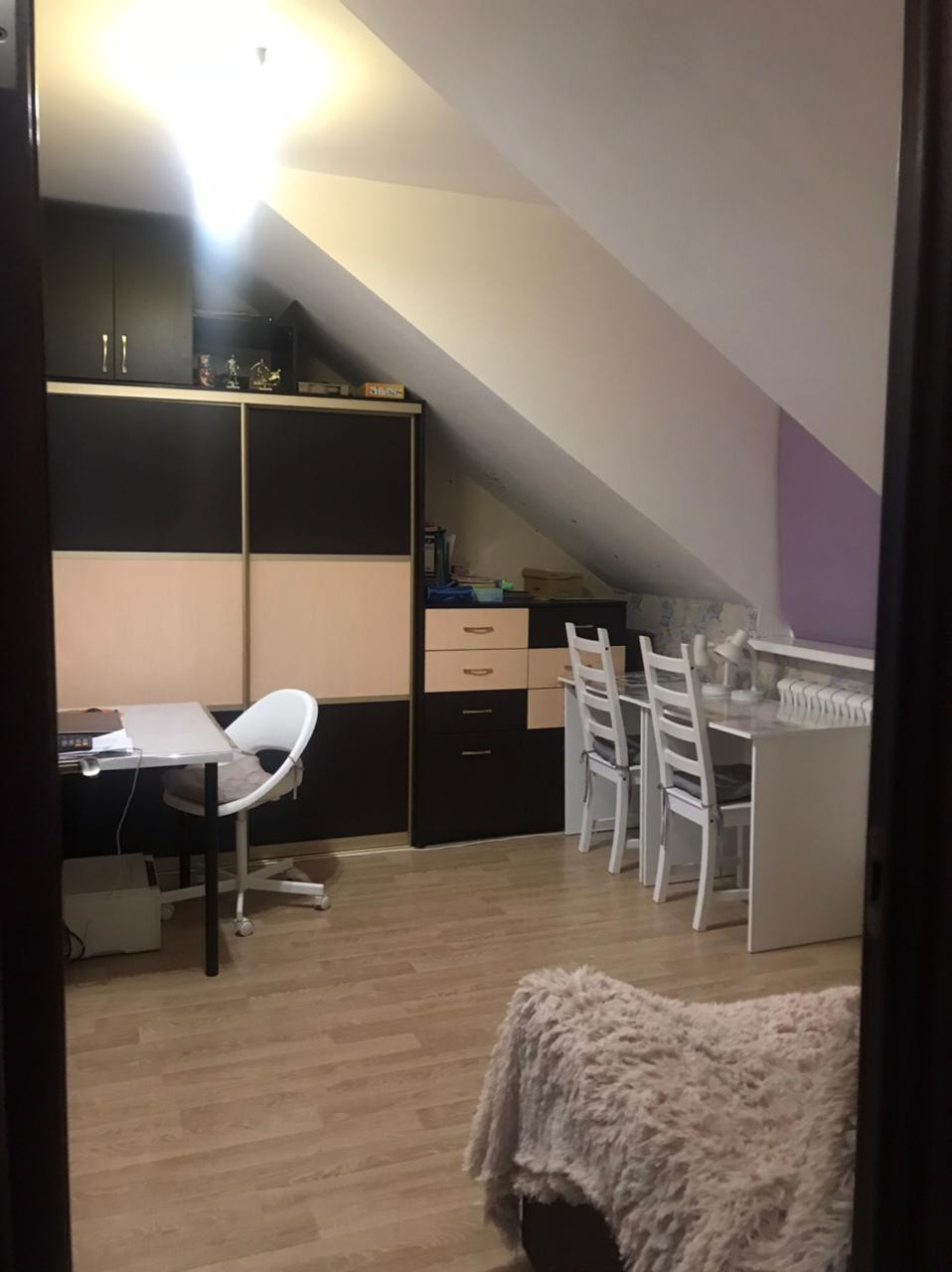 - На первом этаже большая кухня(гостиная), санузел, гардеробная (под лестницей); огромный чердак, на втором этаже 2 спальни.