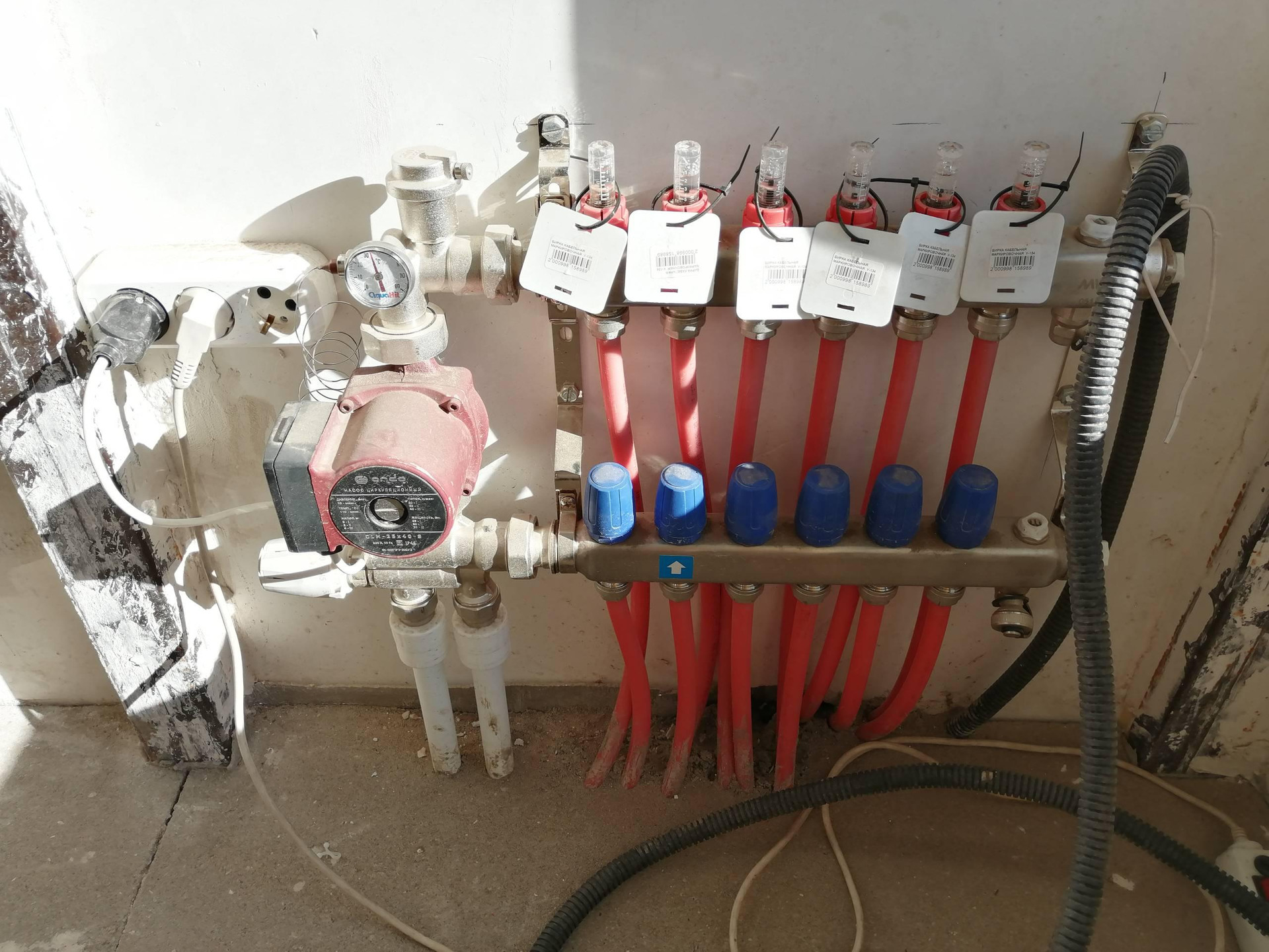 Тёплые водяные полы по всей площади 1-го этажа (за исключением комнаты) + в санузлах 2-го этажа.
