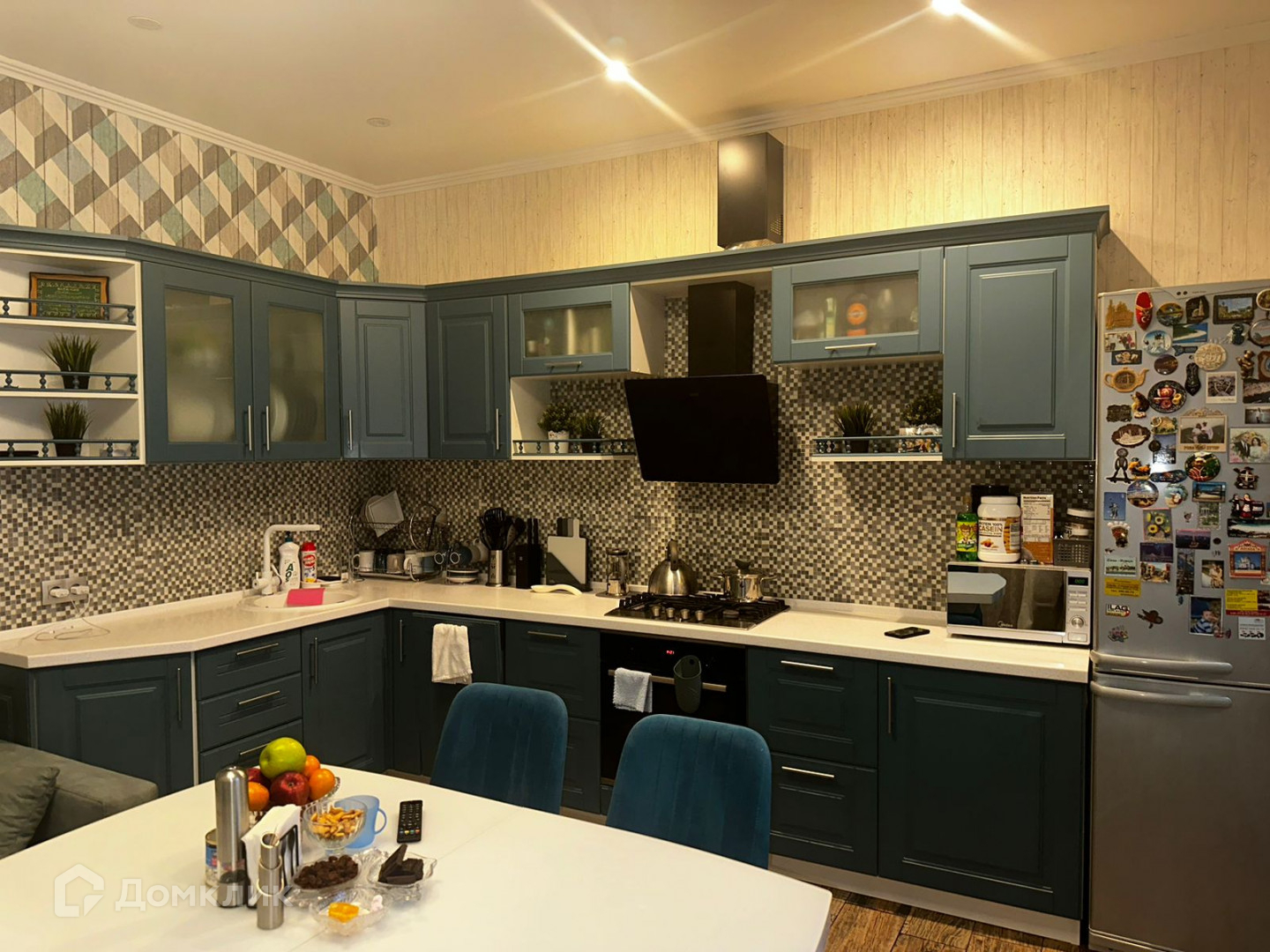 Просторная кухня со встроенным кухонным гарнитуром и техникой.