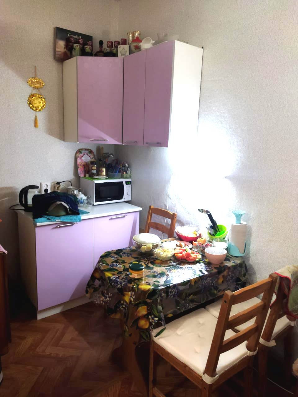 В квартире уютная кухня, на кухне есть своя личная зона, стол и шкафчики для посуды.