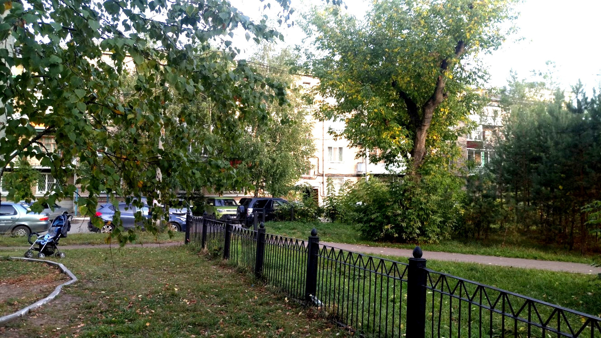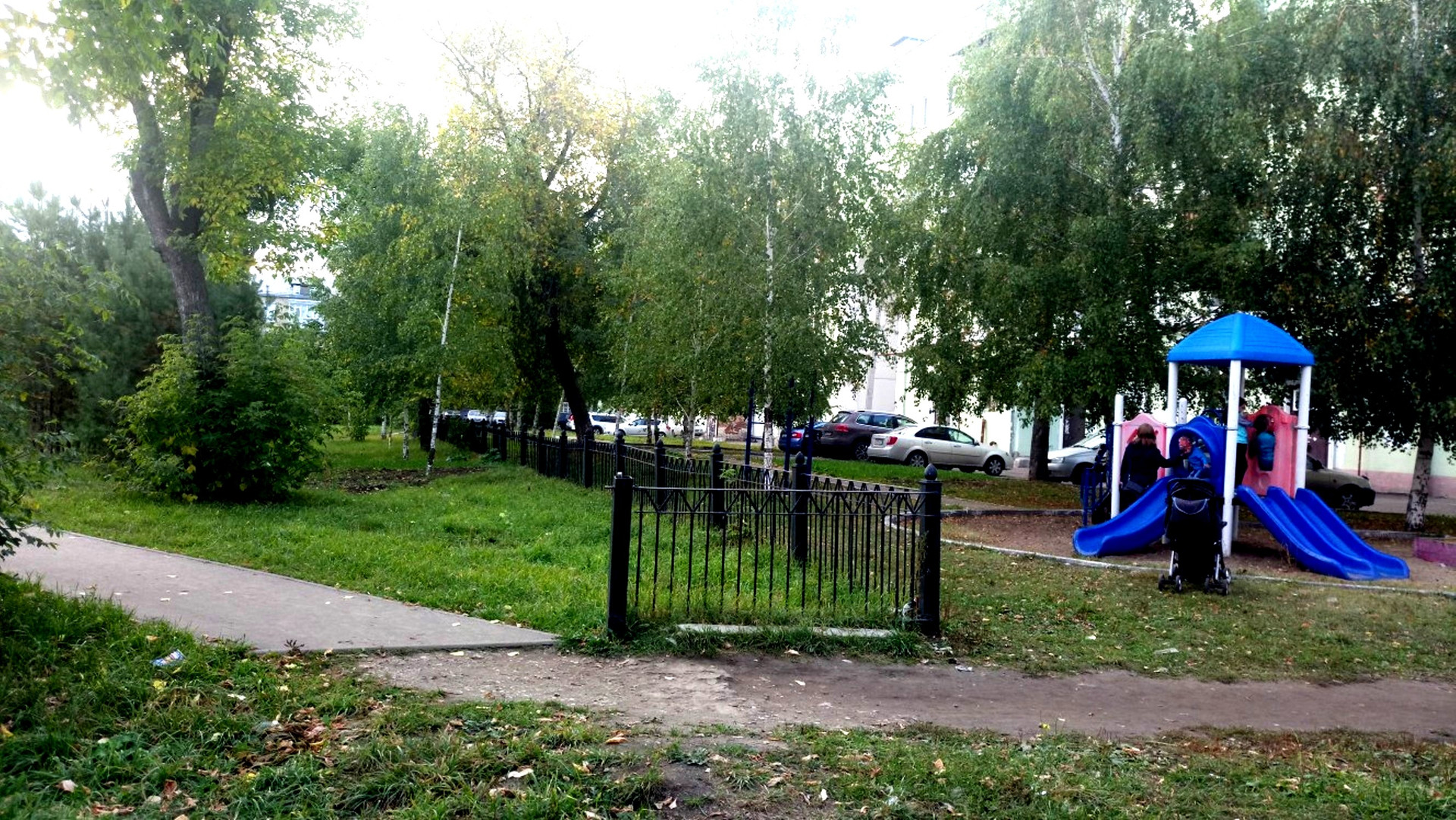 Большой обустроенный двор с оборудованной детской площадкой и местами для отдыха.