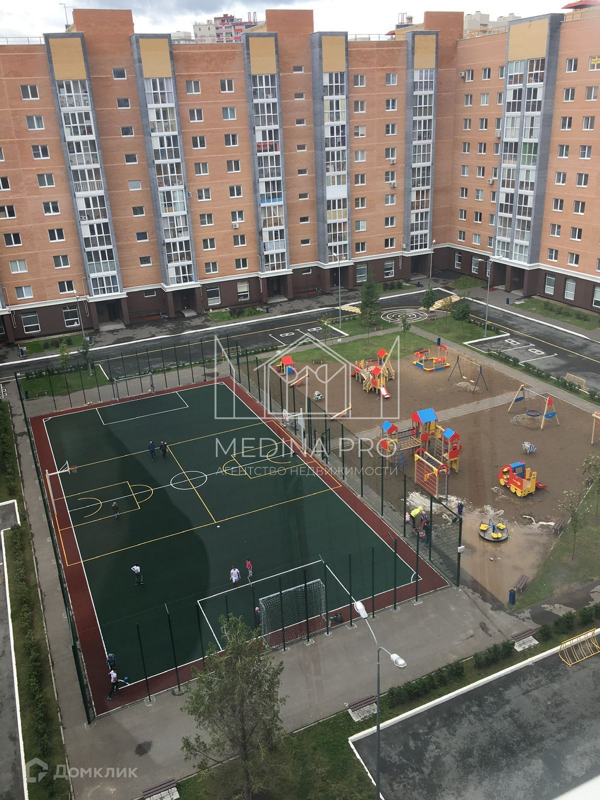Большая парковка, оборудованная детская площадка.