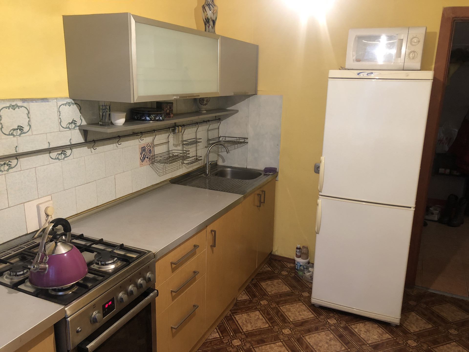 По квартире: на полу линолиум, большая укомплектованная кухня, стол стулья, холодильник, микроволновка, кухонный гарнитур,