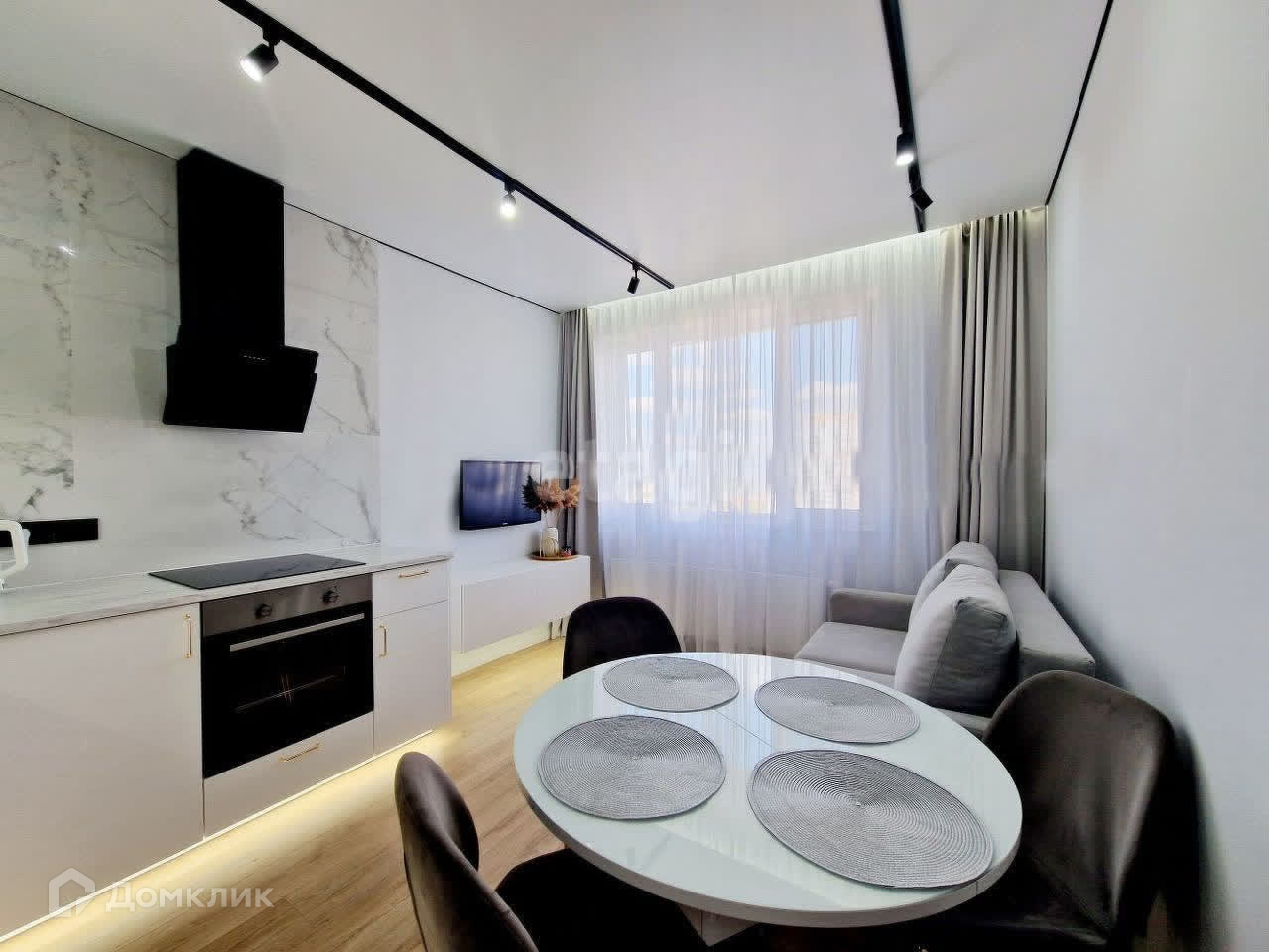 Кухня-гостинная: кухонный гарнитур(со встроенными: холодильником, микроволновкой, индукционной плитой и духовкой), круглый стеклянный стол с раскладным механизмом, 4 велюровых стула, диван с раскладыванием в 2-х позициях и тв с тумбой.