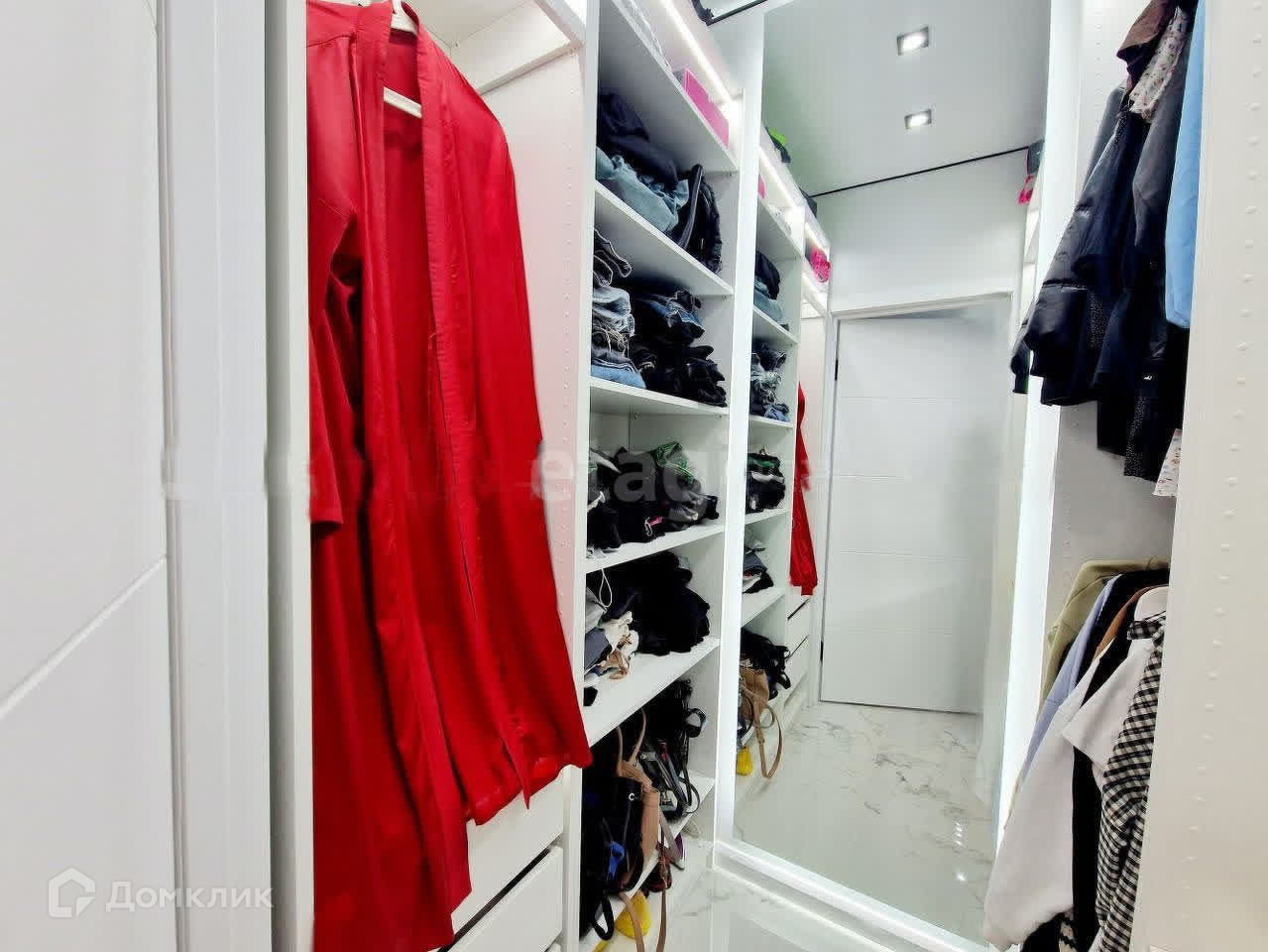 Просторная гардеробная с большим количеством выдвижных и открытых полок, а так же полка со стеклом для бижутерии и аксессуаров, зеркало с подсветкой до потолка.