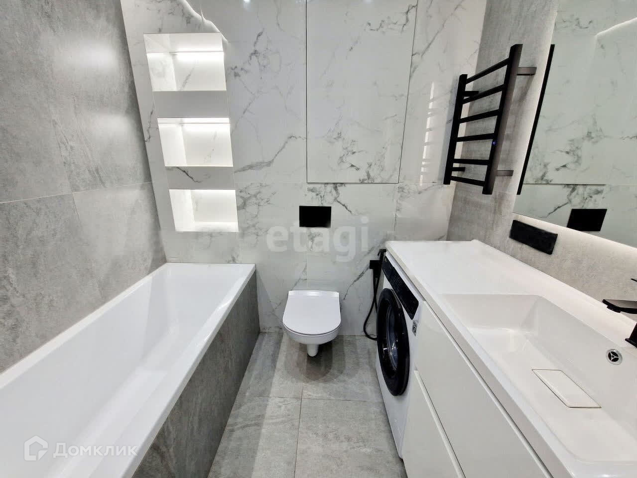 В ванная комната облицована керамогранитом Lараrеt с теплым полом, раковина со встроенной стиральной машиной LG, зеркало с подсветкой и обогревом, акриловая ванна, инсталляция ТЕСЕ, полотенцесушитель, вся сантехника черного цвета производства Италии. За люком скрытого монтажа установлен бойлер Еlесtrоluх на 50 литров.