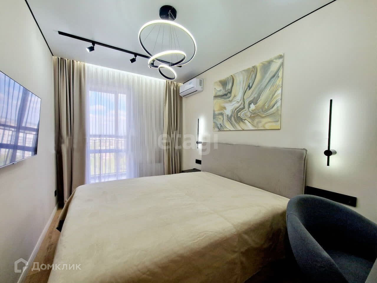 Спальня: мягкая, широкая двухспальная кровать с подъемным механизмом для хранения, прикроватные навесные тумбочки, рабочий стол со стулом, кондиционер и тв Sаmsung.