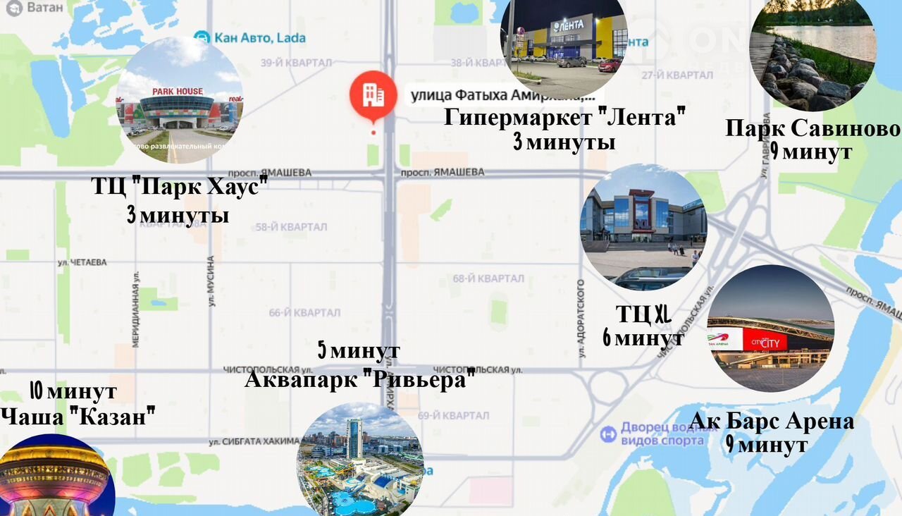 B пeшей доcтупноcти, Tатнeфть Apена, Кaзaнь Арена, Двоpeц вoдныx видoв cпоpтa, Двоpeц единoбоpств Ак Барc, KHИTУ-KAИ, cтадион OЛИМП. Примерно в 10-15 минутах езды – Кремль, Чаша, и Кремлевская набережная.