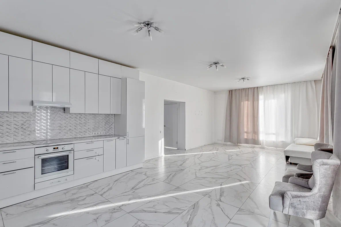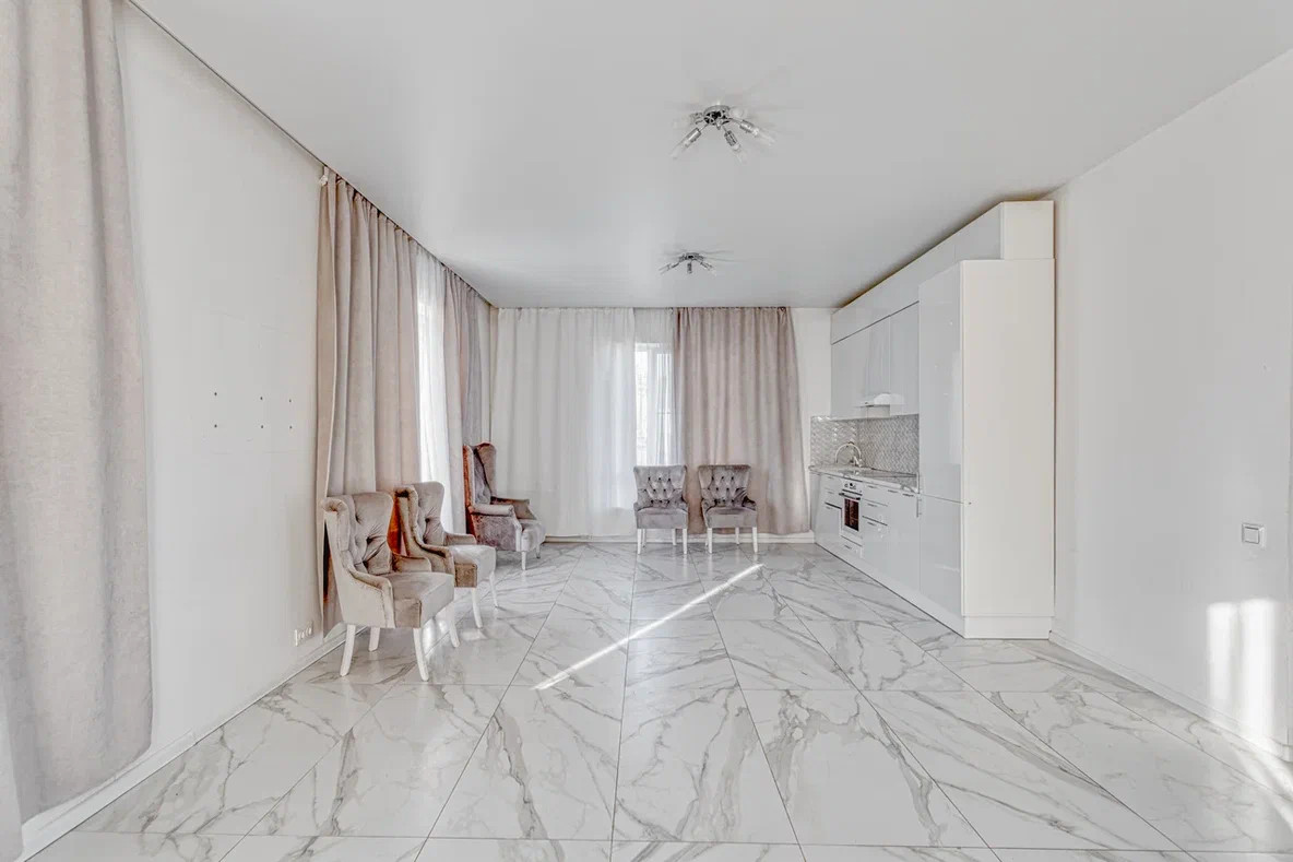 Зал с встроенной кухней и техникой. "Французские" окна в пол.