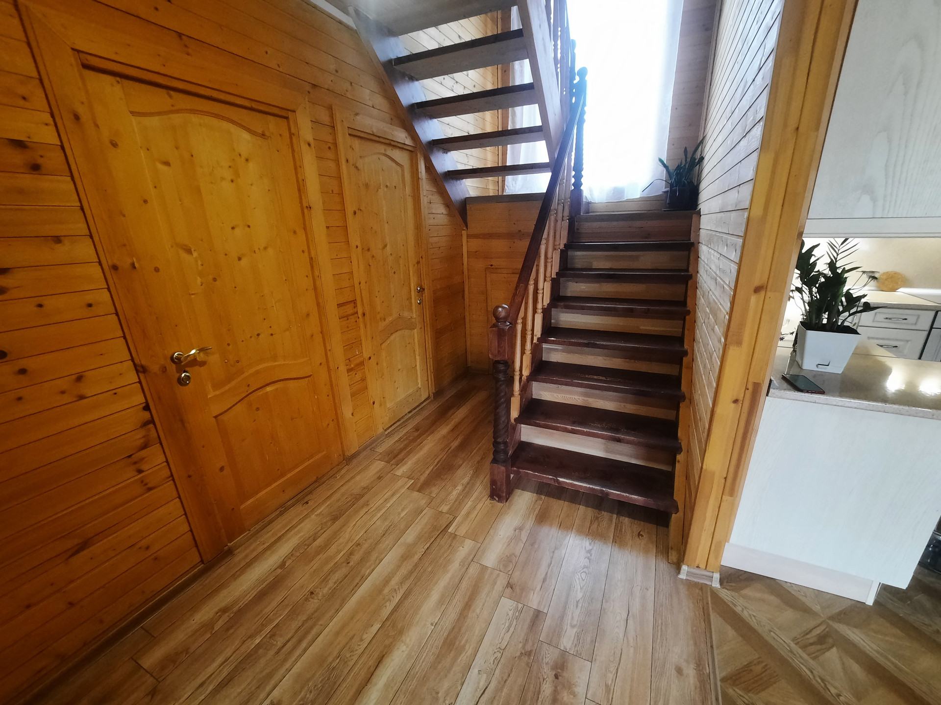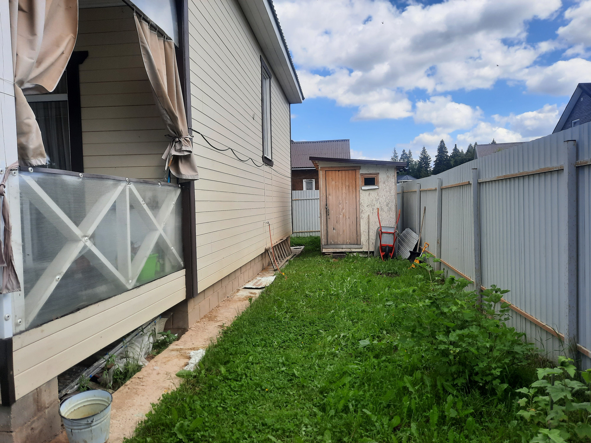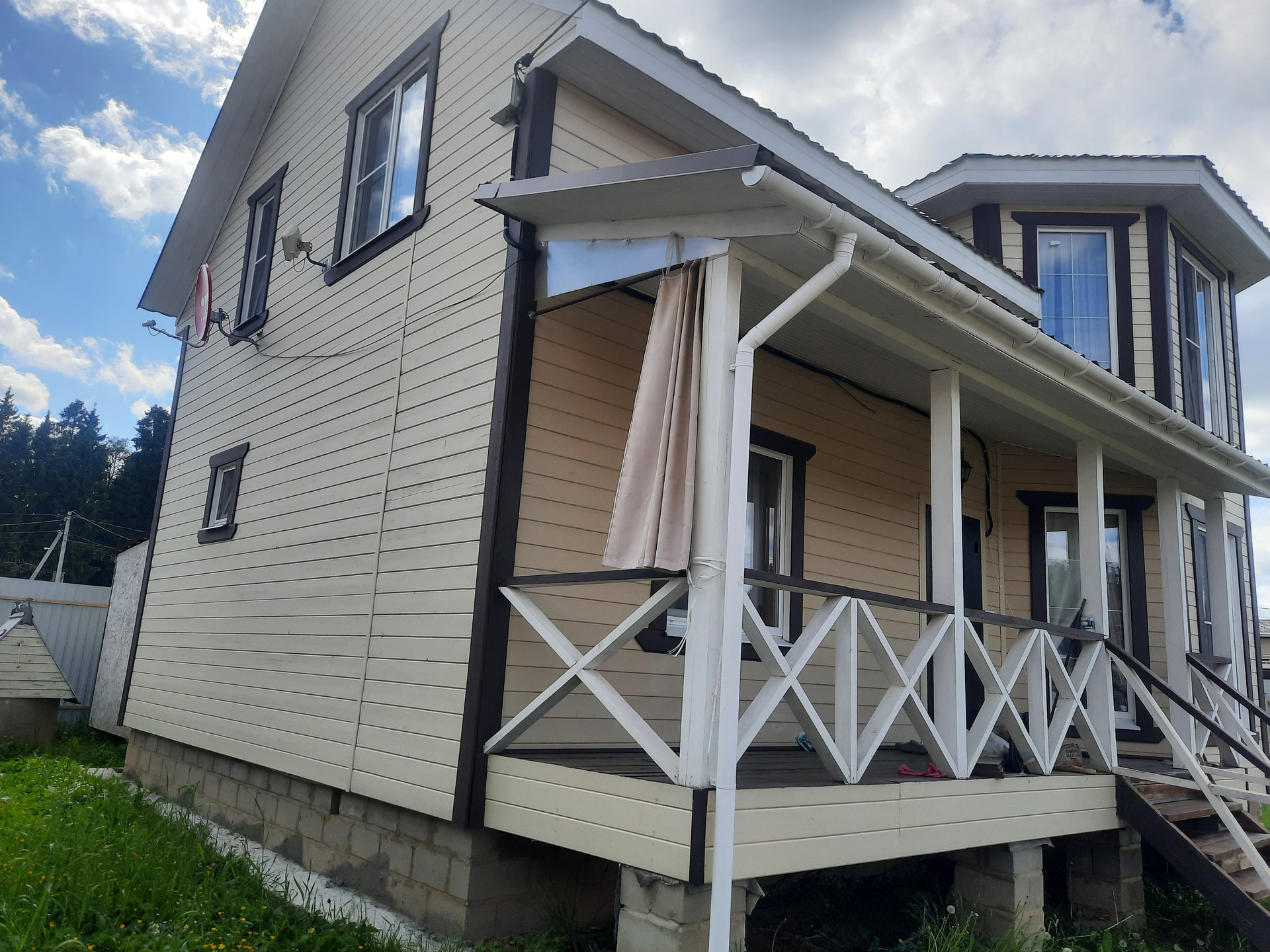 Армированный и бетонированный заезд и парковка.  Первый этаж дома: терраса -2, прихожий, коридор, подсобка, гостевая спальня, кухня-гостиная и санузел. Второй этаж: 3 спальни и санузел.