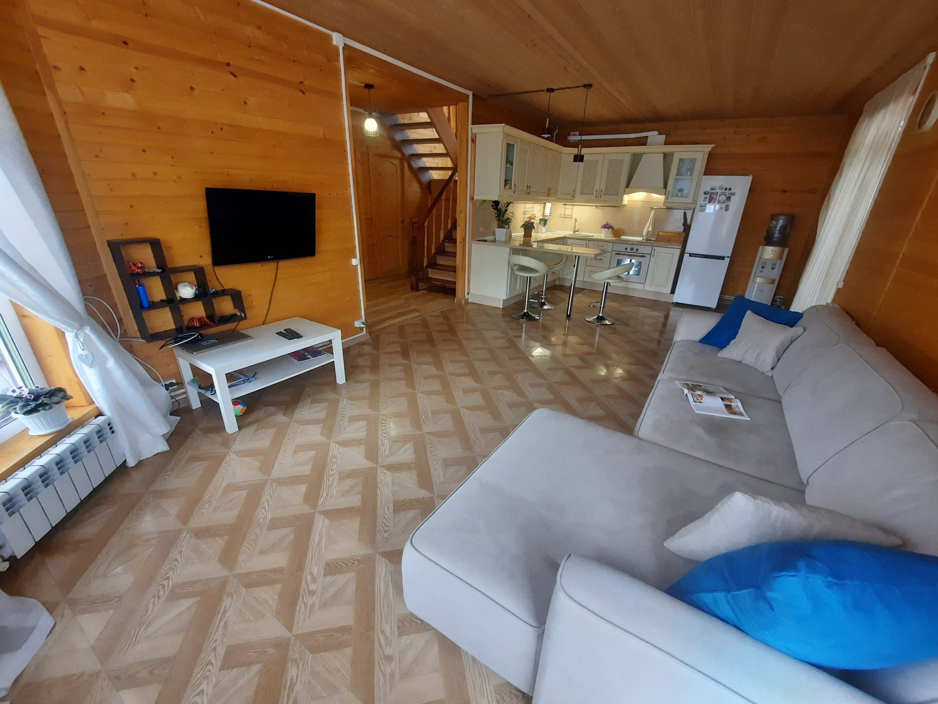 Вода – колодец 18 колец + скважина 59 м. Электричество 15 квт, двухтарифный счетчик, деревенский тариф. Канализация – септик «Топас   Евролос», отопление – электрокотел. Заведён  высокоскоростной   безлимитный интернет и спутниковый ТВ.   Дом продается с мебелью и  техникой, заходи и живи. Постоянная прописка есть.