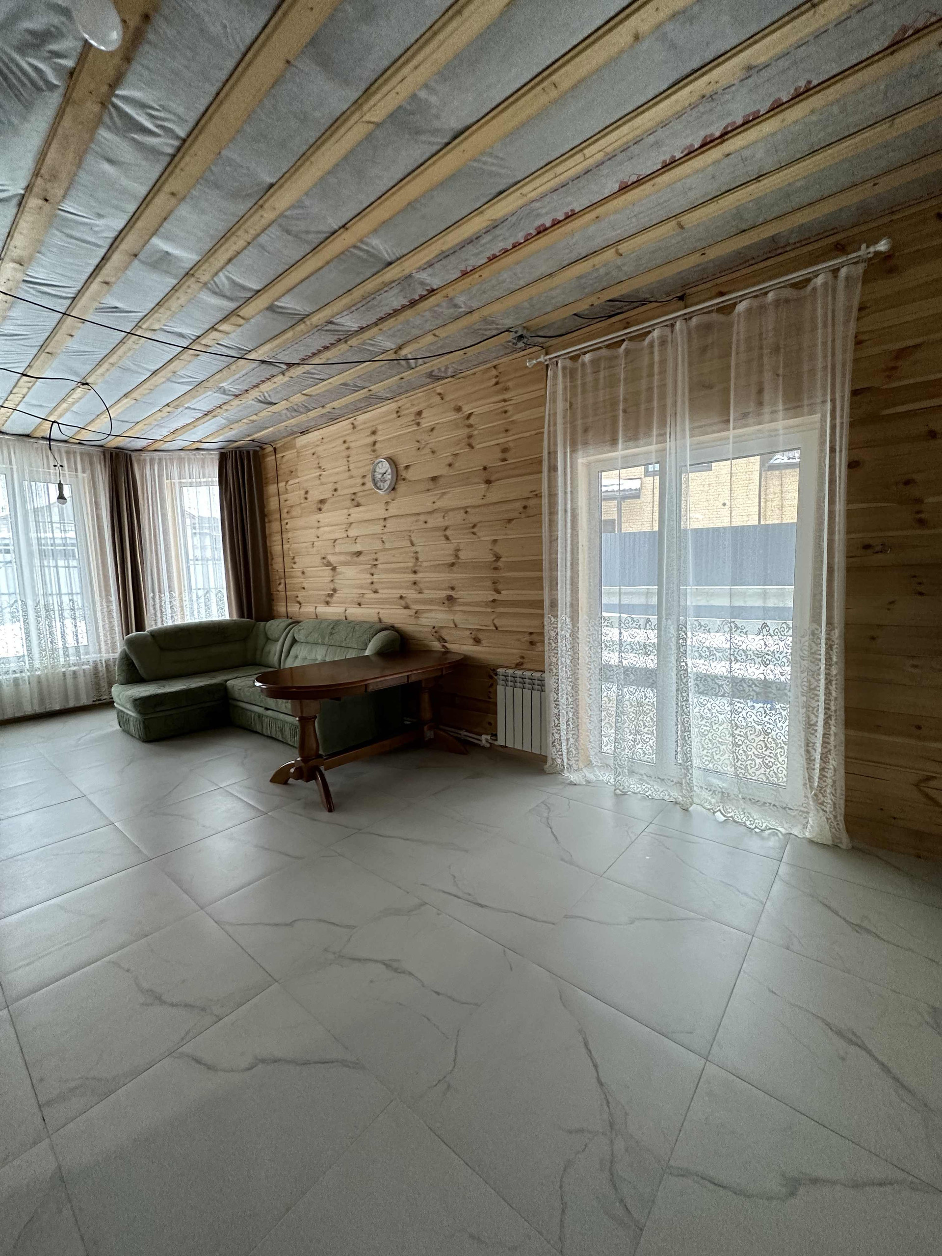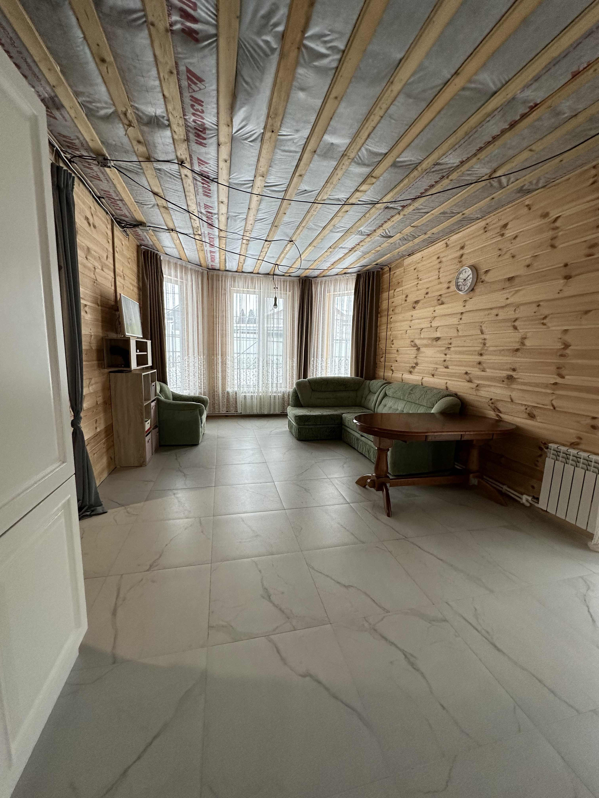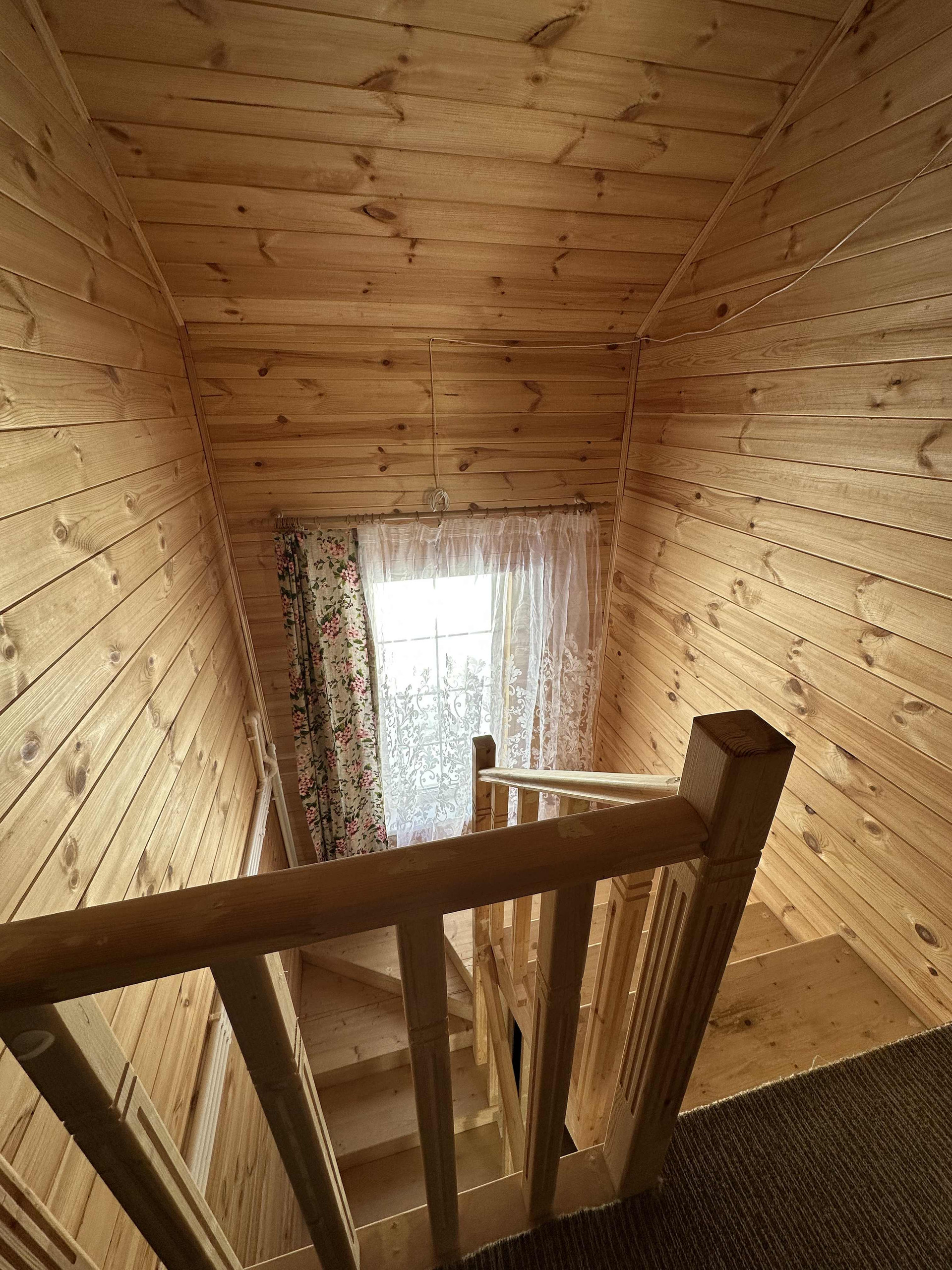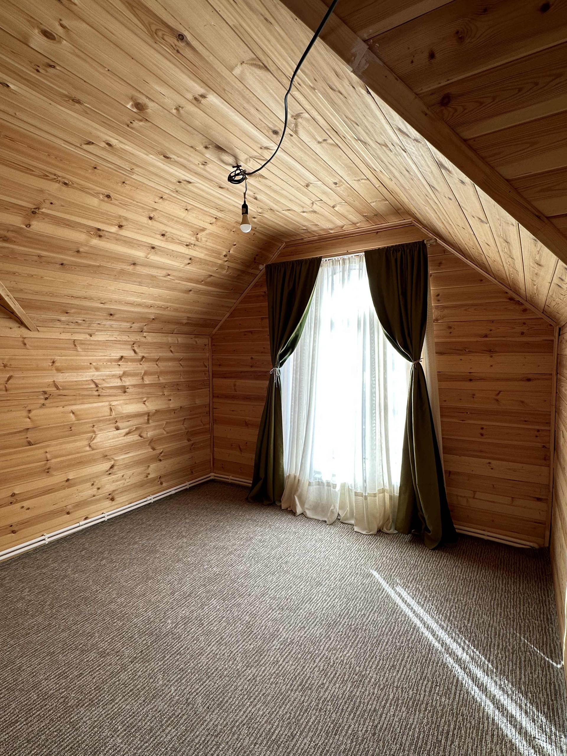 На втором этаже 3 спальни и с/у, гардеробная, кладовка. За счет высоких потолков и больших окон дом наполнен огромным количеством света. Стены и потолки отделаны имитацией бруса.