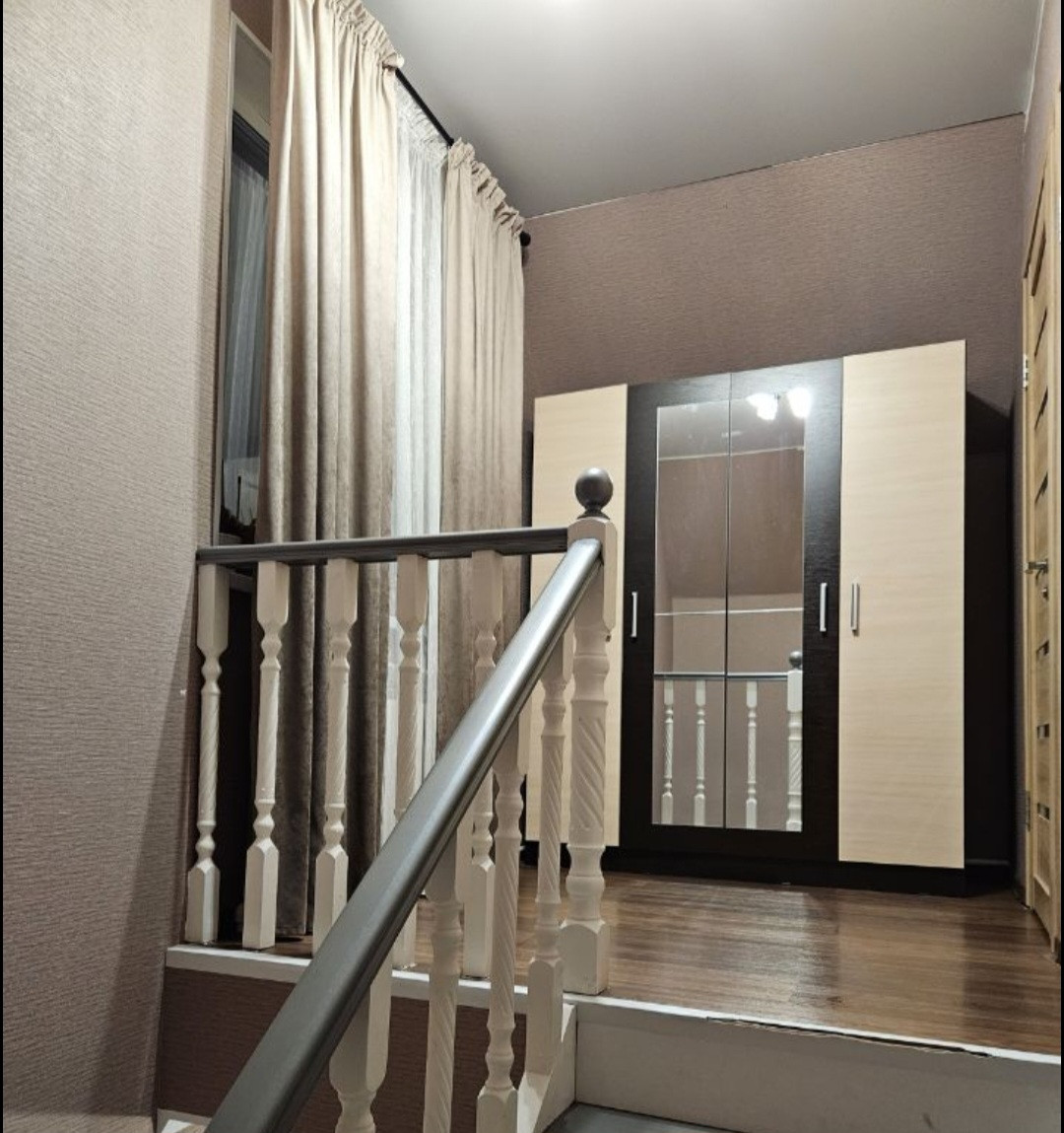 В доме два этажа: на первом этаже расположена кухня-гостиная, ванная, туалет, котельная и прихожая; на втором этаже расположены две спальни и зона лестницы. Во всем доме поклеяны обои, нет эффекта вагонки.
