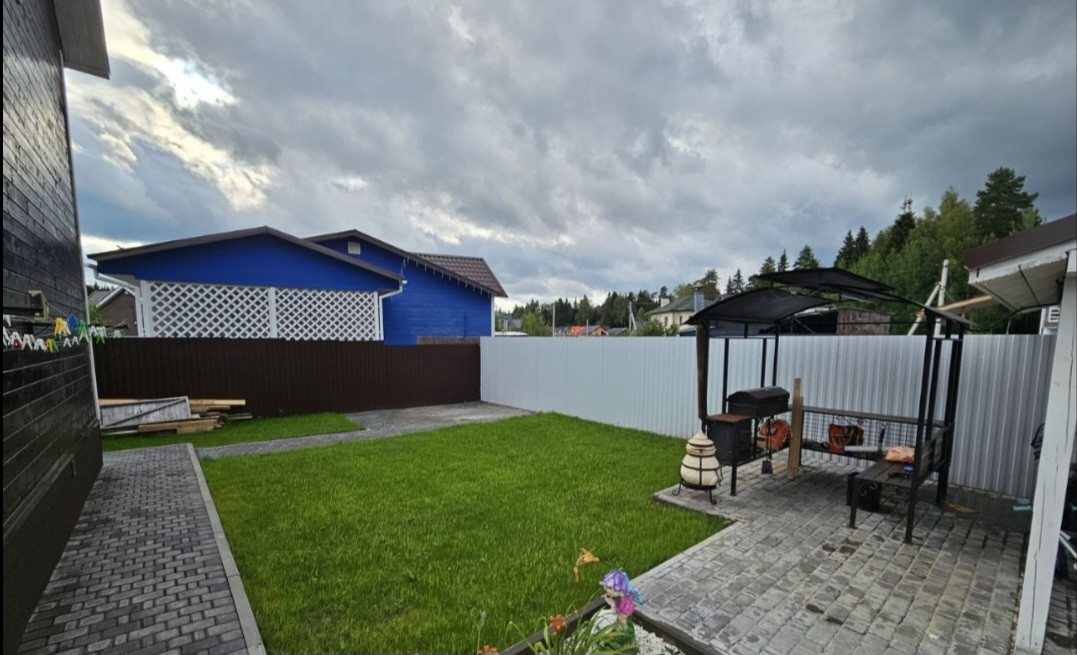 Продаём уютный дом в тихом посёлке для круглогодичного проживания. Двор обустроен, брусчатка; беседка 4×6; мангальная зона с мангалом, барбекю, печкой; вместительная бытовка 14квм; откатные ворота на автоматике; площадка под собаку 16квм; септик; скважина. В бытовке, беседке и в зоне мангала проведено электричество и свет.