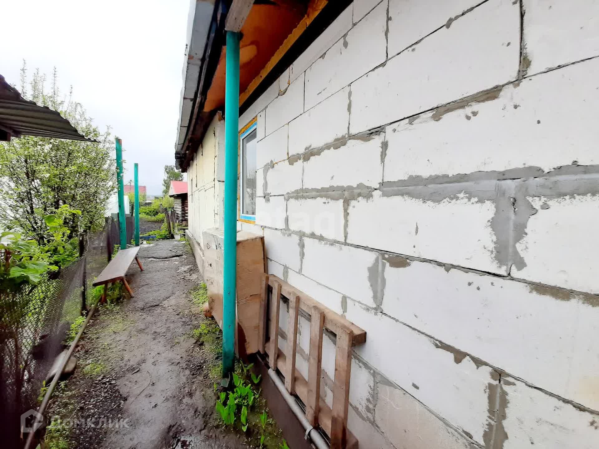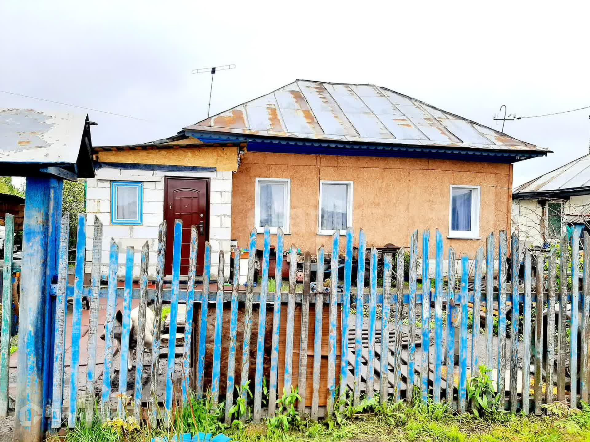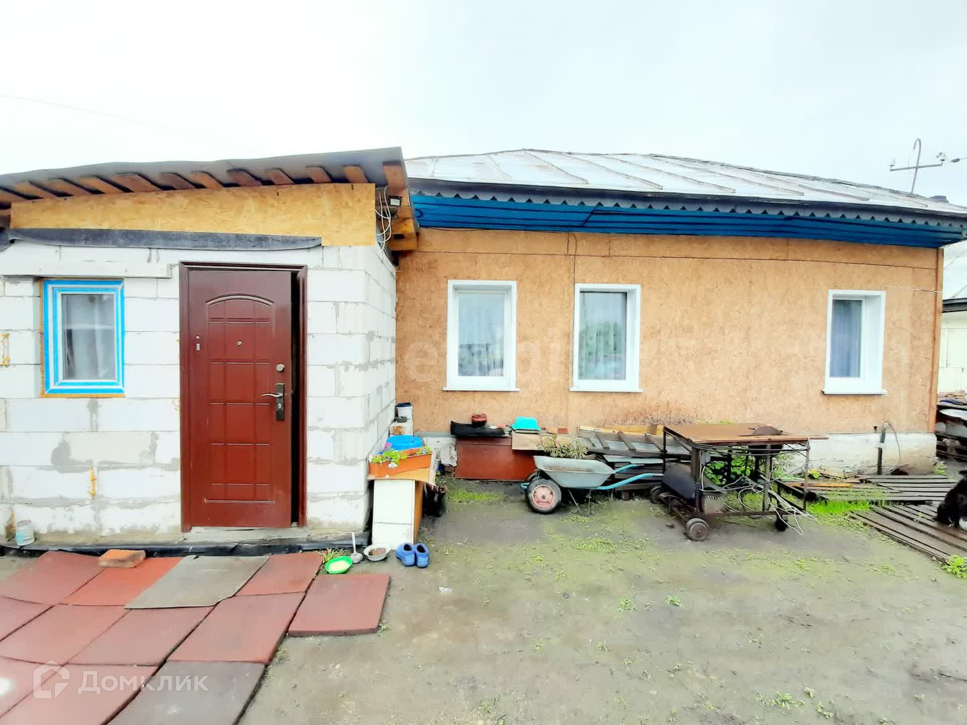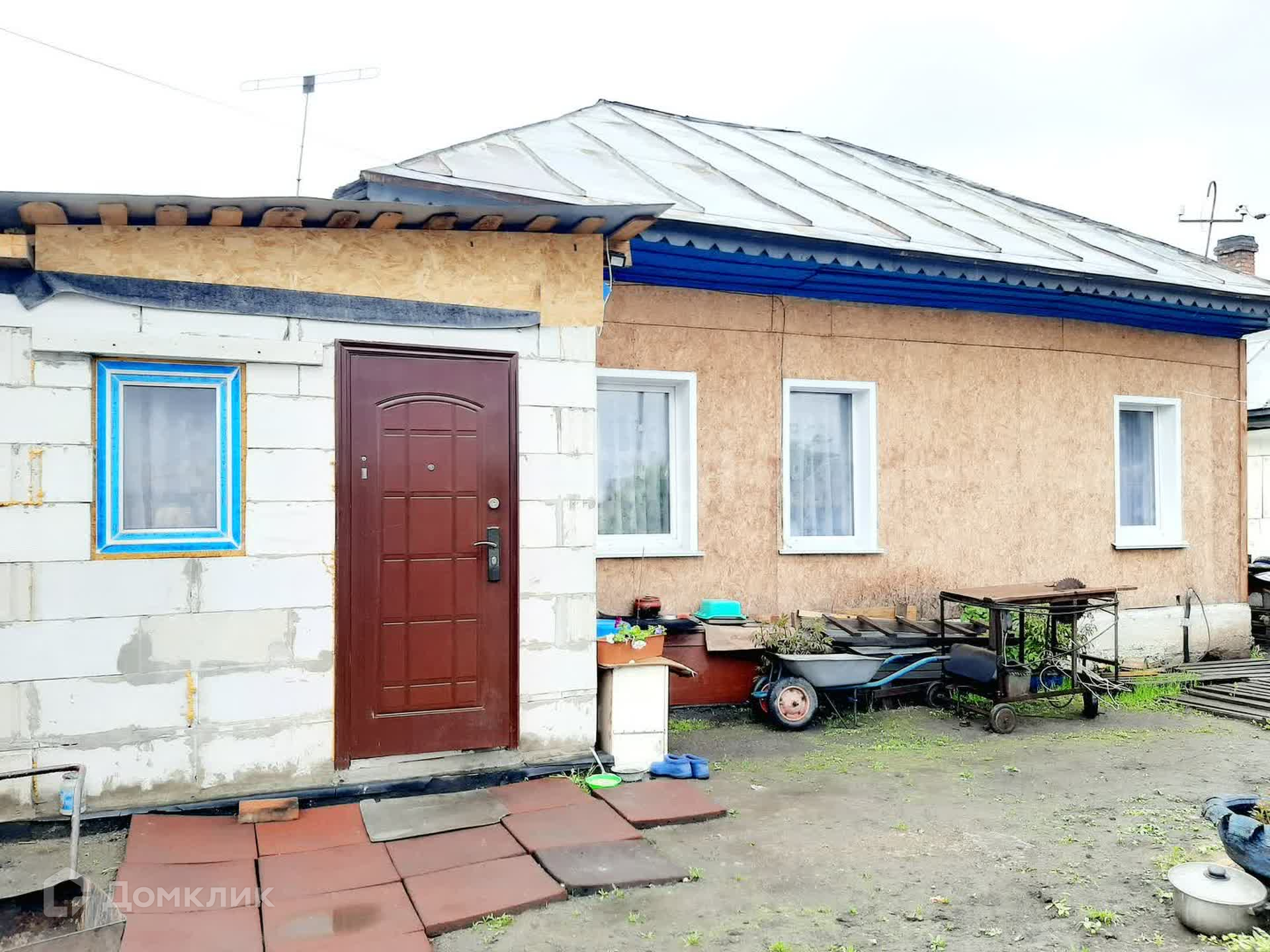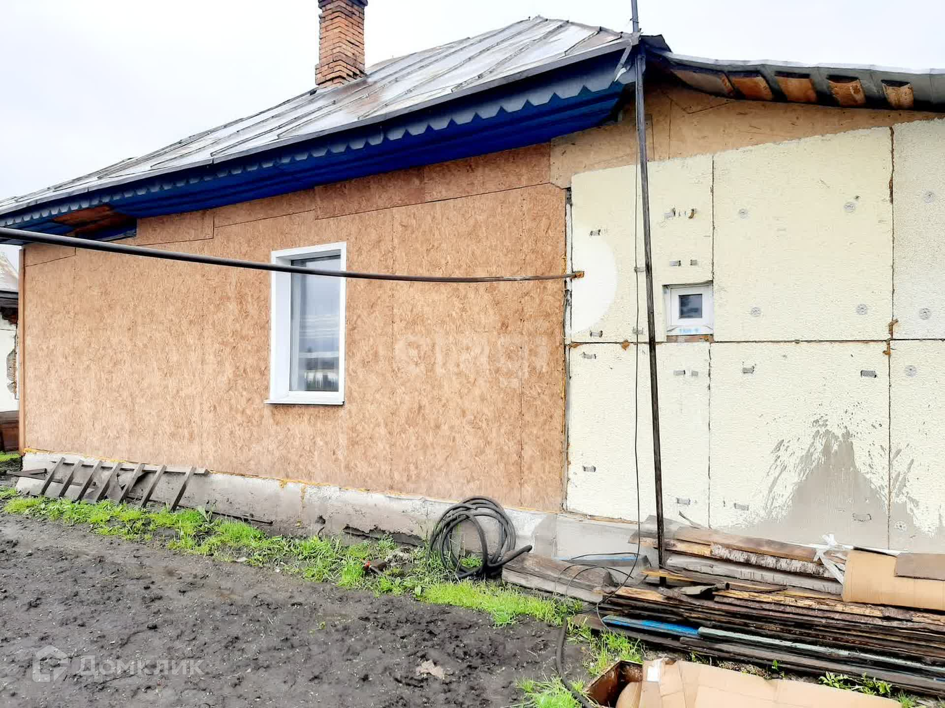 Материал стен дома- бревно. Фасад оформлен плитой OSB c минераловатным утеплением и ветровлагозащитной плёнкой. Кровля- металл.