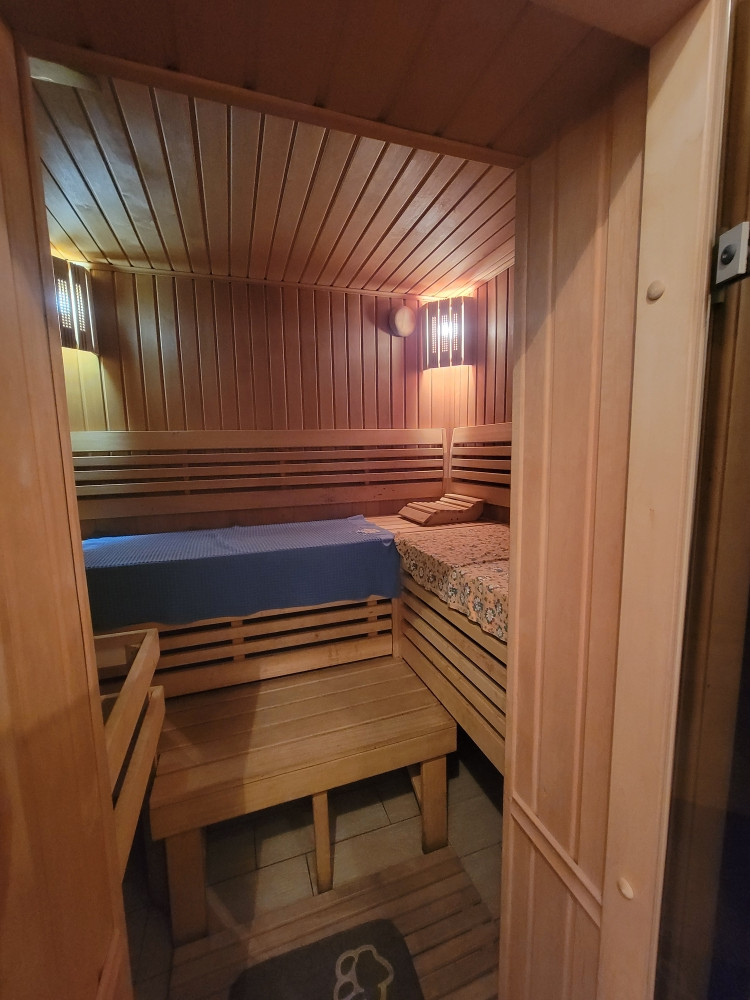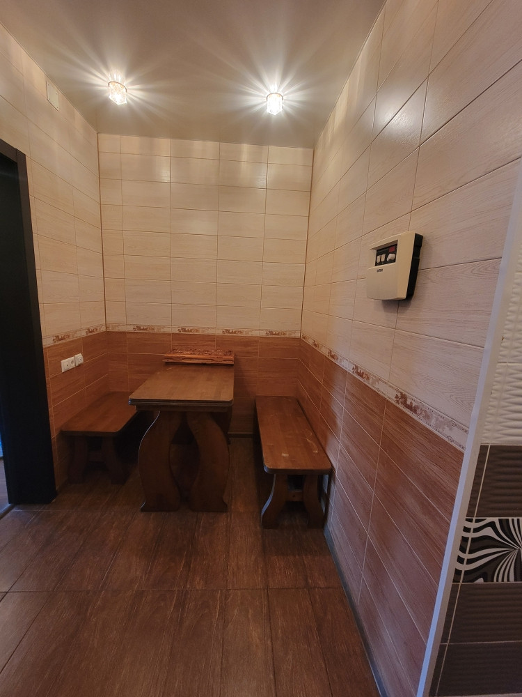 На первом этаже: большой холл, кухня-гостиная, кабинет и спальня, комната отдыха с душевой и сауной, туалет. Внутренняя отделка выполнена в современном стиле в теплой бежевой гамме, сауна обшита древесиной элитных пород. Стены и пол душевой, туалета и комнаты отдыха облицованы кафелем.