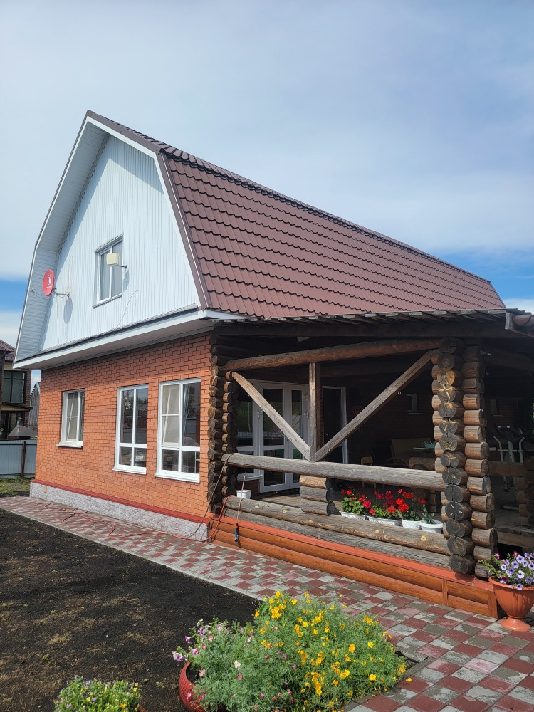 Фасад коттеджа облицован декоративным кирпичом, крыша - из металлочерепицы.