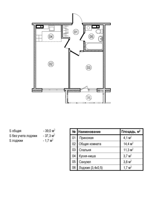 Общая площадь 39 м2