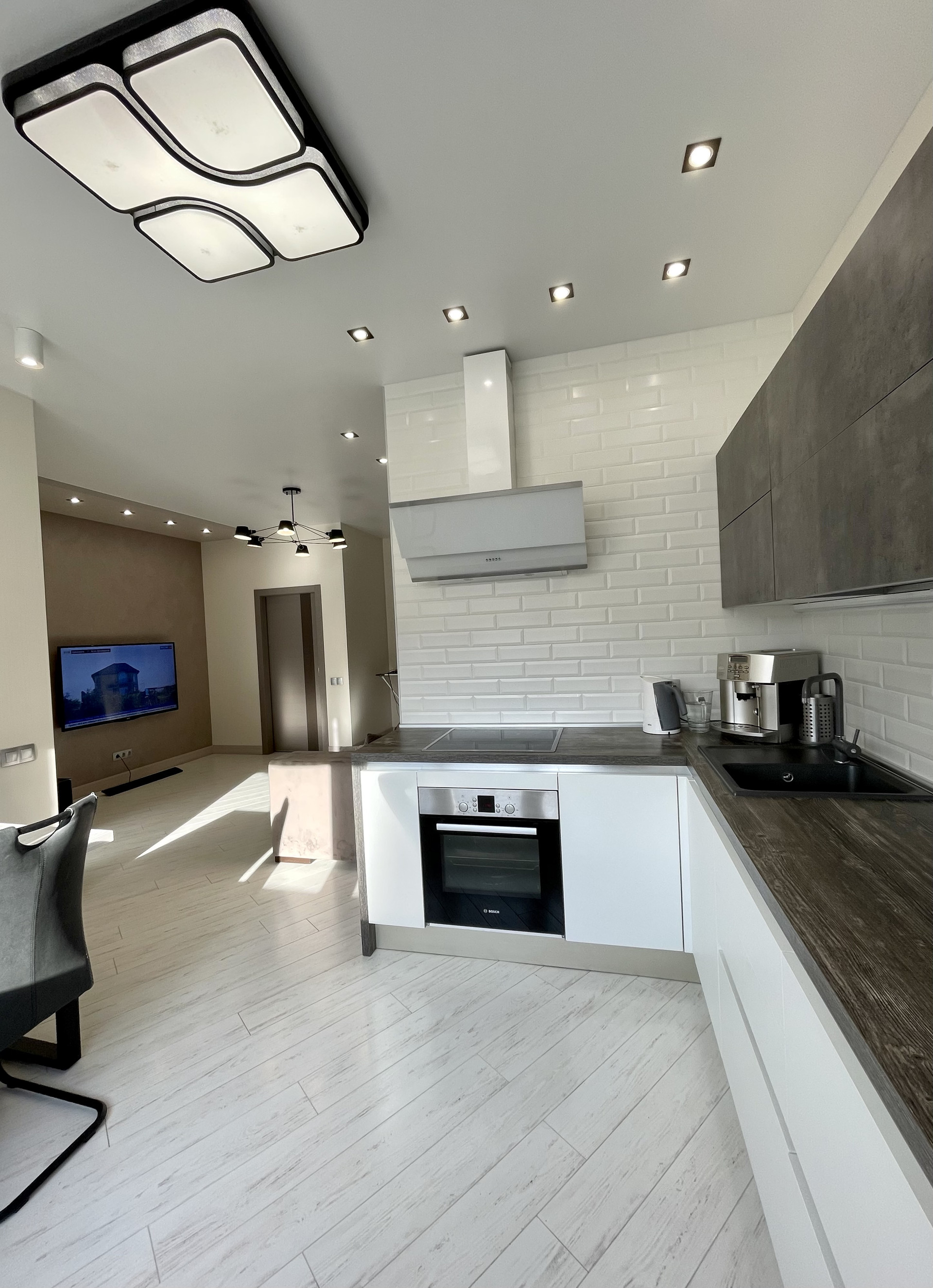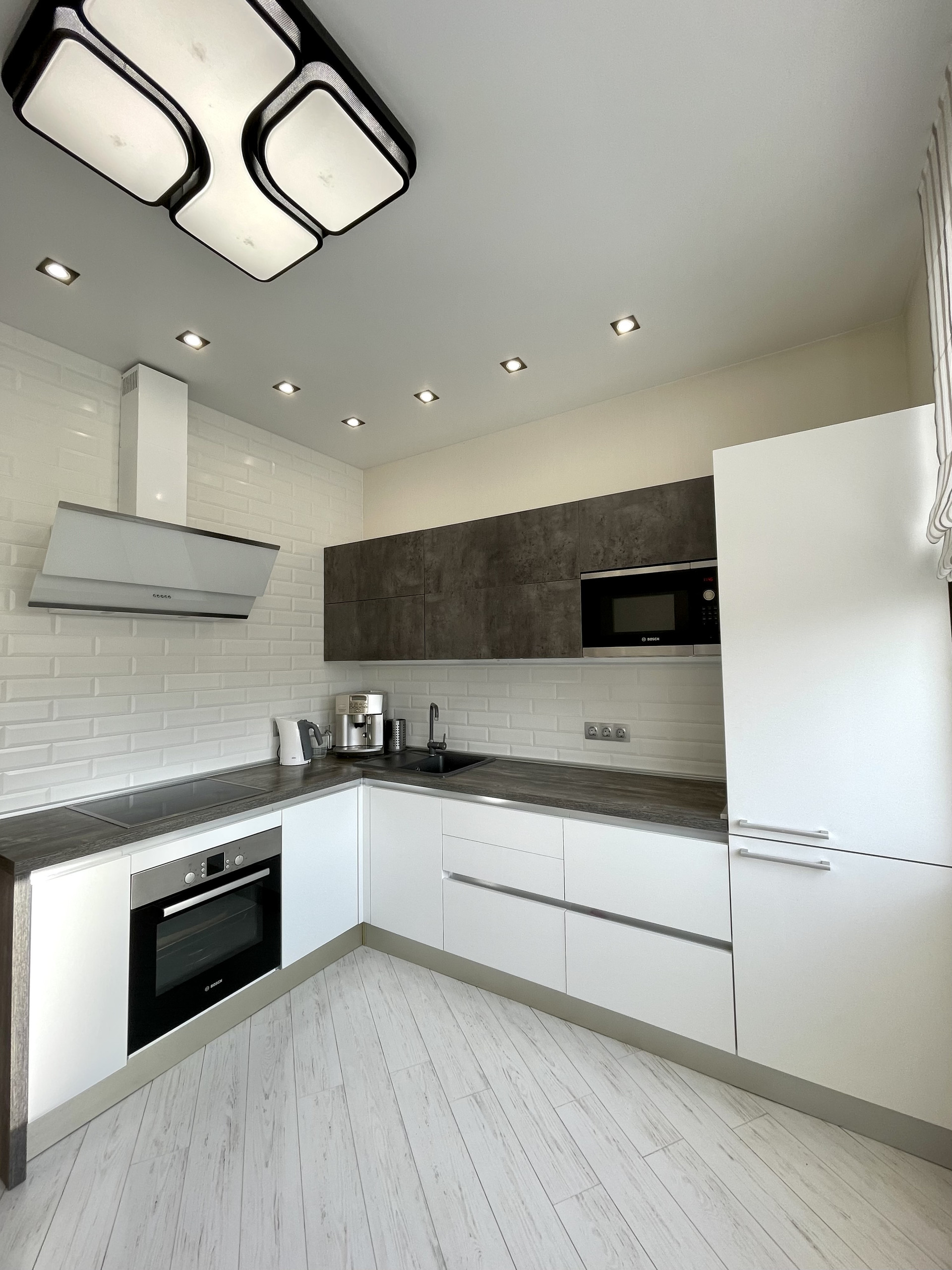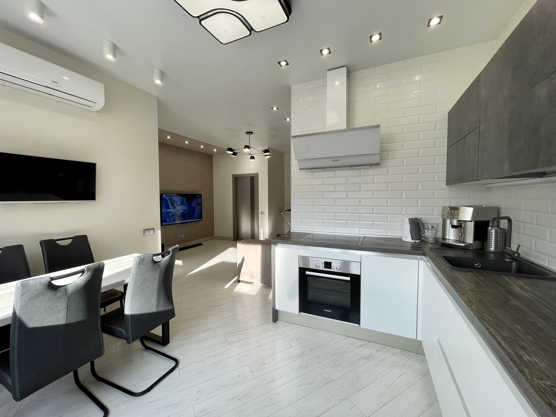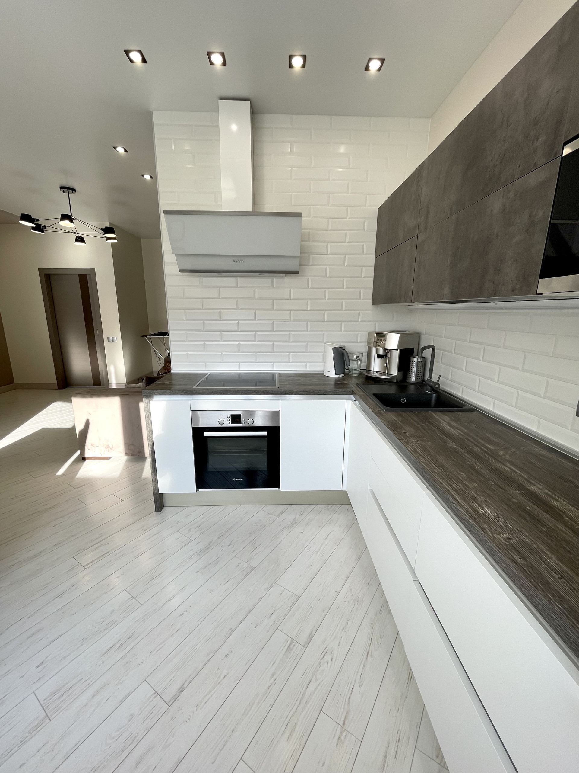 Кухня оснащена фирменной немецкой встроенной техникой (посудомоечная машина, СВЧ печь, варочная панель, вытяжка, духовой шкаф, холодильник). Обеднена зона Lorena.