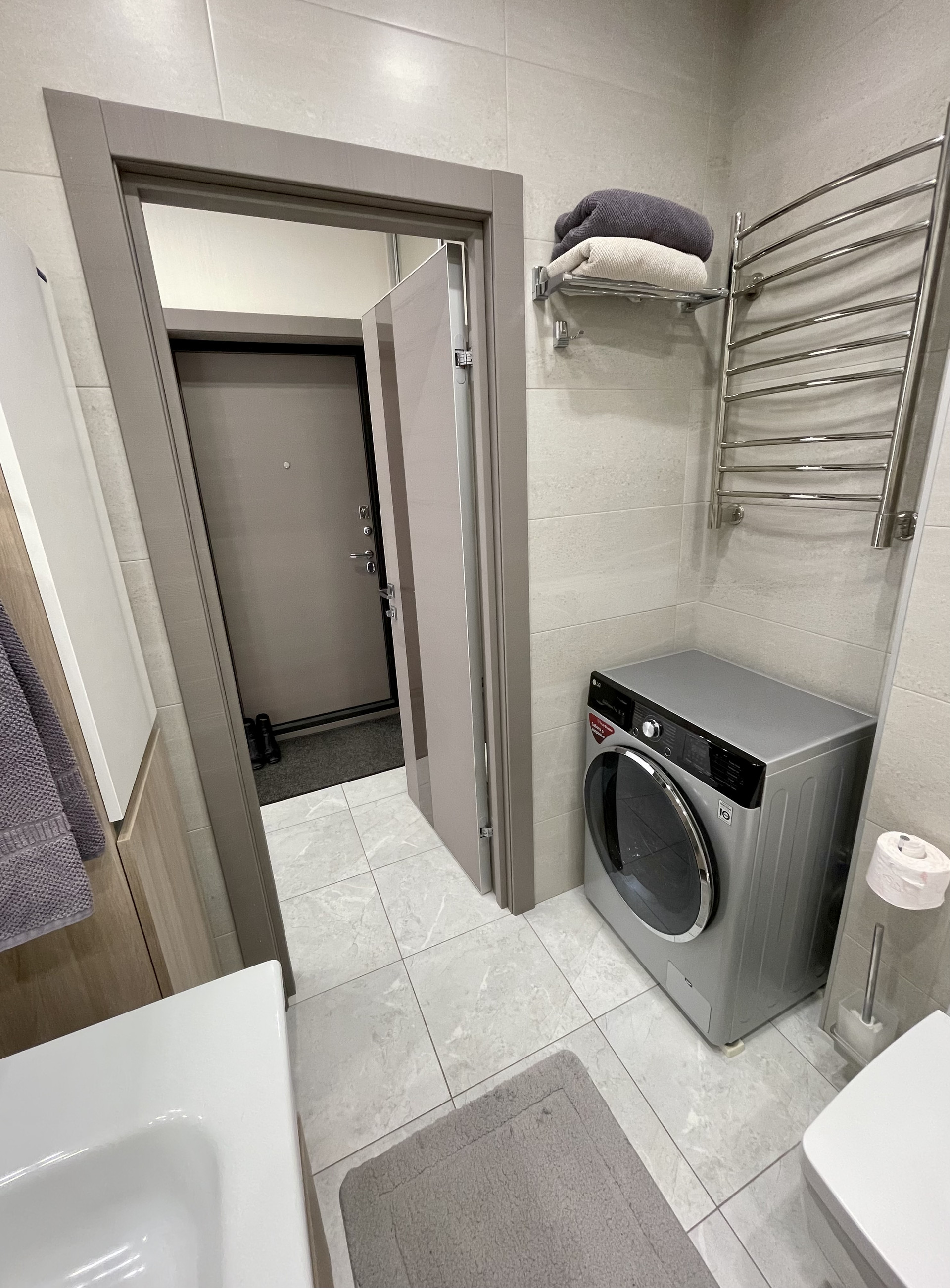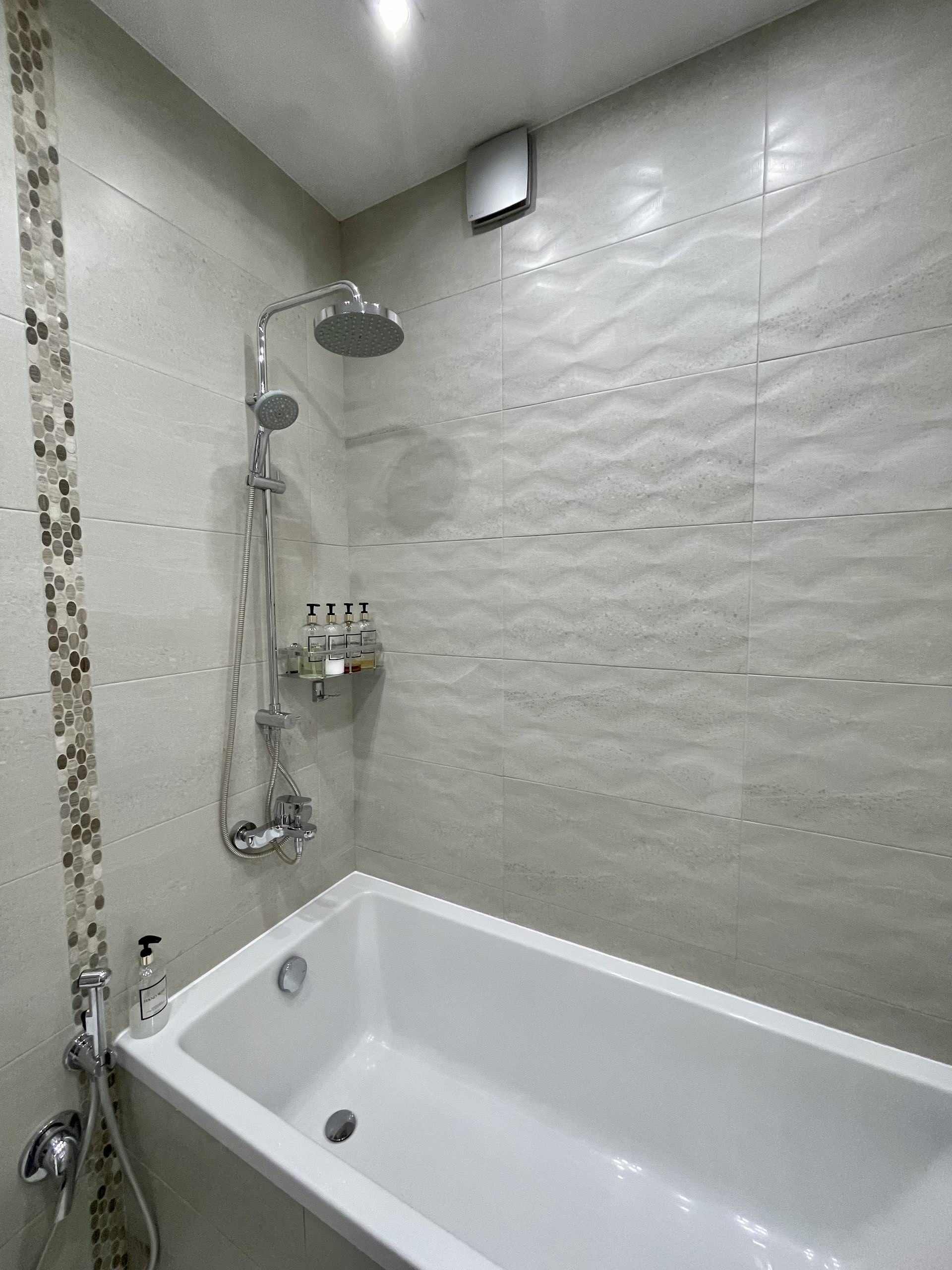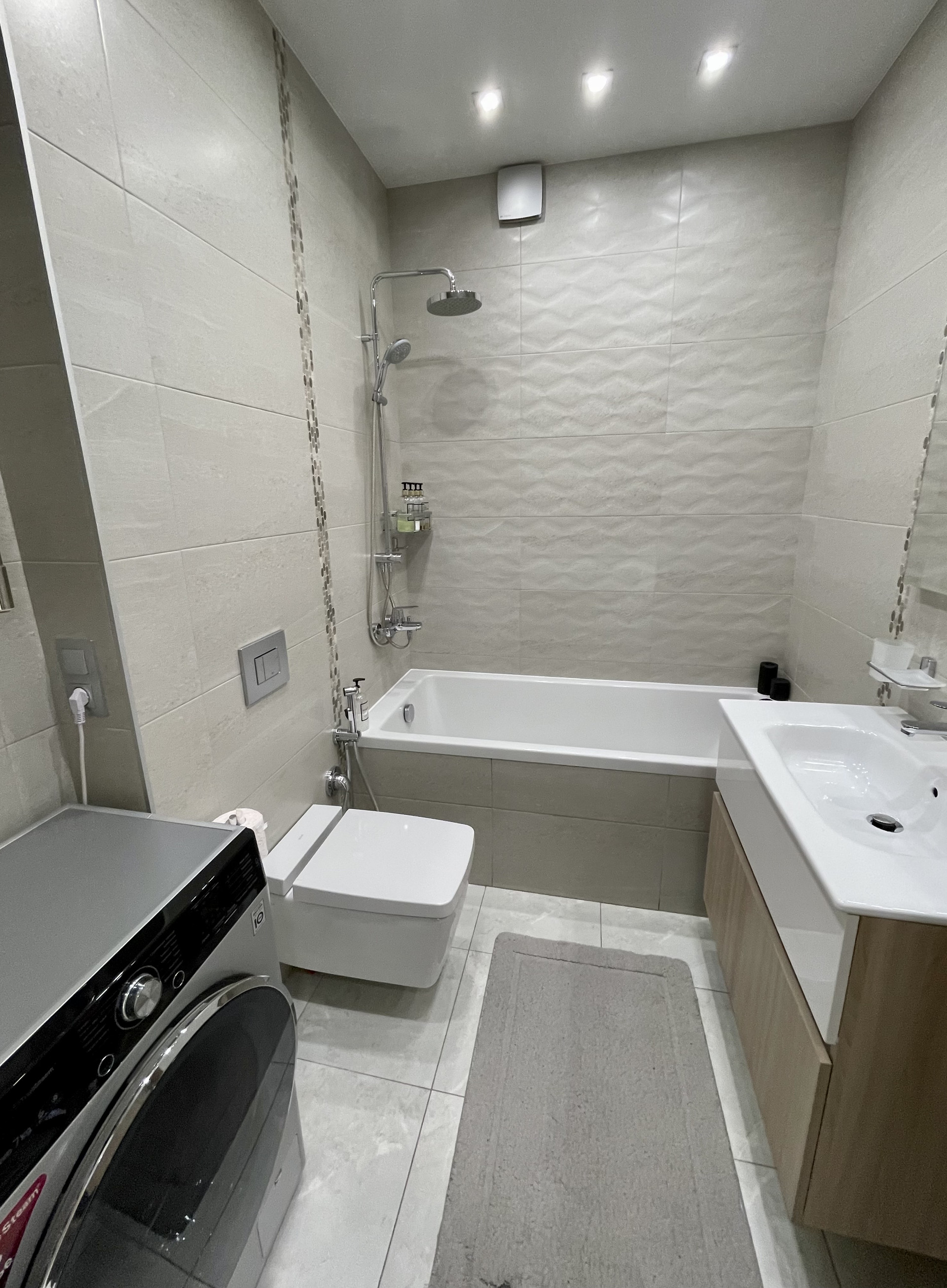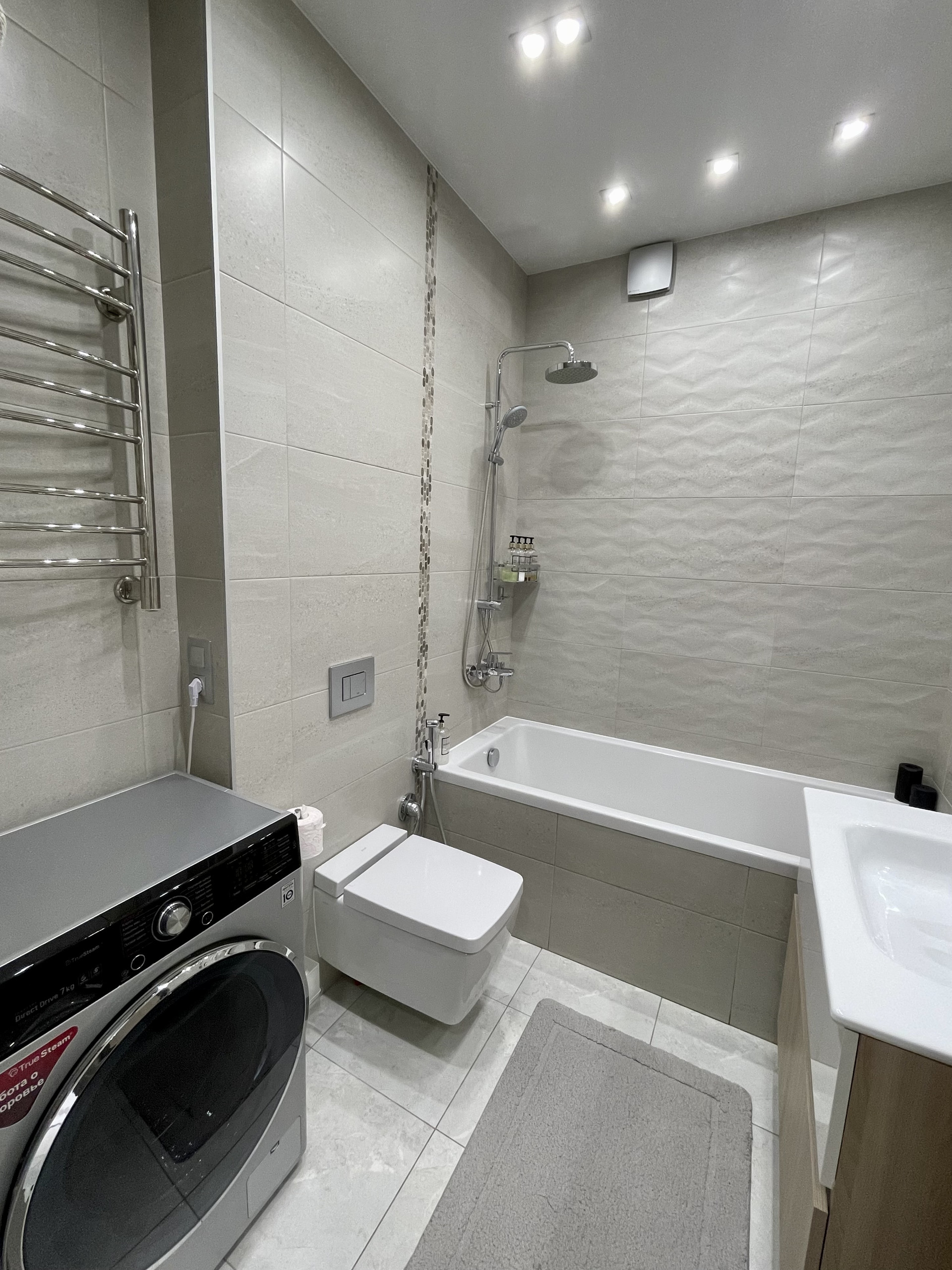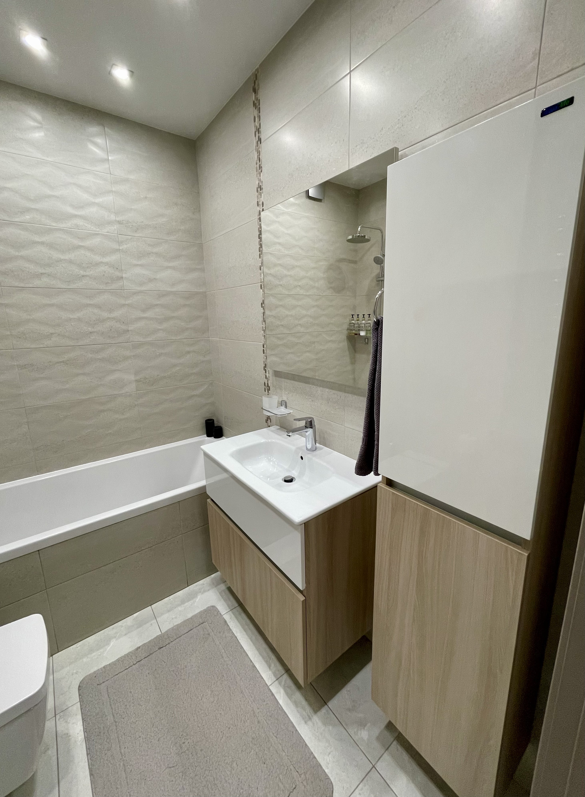 Сан техника, смесители фирм Grohe и Vitra. Бойлер удачно расположен на самом верху шкафа, за счёт этого нет нагромождения в ванной. Имеется гигиенический душ.
