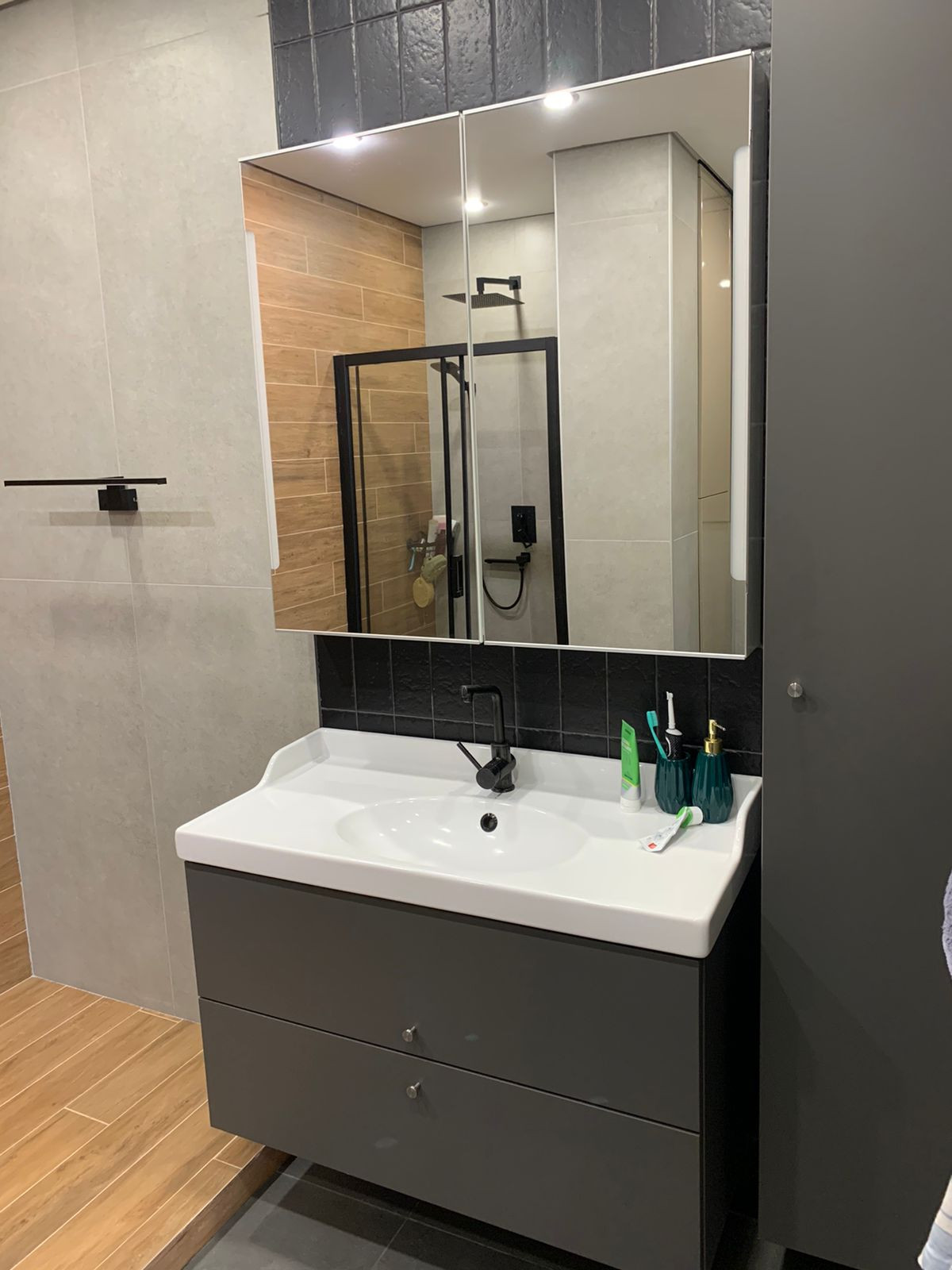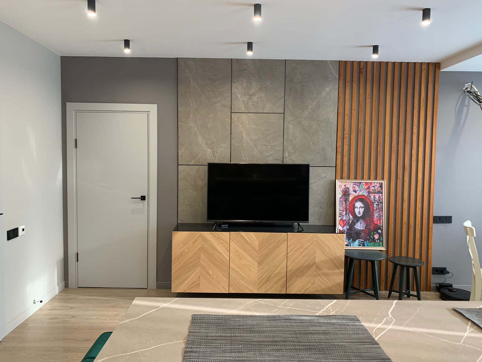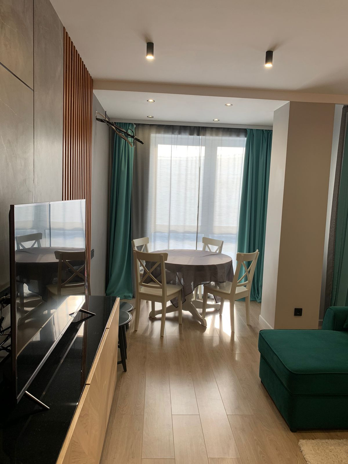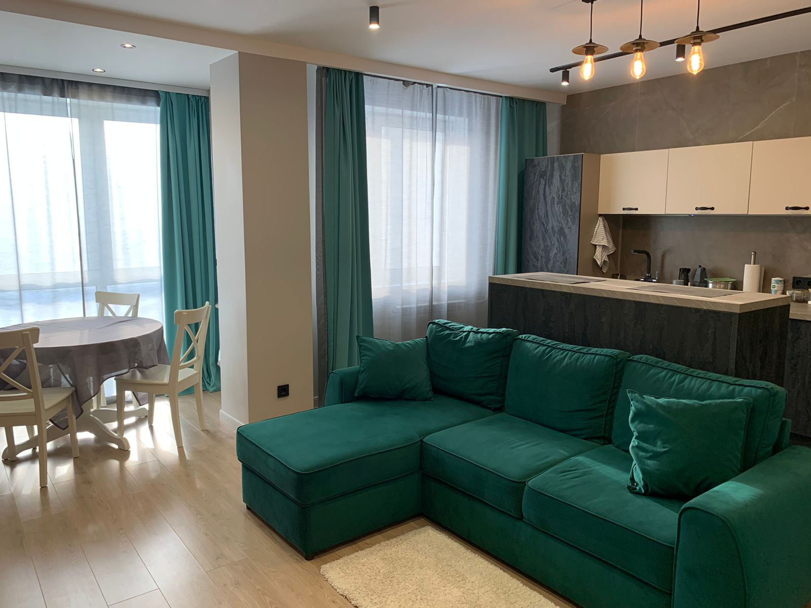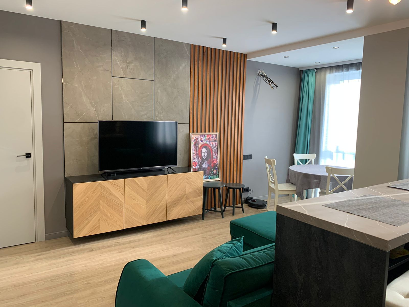 Диваны лазурит, полностью деревянные кухонный стол и стулья, большой гардероб, инсталляция в двух санузлах, встроенная душевая кабина с тропическим душем, в санузлах встроенные шкафы, спальный гарнитур, подготовленная сантехника для ванной , выведены трубы для кондиционера, новая электрика, панорамное окно, ламинат, коридор и санузлы керамогранит, на стенах в санузлах керамогранит, место под телевизор, кухонный фартук-керамогранит