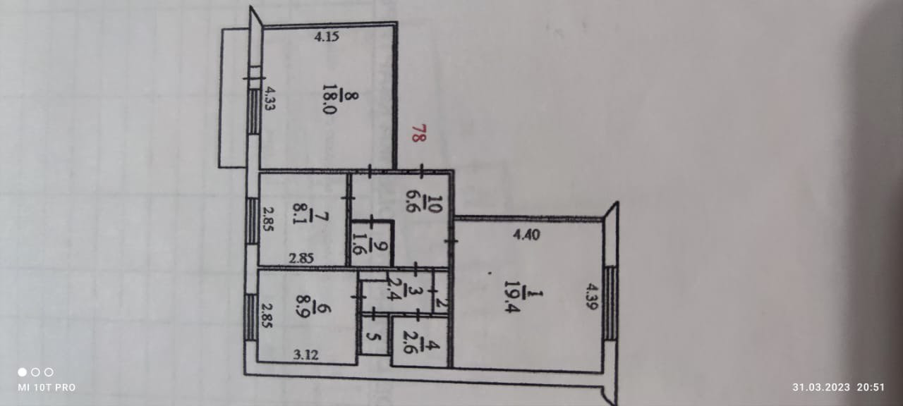 Большая площадь квартиры, 2 больших комнаты 19.6 м2 и 18 м2, кухня 9 м2.