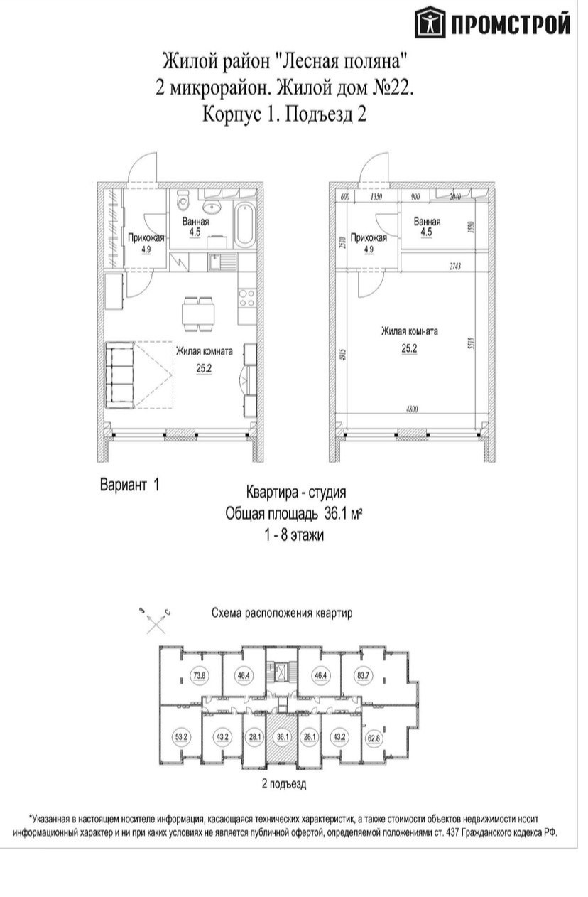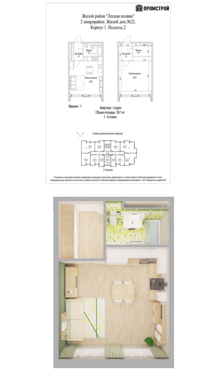 Предлагается к продаже квартира-студия 36 м2 на Лесной поляне в ЖК "Солнечный бульвар", микрорайон № 2, жилой дои № 22, корпус №1.