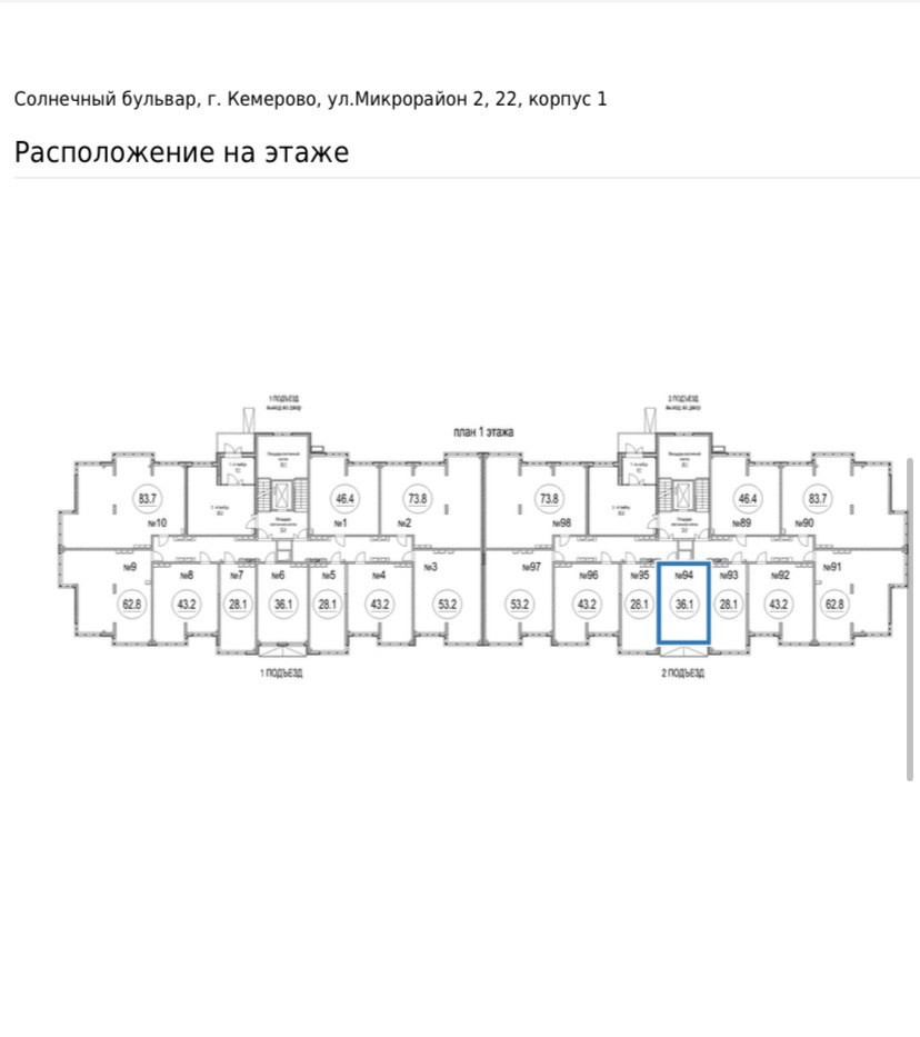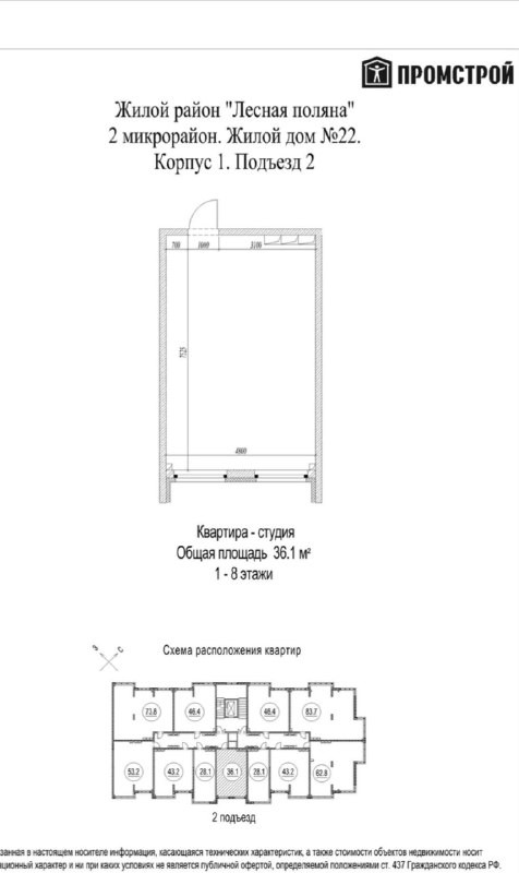 Квартира студия, 36.1 м2, этаж 2 / 8, на продажу в Кемерово, улица 2-й микрорайон, 22к1
