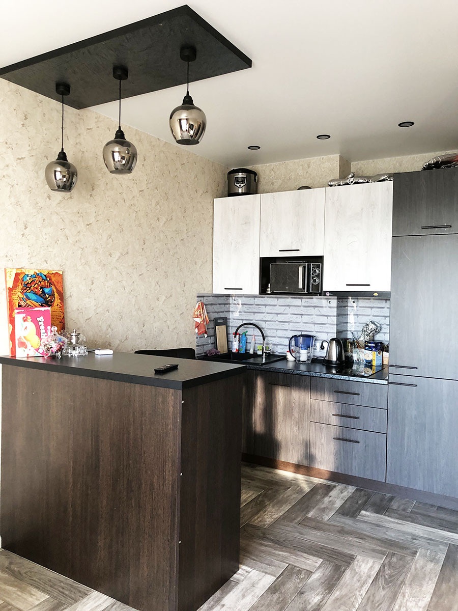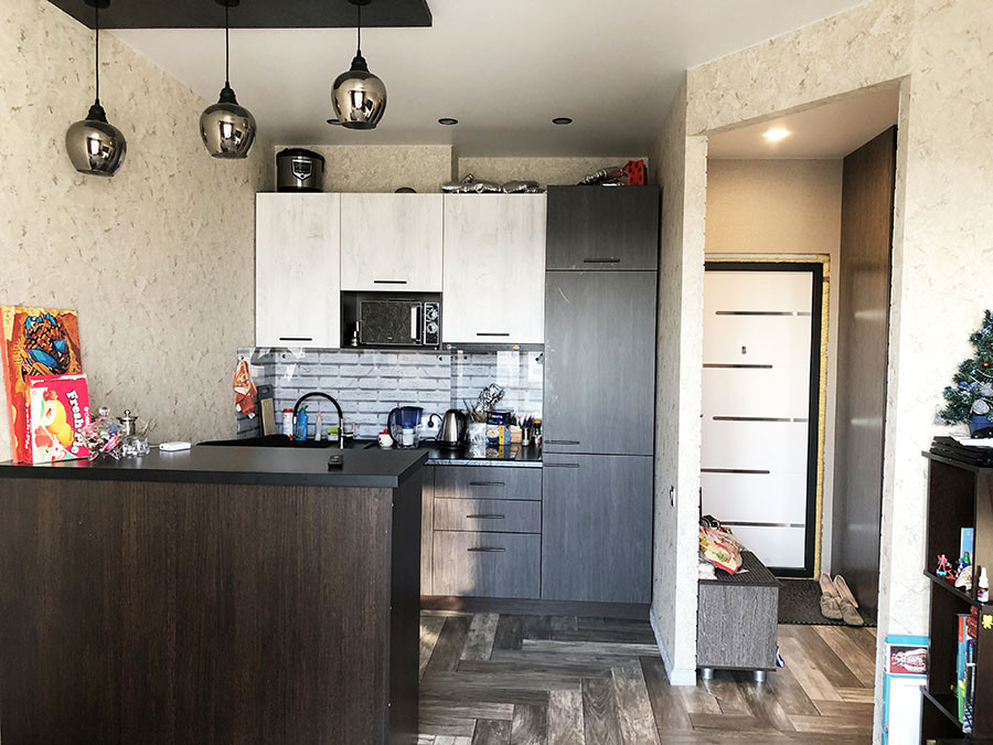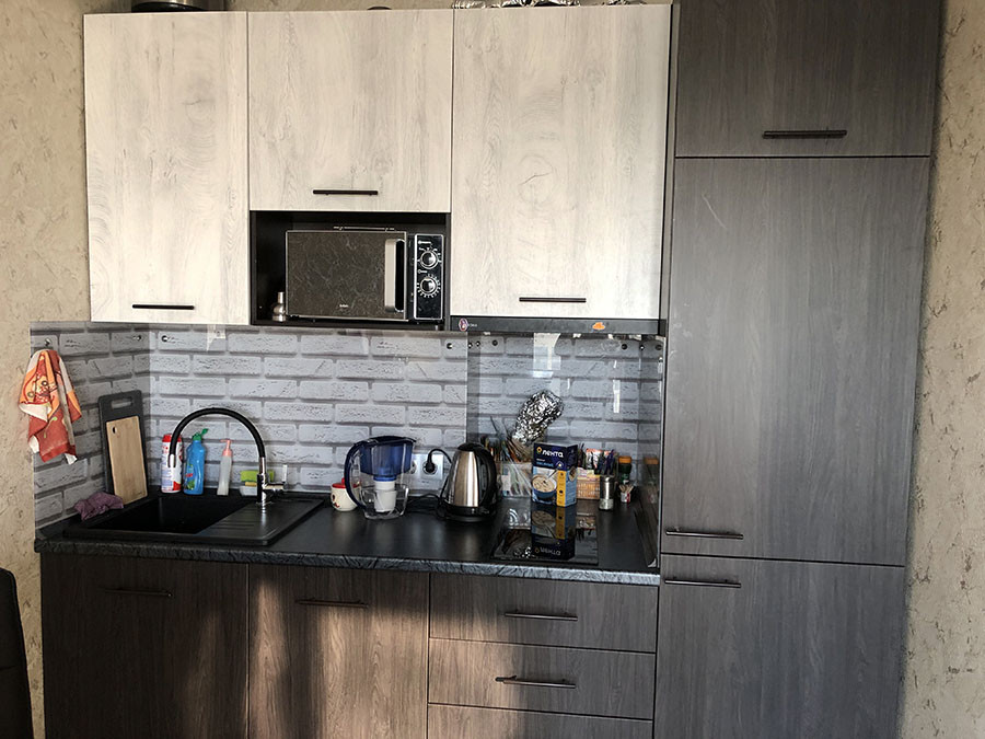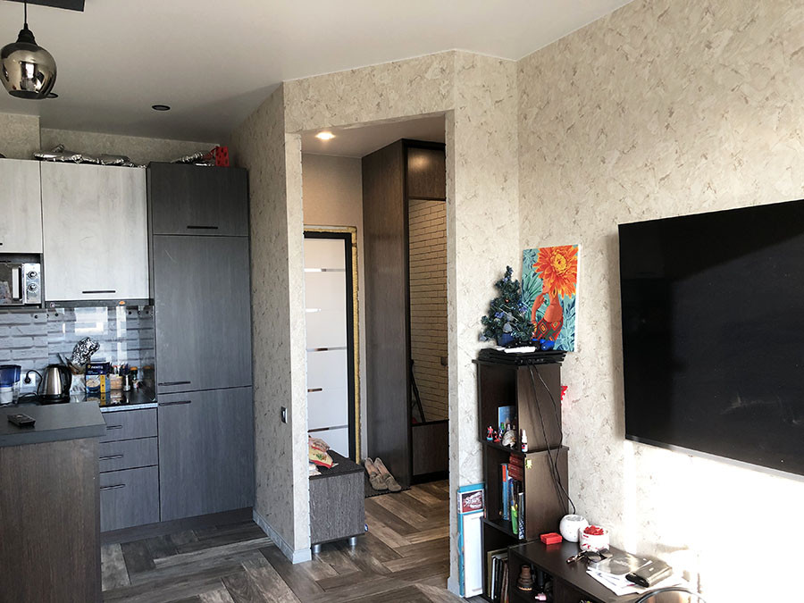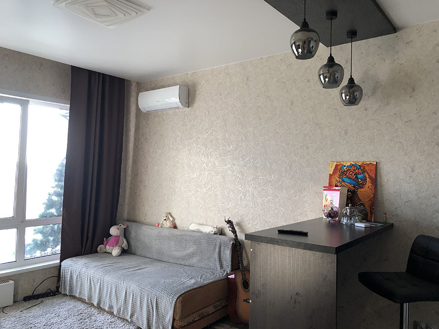 Квартира в отличном состоянии, делали для себя: качественные двери, натяжные потолки, кондиционер, кафель в ванной, хорошая сантехника. Из мебели остается кухонный гарнитур с встроенным холодильником, бытовой техникой и вытяжкой, барная стойка-стол, 2х спальная кровать, встроенные шкафы-купе в спальне и прихожей, мойдодыр с зеркалом в ванной. Все новое, в отличном состоянии.