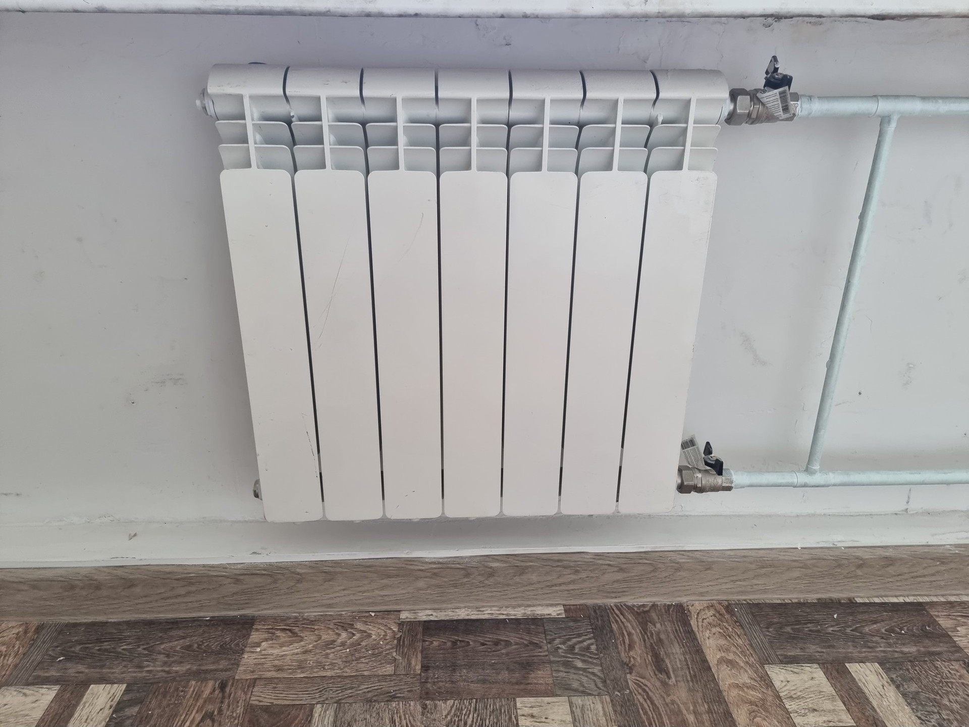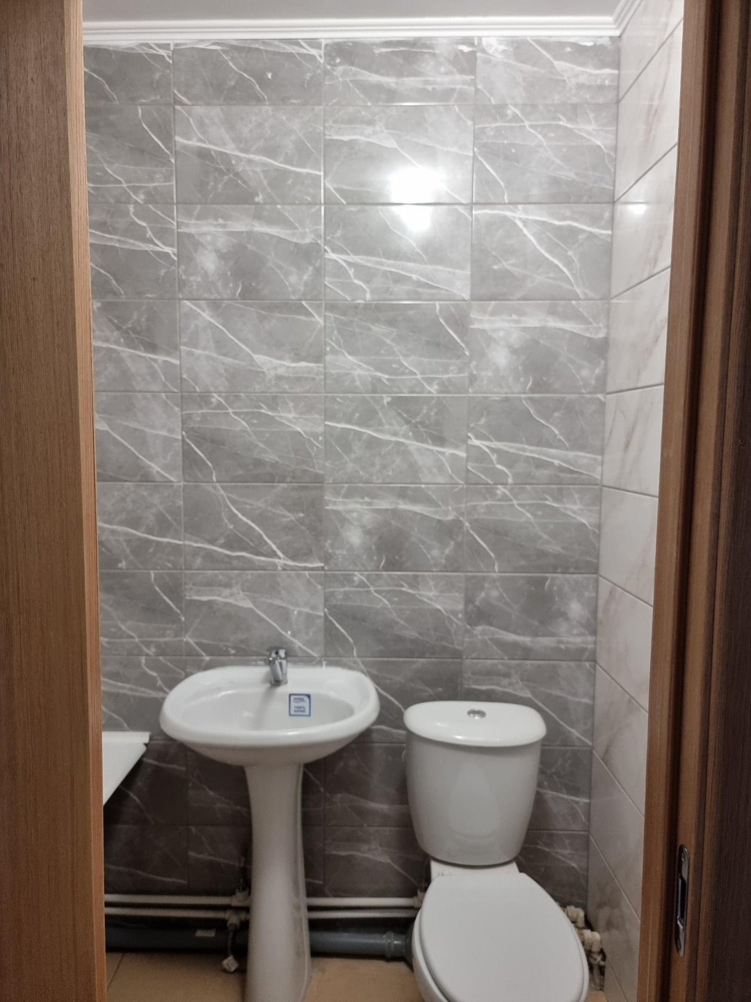 Новая сантехника, трубы горячей и холодной воды, канализация, унитаз, раковина, смесители. Приборы отопления - алюминий.