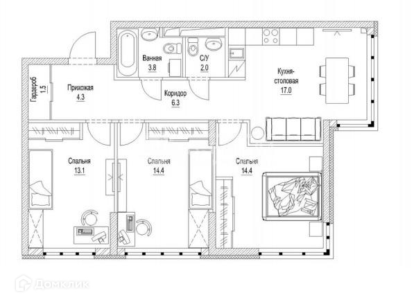Жилая площадь 59.4 м2