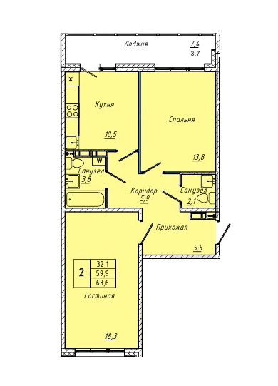 Общая площадь 63.6 м2