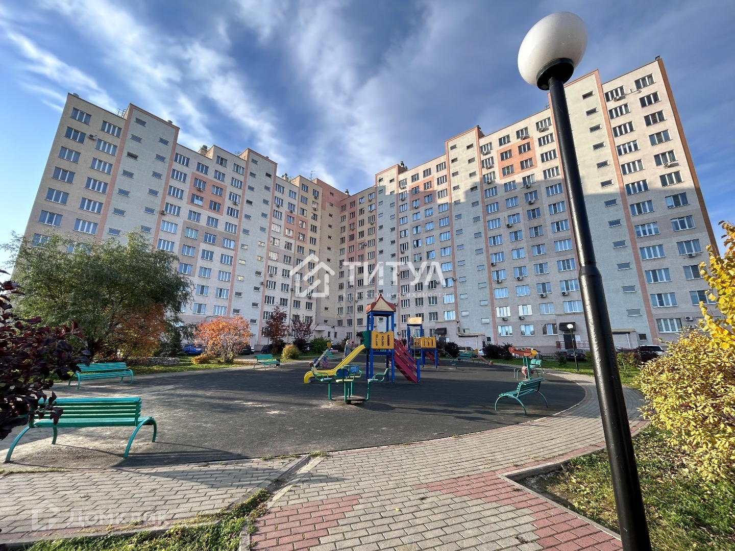 Красивый благоустроенный двор с современными игровыми и детскими площадками и большим количеством открытых парковочных мест.