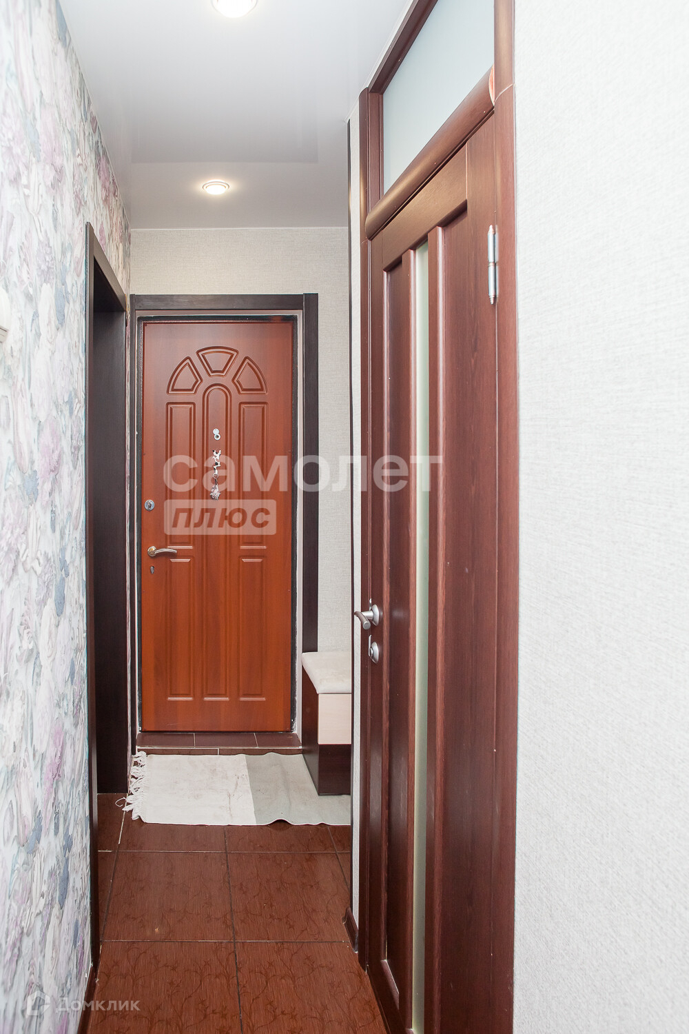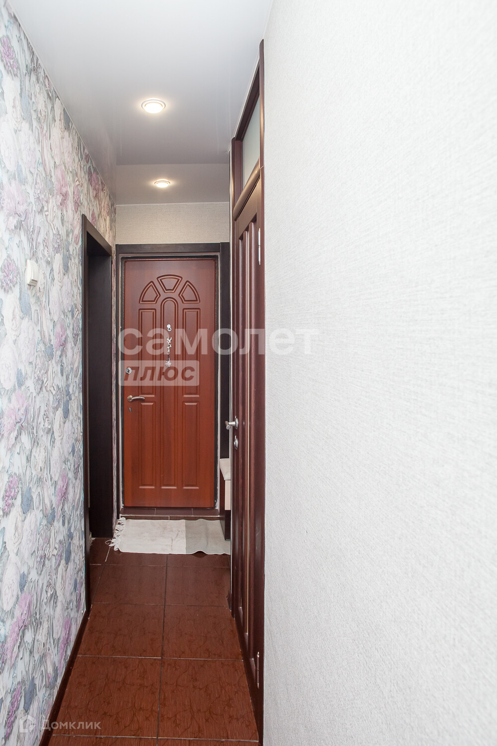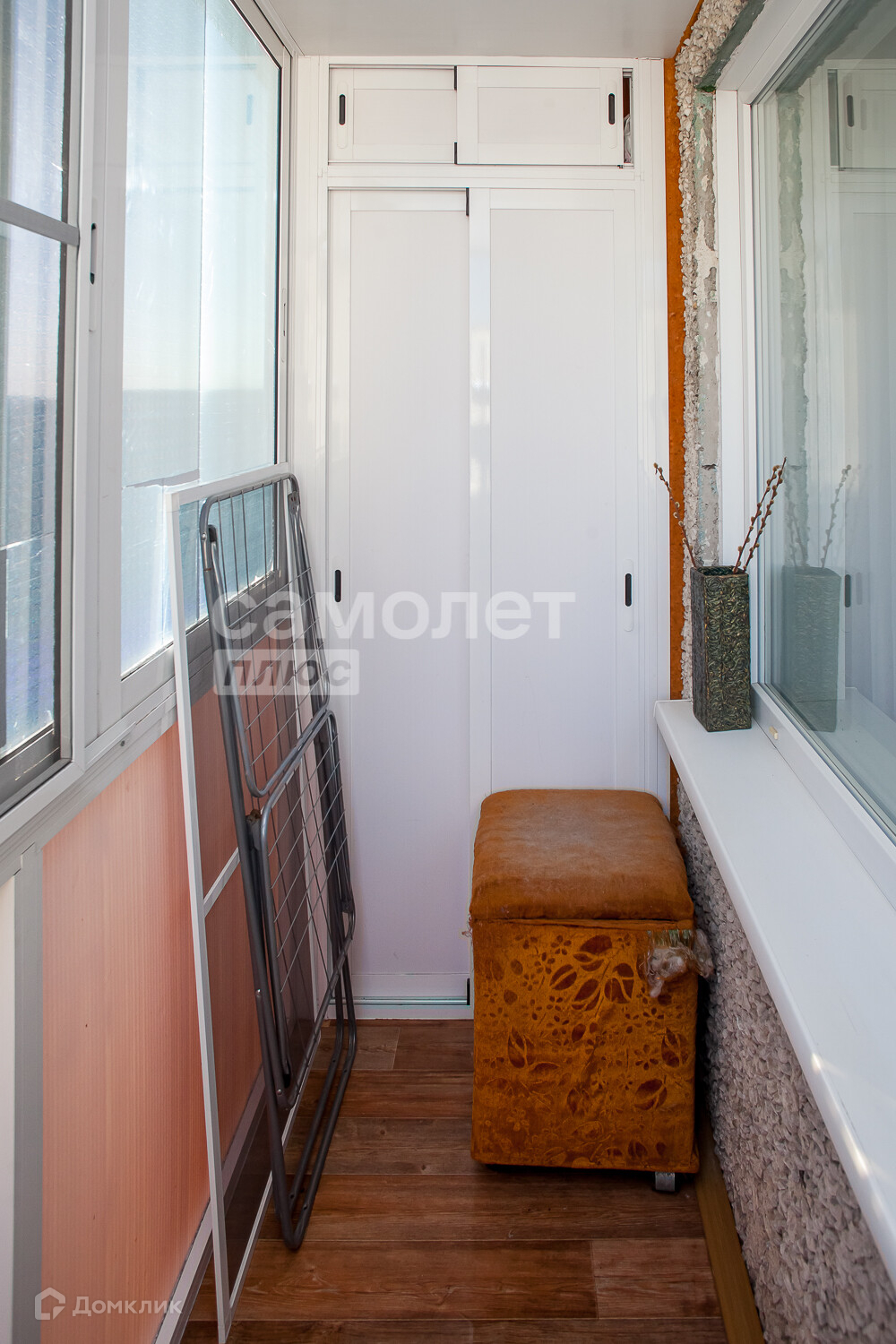 Балкон застеклен пластиком, с внутренней отделкой. Установлена надежная входная дверь и шкаф купе при входе.