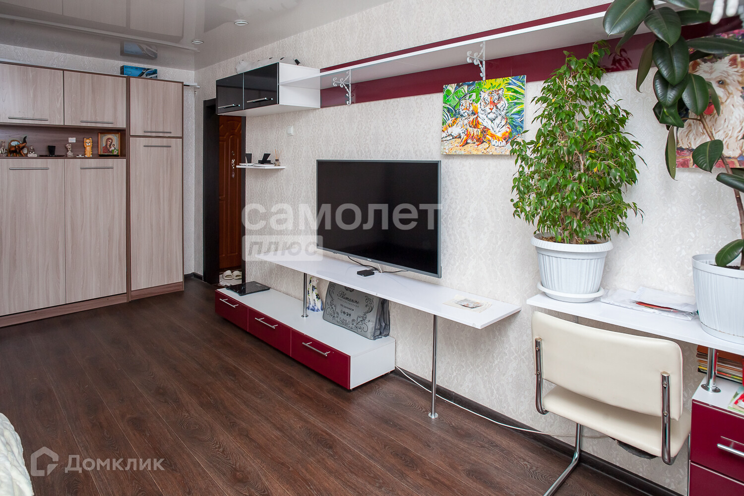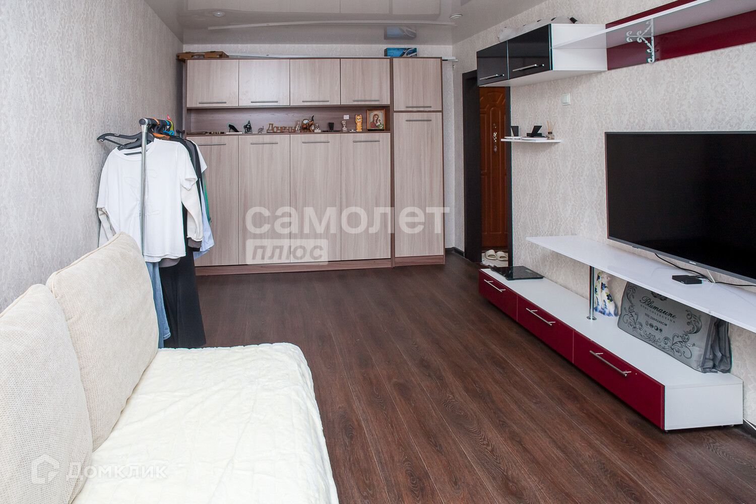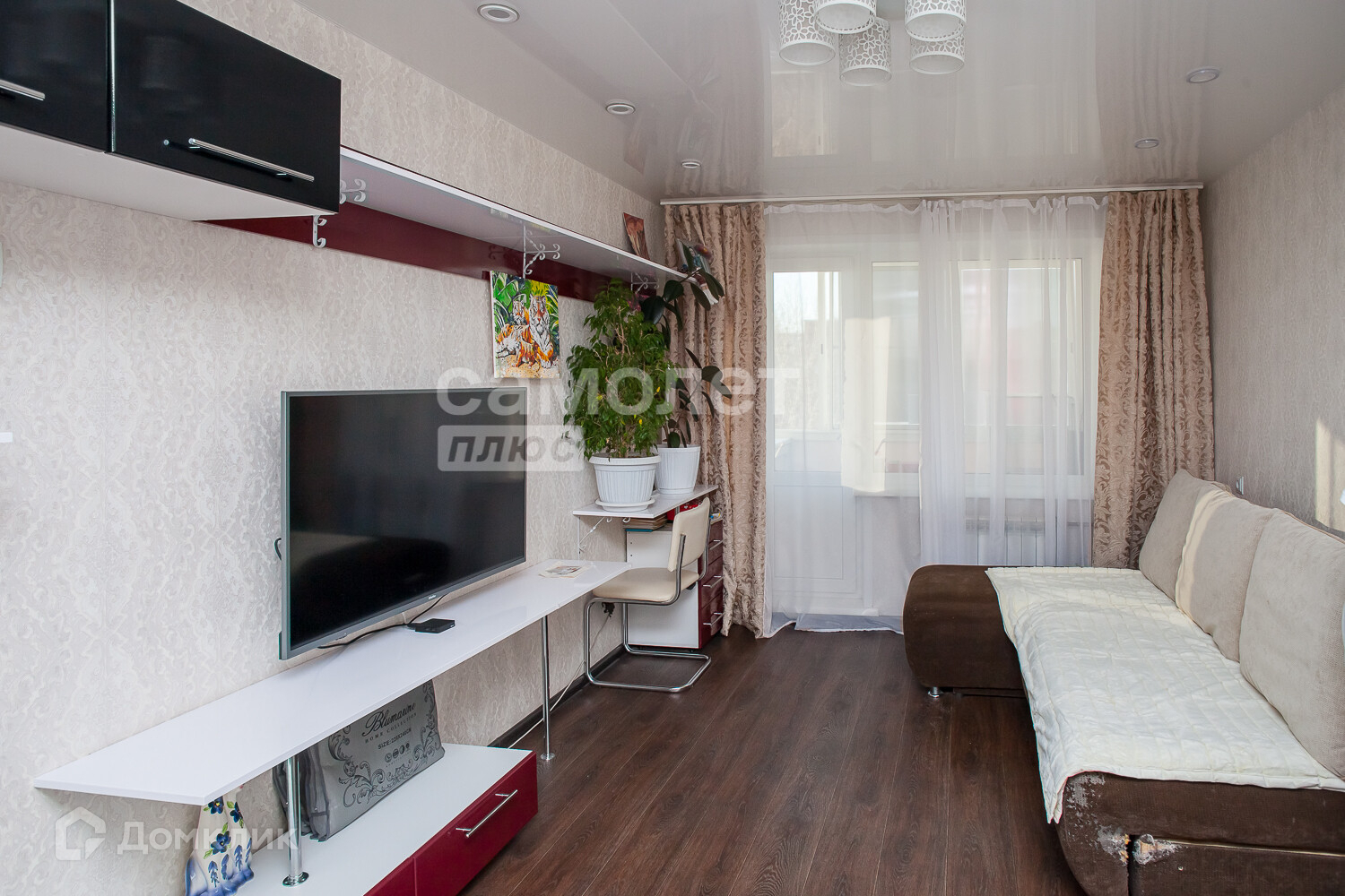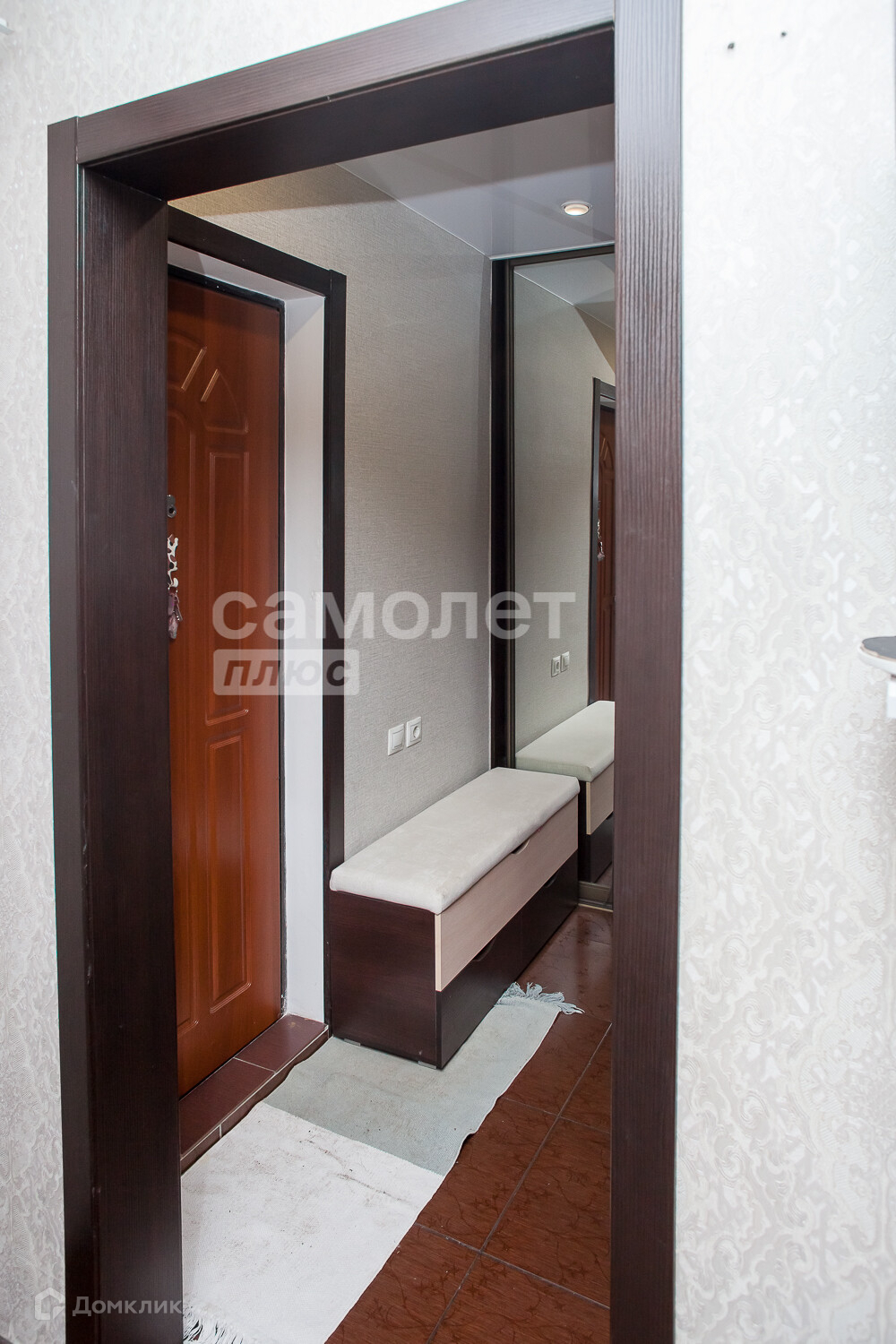 Балкон застеклен пластиком, с внутренней отделкой. Установлена надежная входная дверь и шкаф купе при входе.