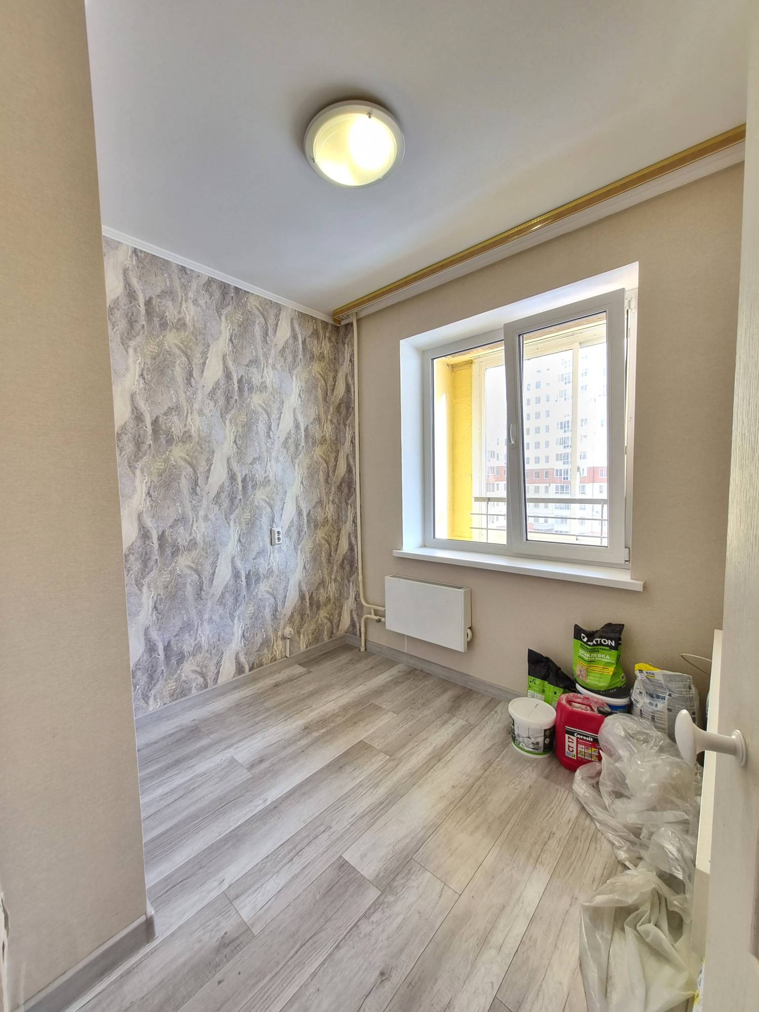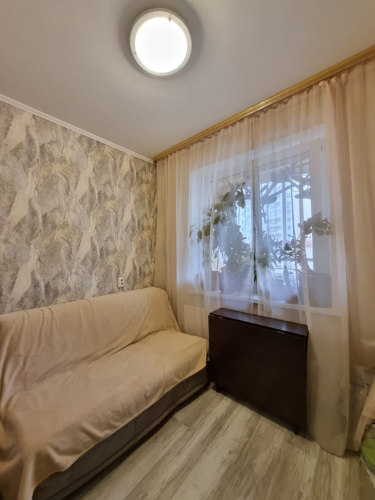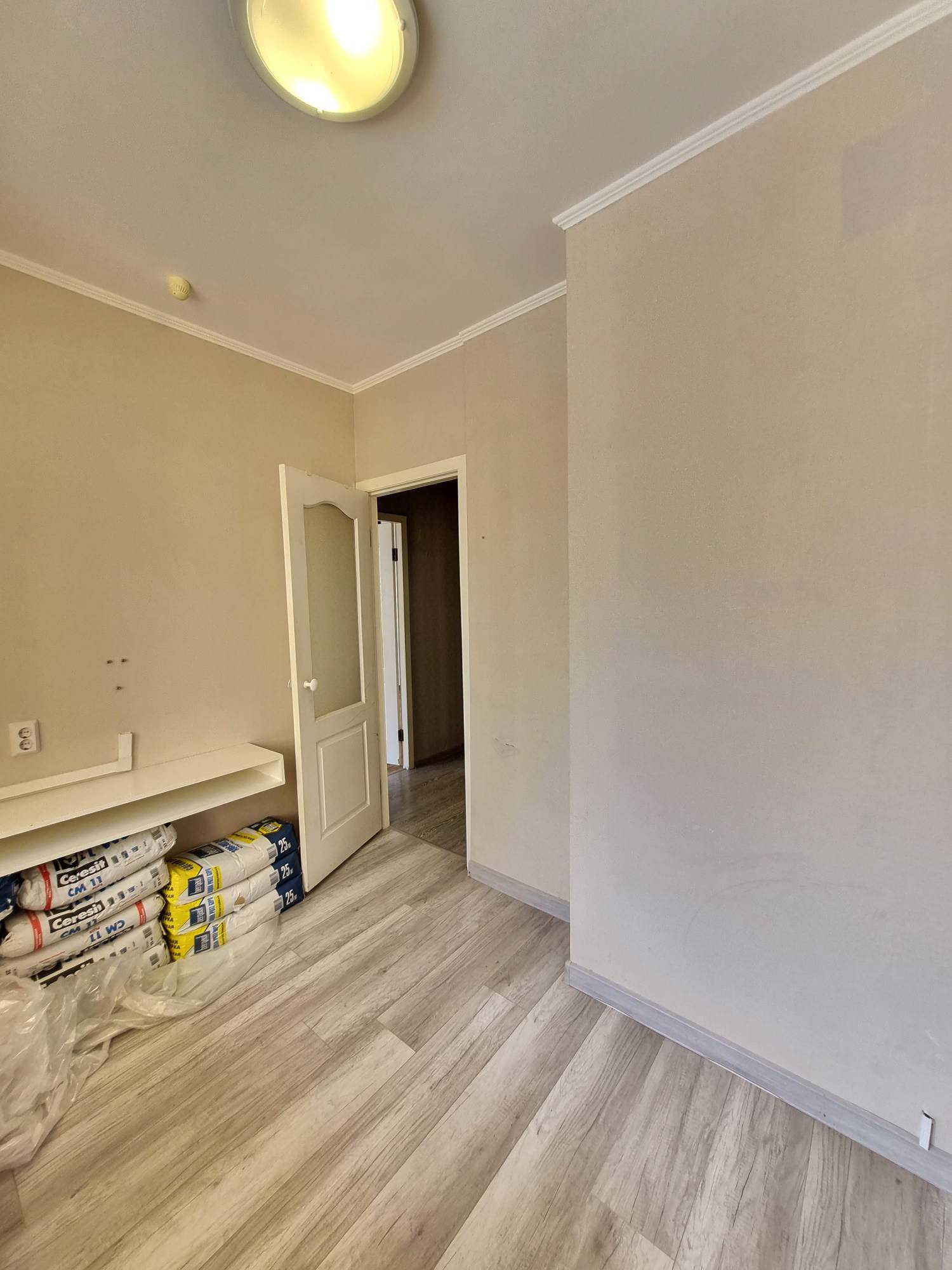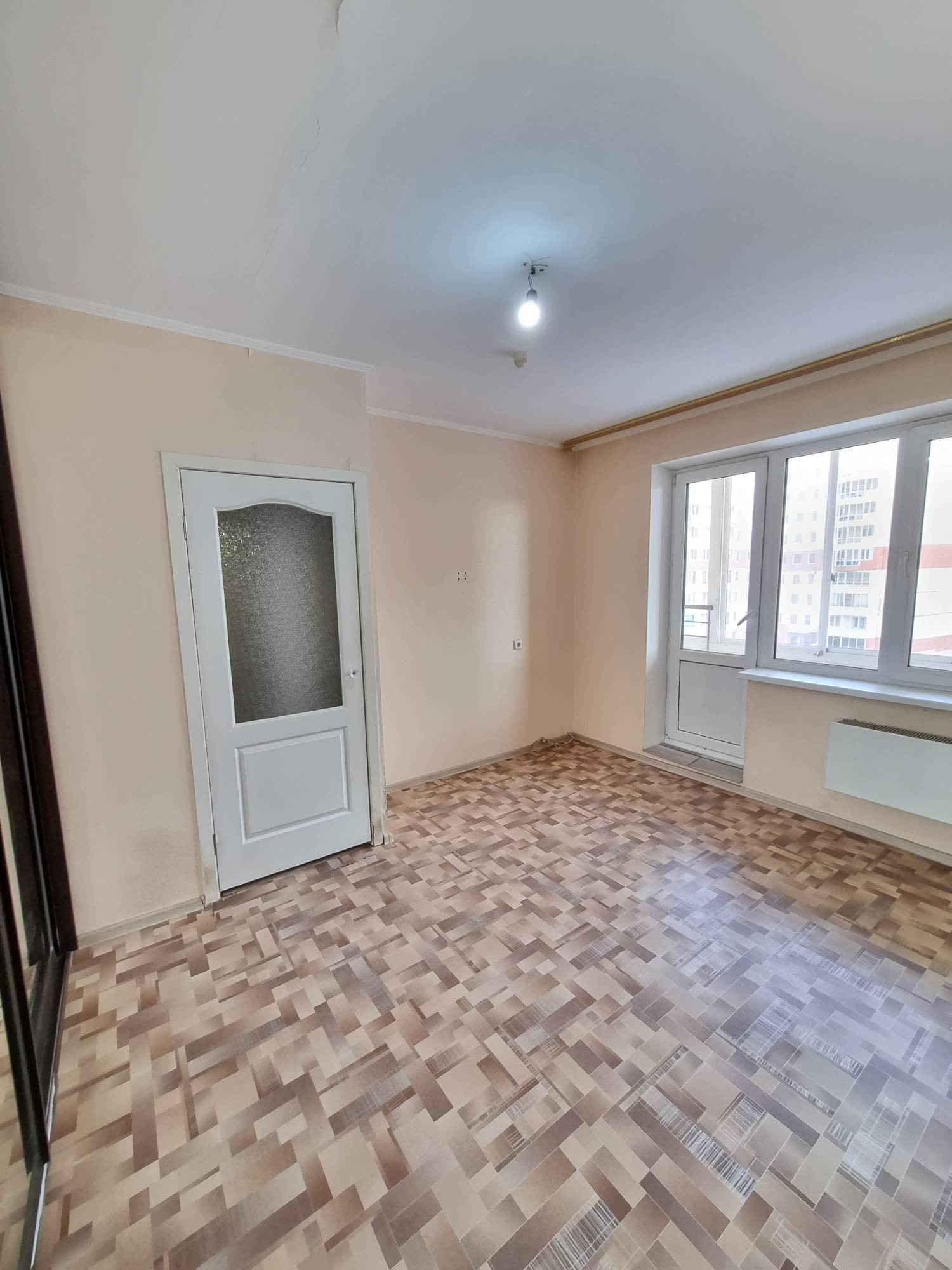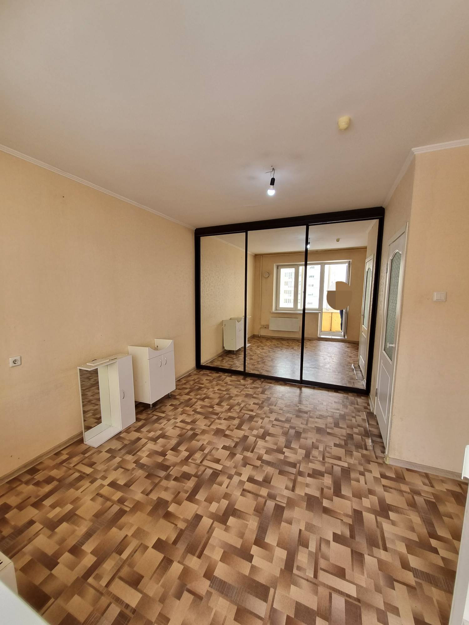 Квартира не угловая, с лоджией на две комнаты, из окон видно Сосновый бор, теплая, требует косметического ремонта. В комнате установлен большой вместительный шкаф-купе. Санузел совмещенный, подготовлен для укладки плитки.
