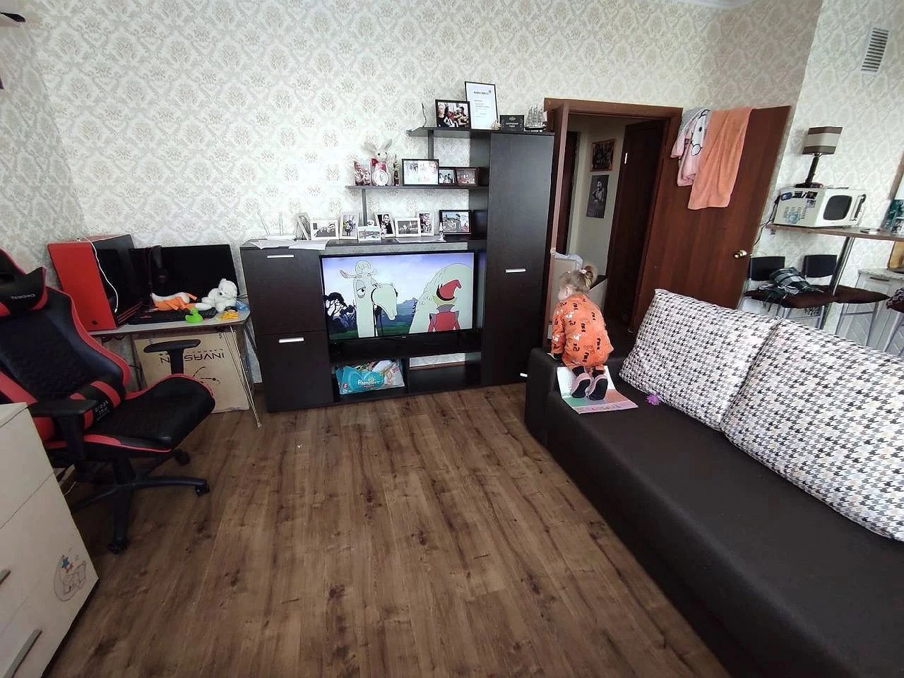 Так же остаётся стиральная машина в отличном состоянии, стенка в гостиной, диван.