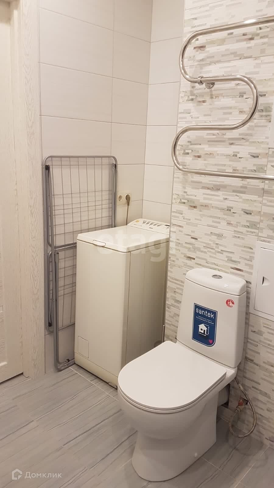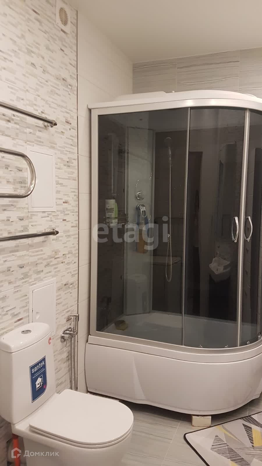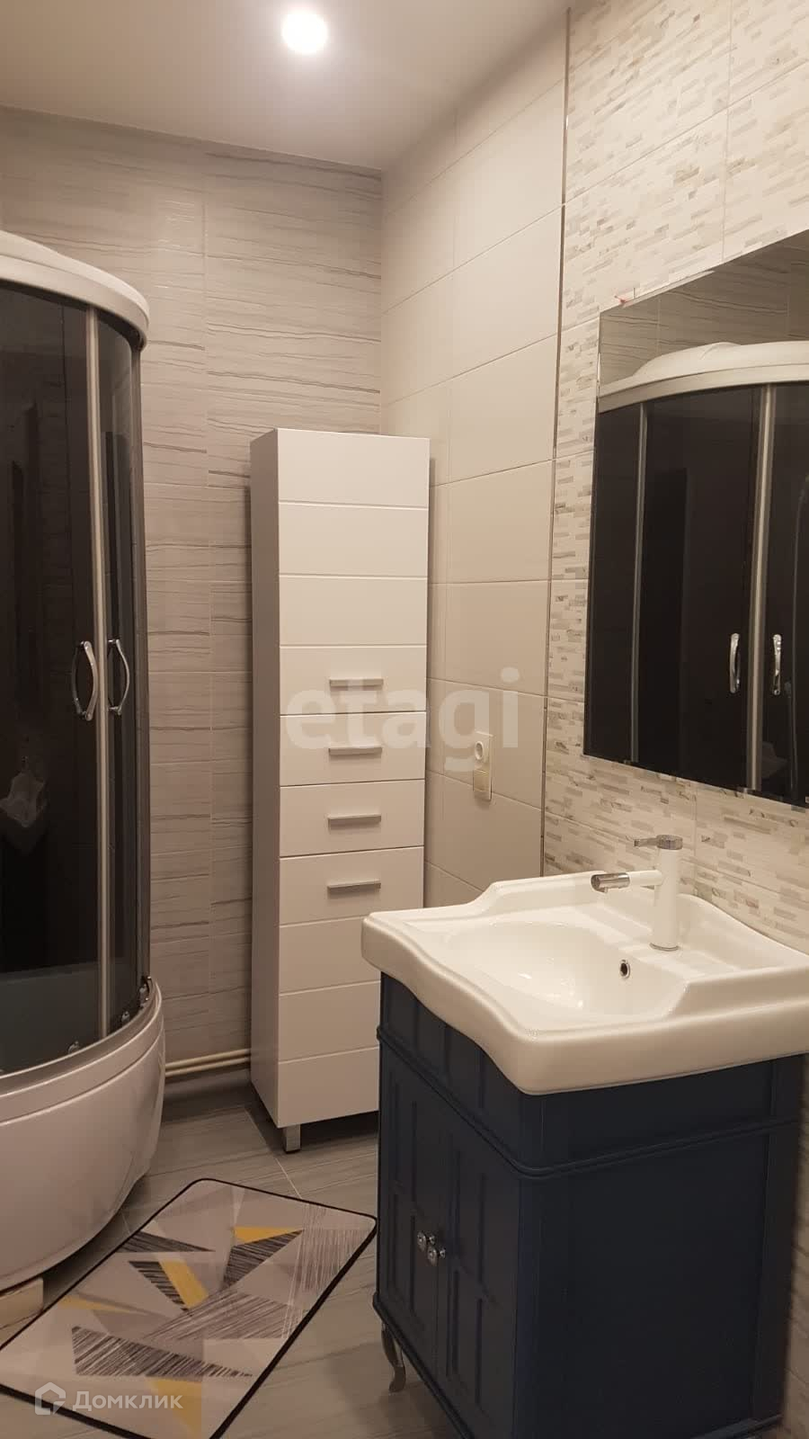 Площадь разделена на функциональные зоны, перепланировка узаконена. Санузел совмещенный и оборудован всем необходимым: вентиляция, стены и пол выложены кафелем, есть полотенцесушитель, зеркало, душевая кабина, гигиенический душ, стиральная машина, тумба с раковиной и пенал.