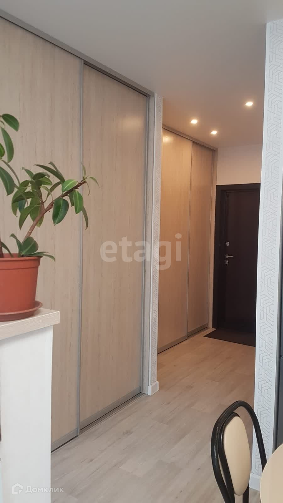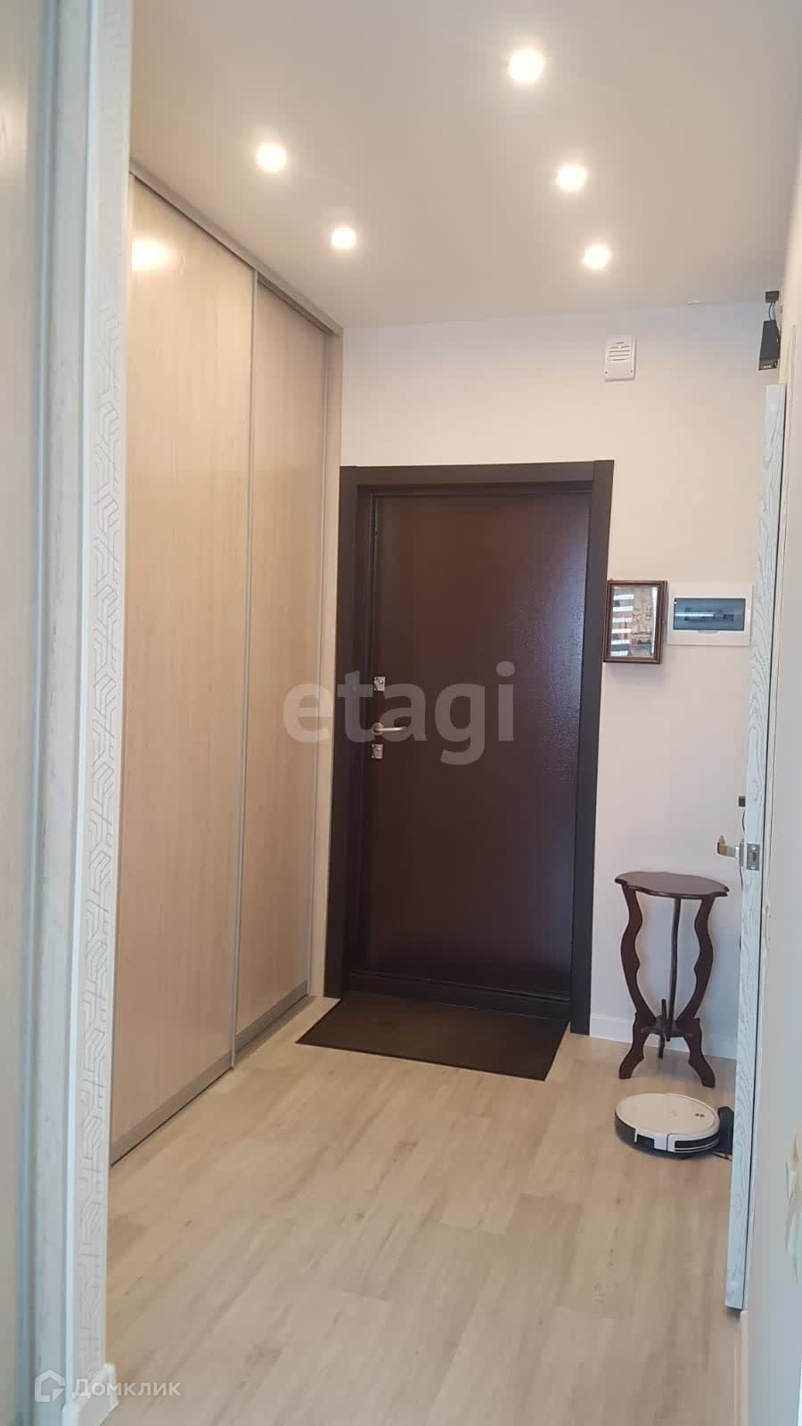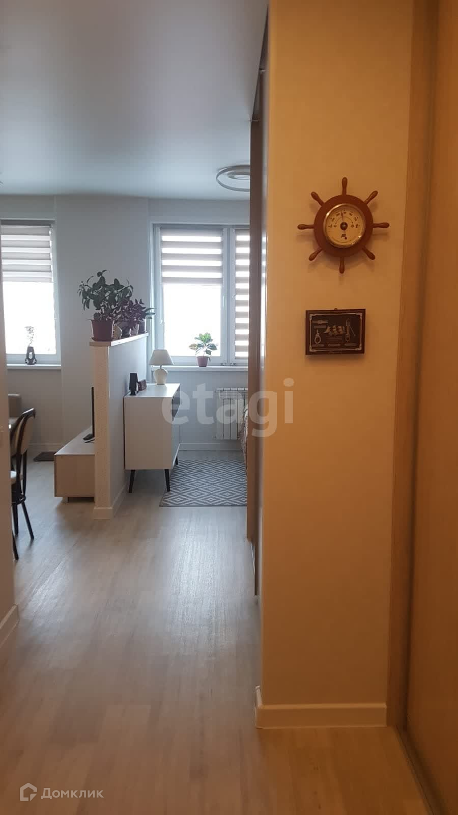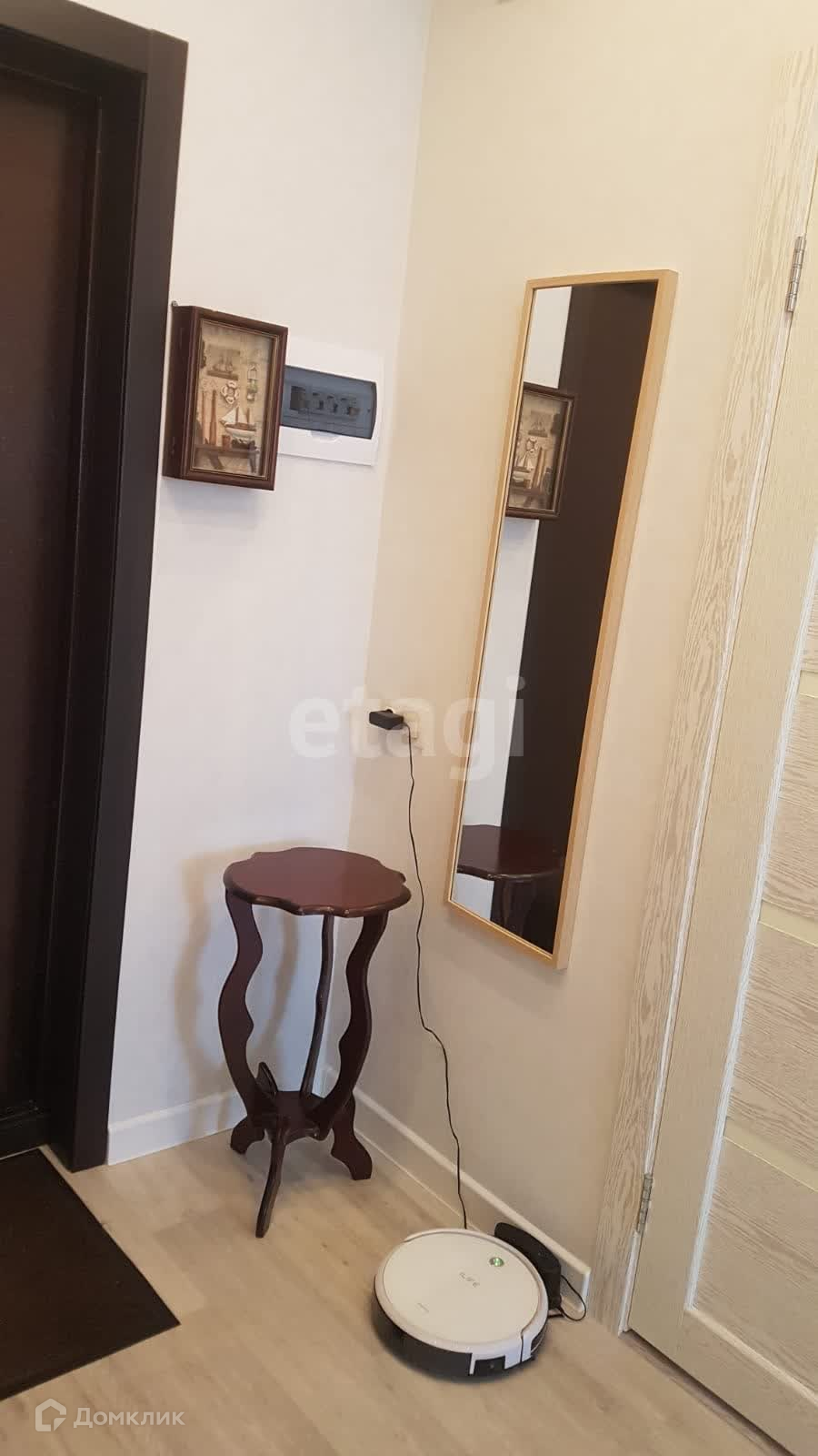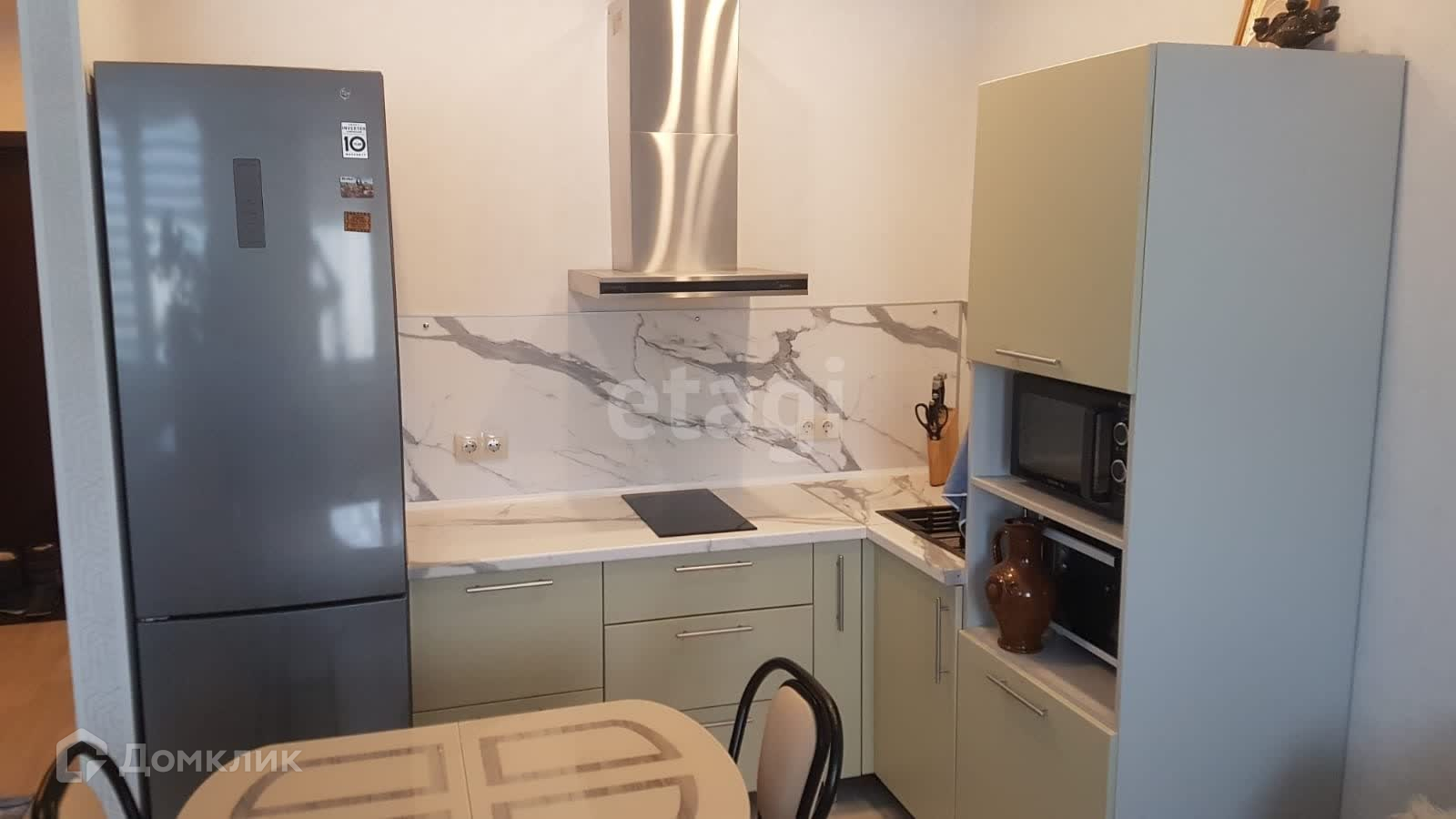 Эта квартира продаётся полностью мебелированной и с бытовой техникой. Внутри вы найдете встроенные шкафы, кровать из массива березы с ортопедическим матрасом, комод, диван, а также оборудованную кухню с вытяжкой, холодильником и варочной индукционной панелью. Также есть обеденный стол, стулья и тумба для телевизора.