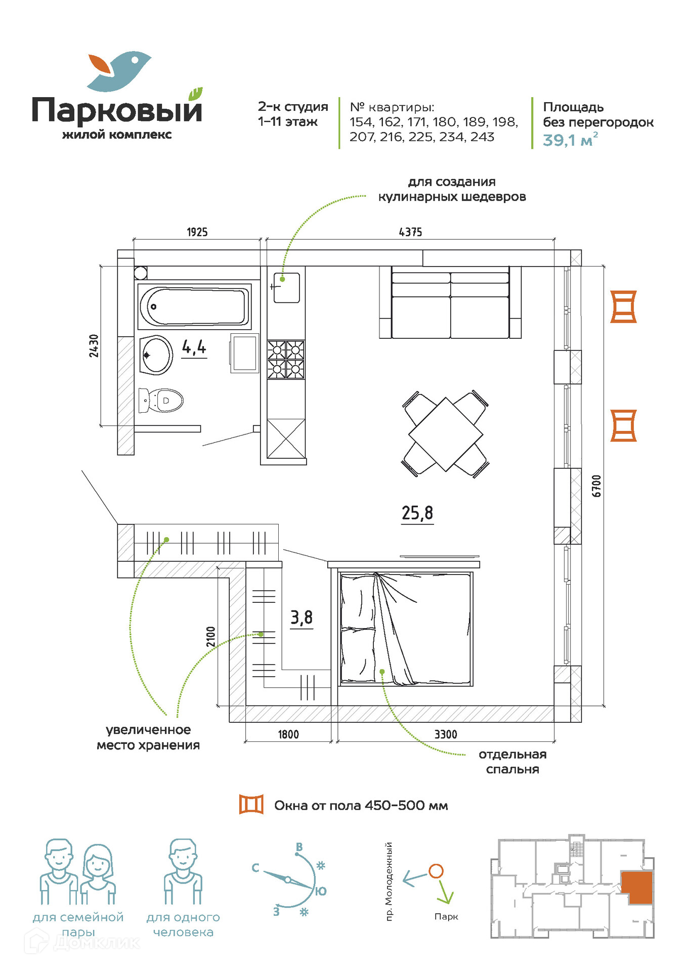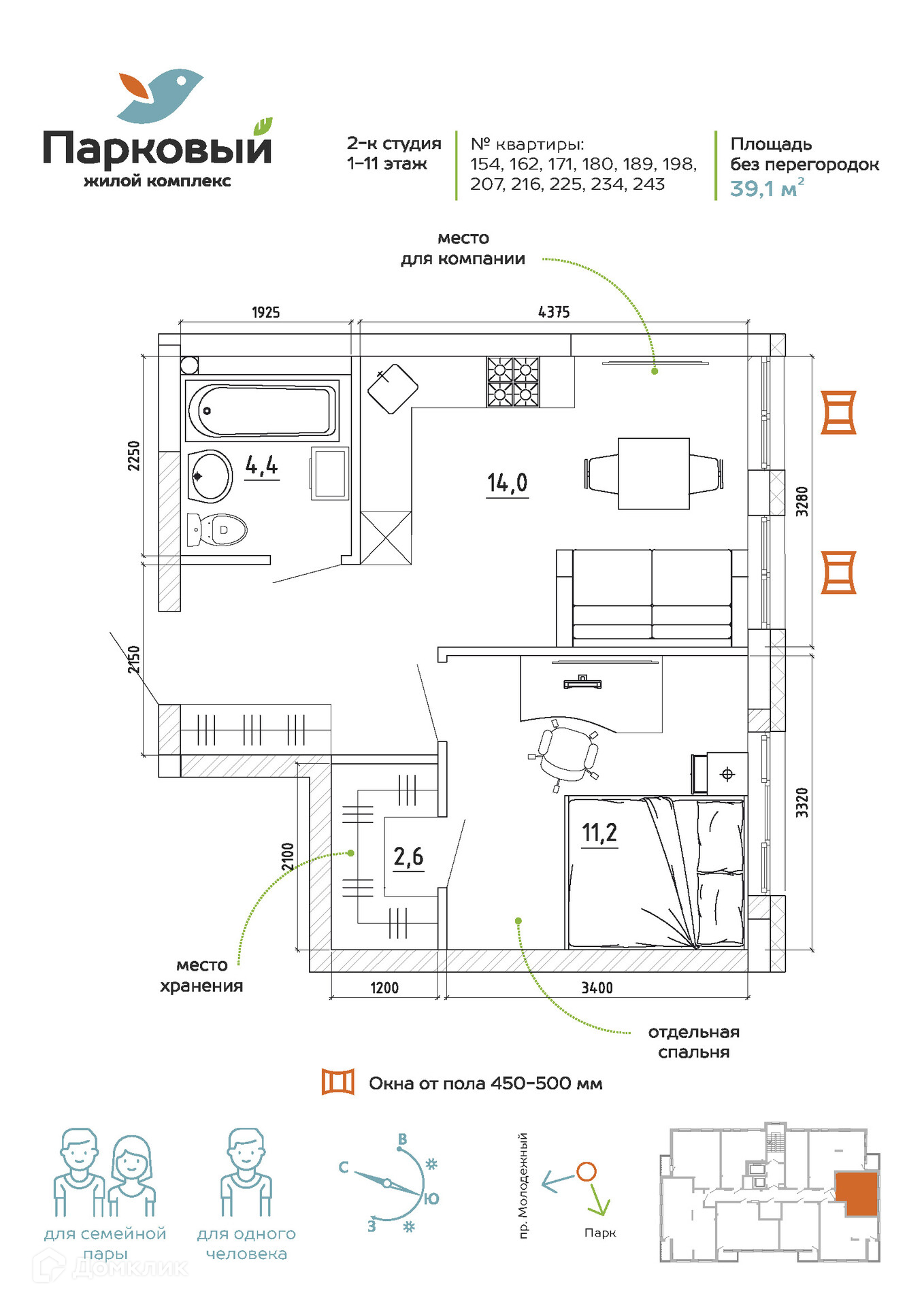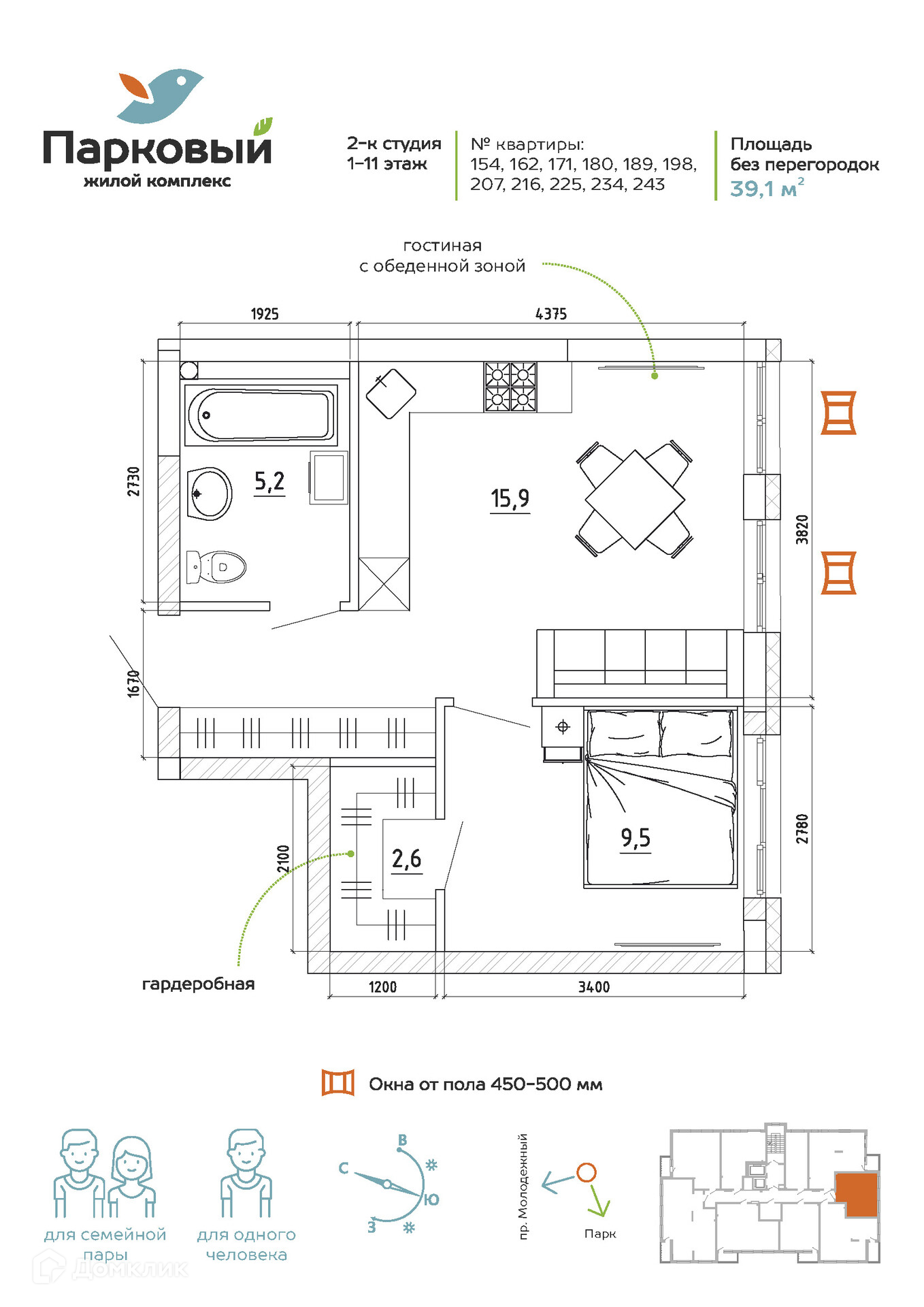 Квартира студия, 39.1 м2, этаж 9 / 15, на продажу в Кемерово, жилой комплекс Парковый, 5