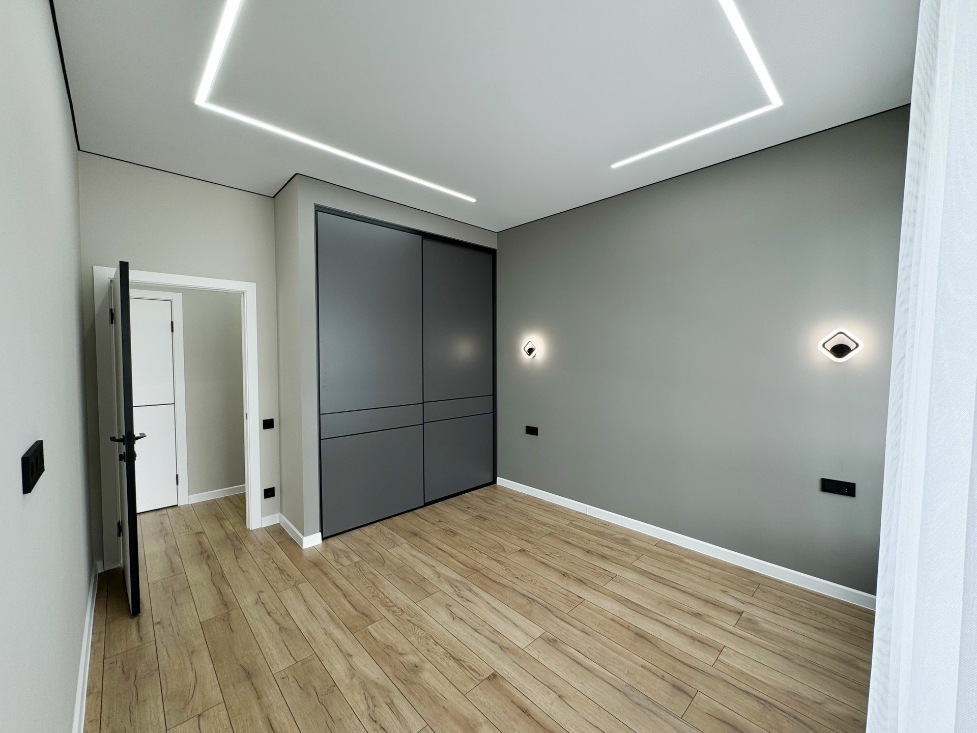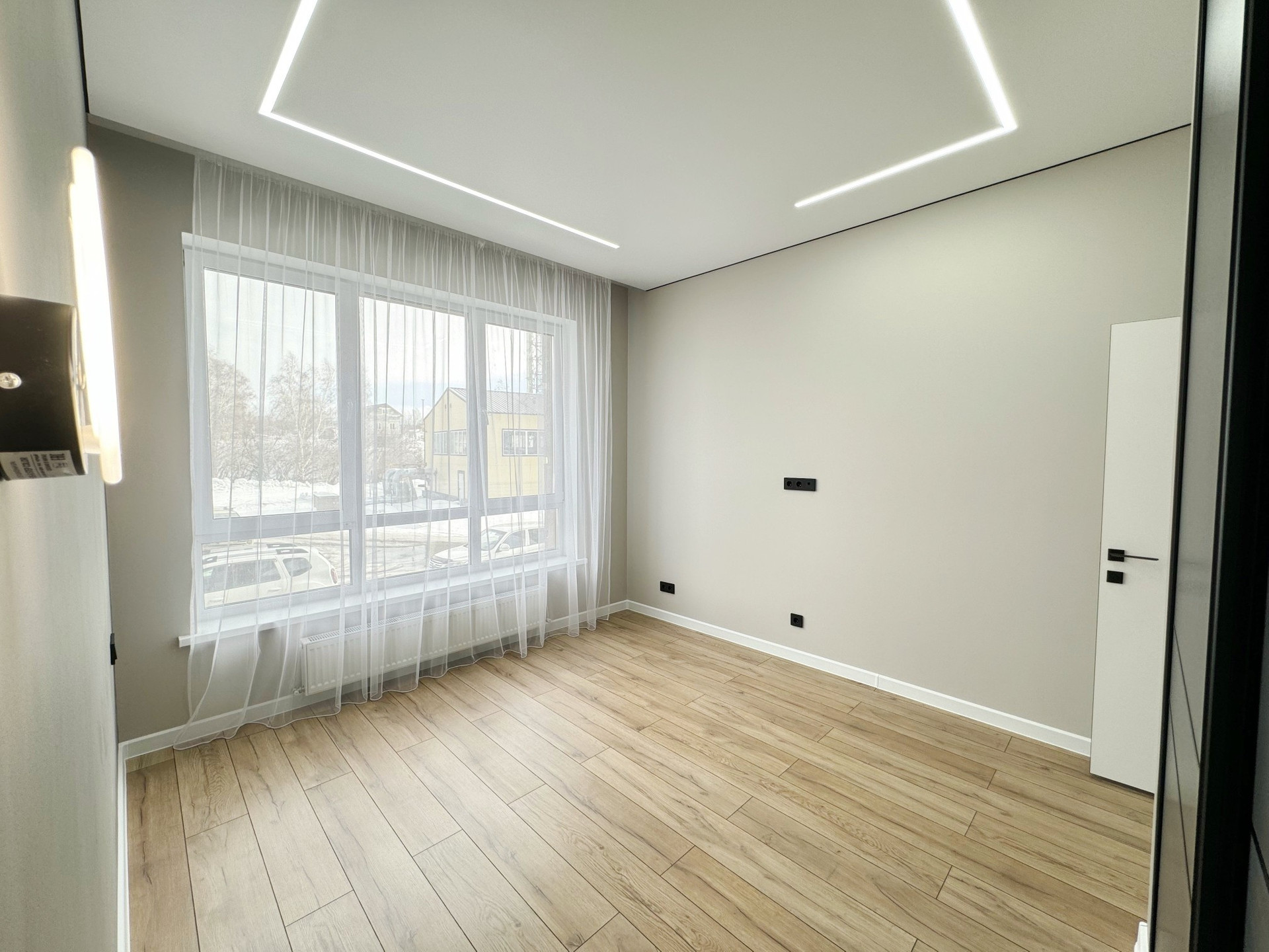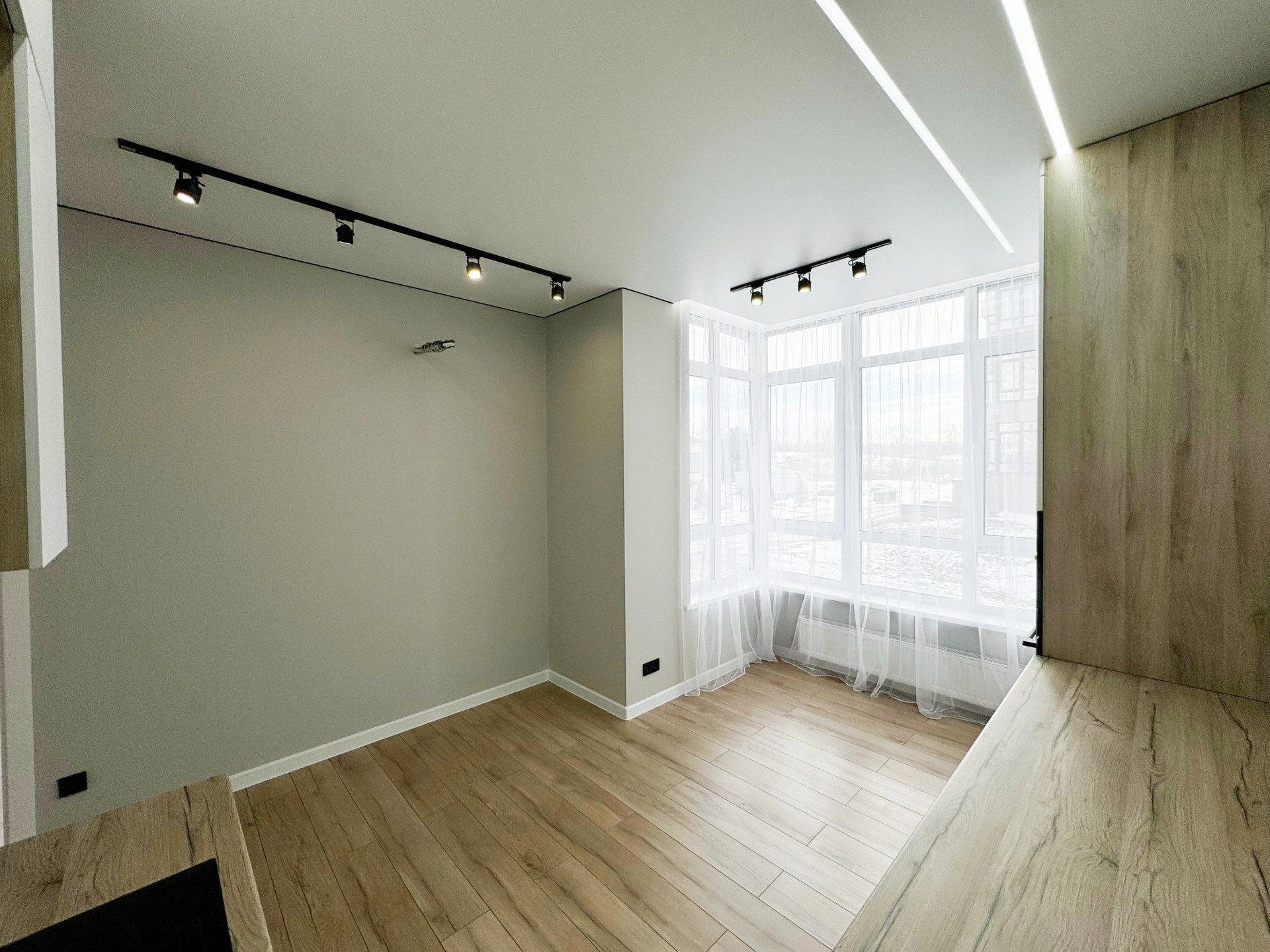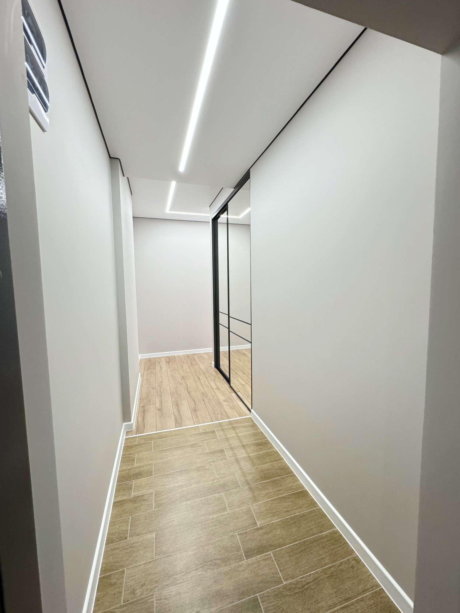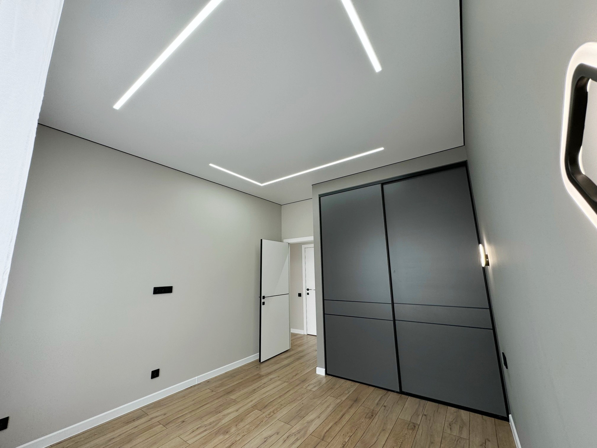• стены выровнены под маяки, натяжной потолок с встроенным освещением;