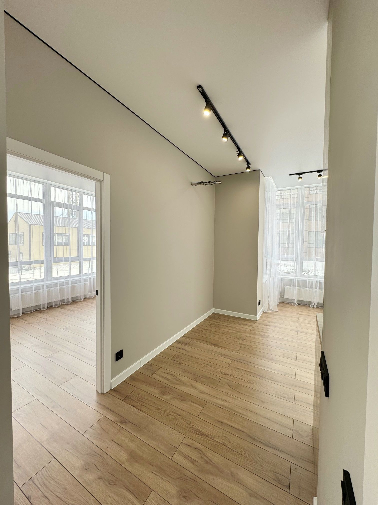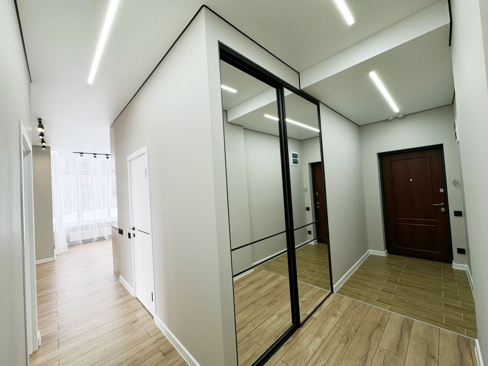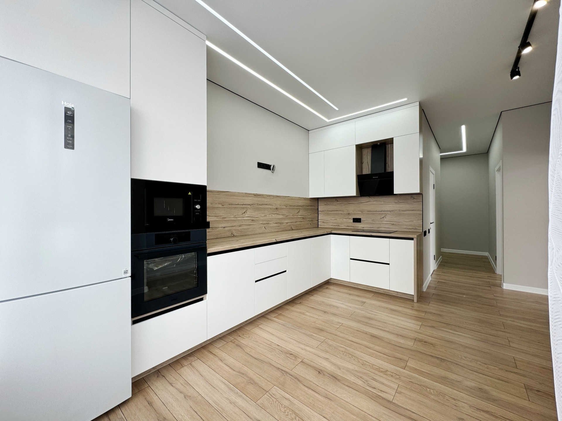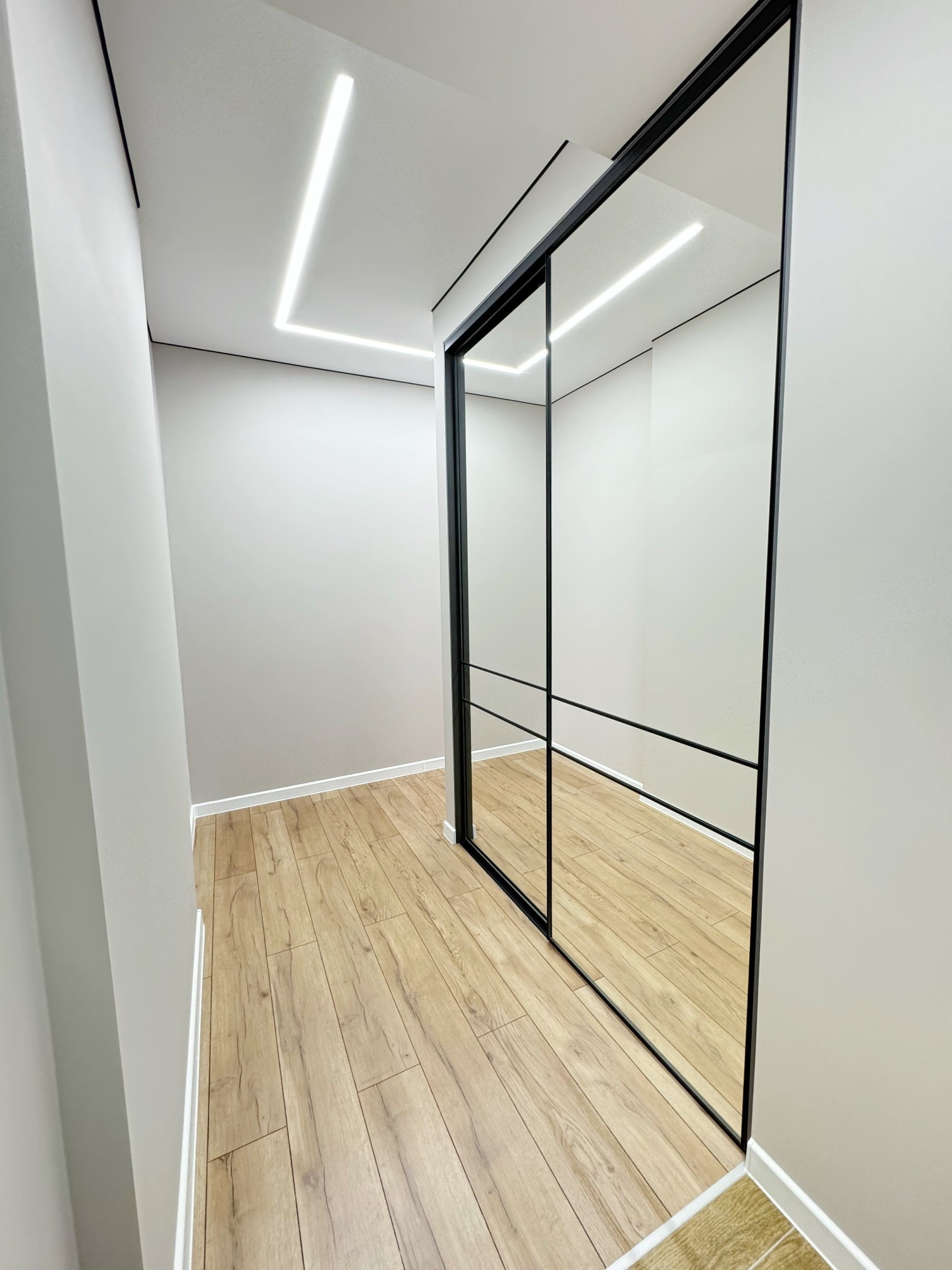 • стены выровнены под маяки, натяжной потолок с встроенным освещением;