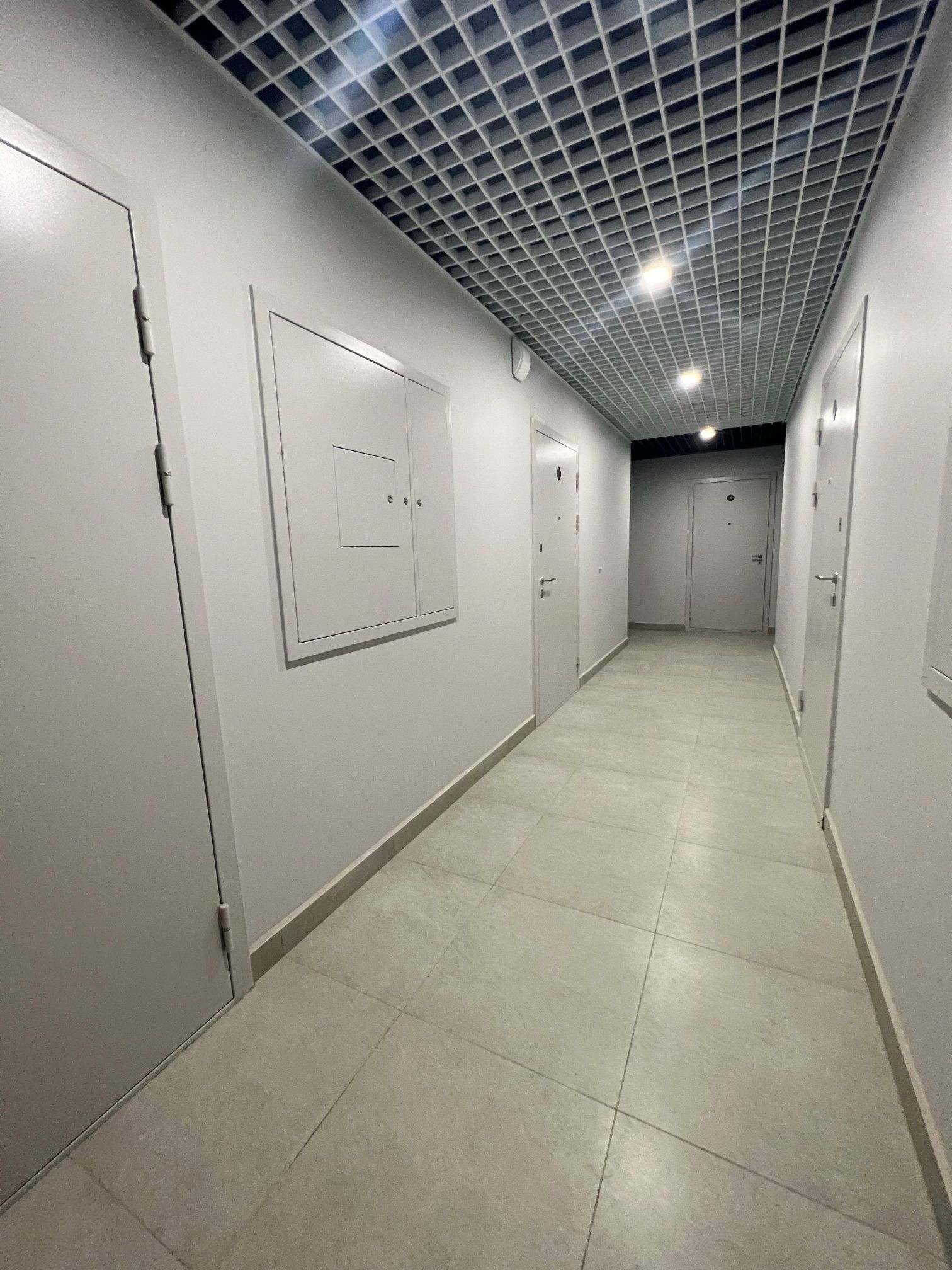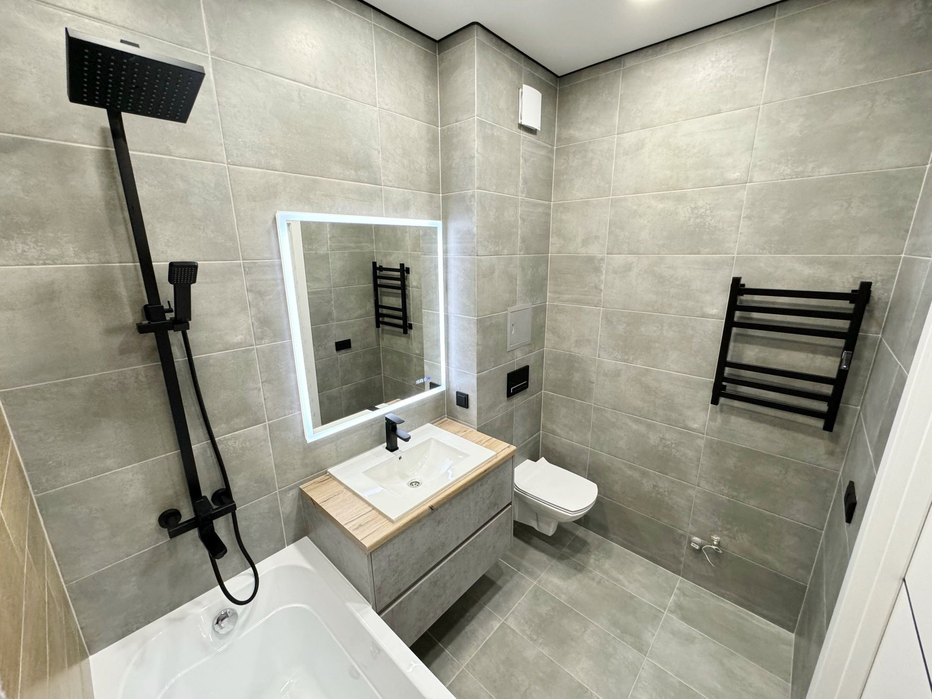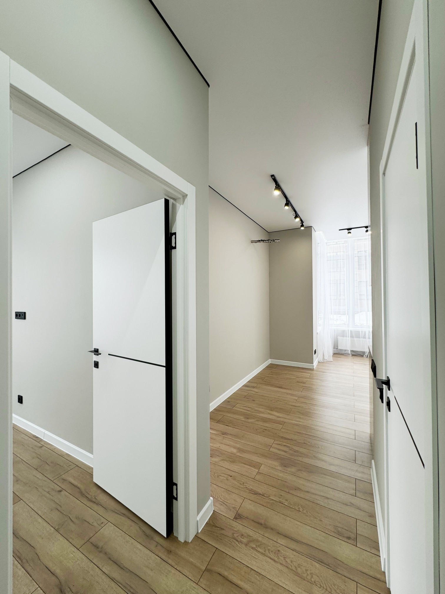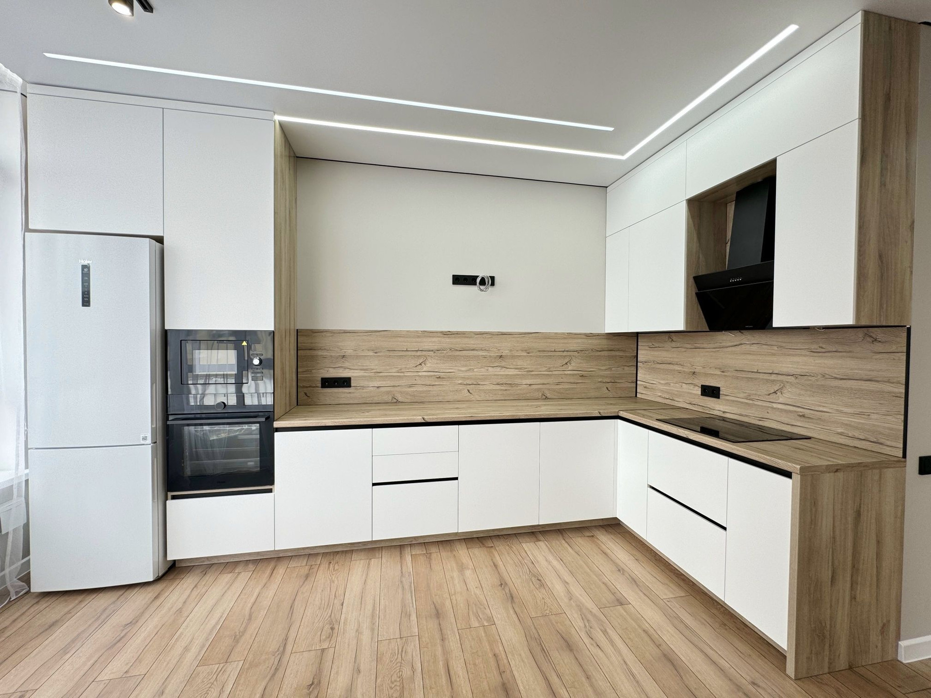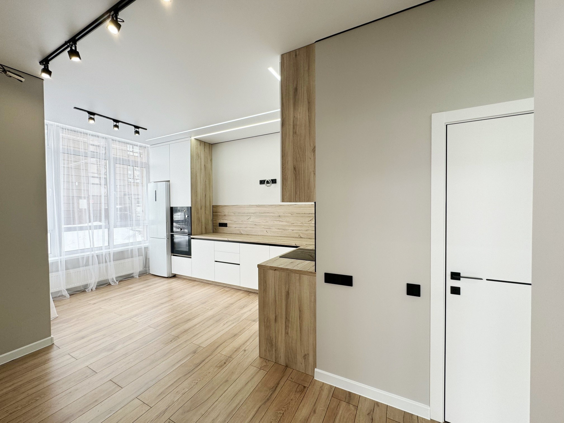• стены выровнены под маяки, натяжной потолок с встроенным освещением;