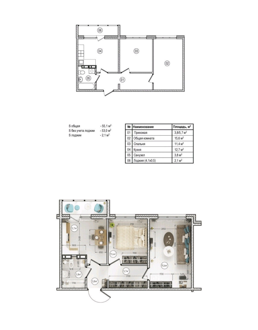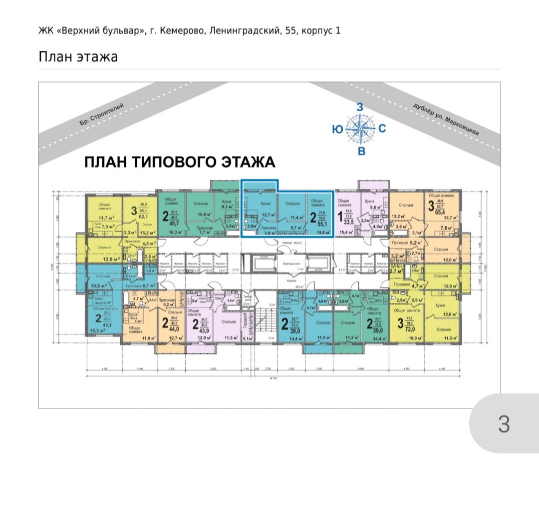 Общая площадь 55.1 м2