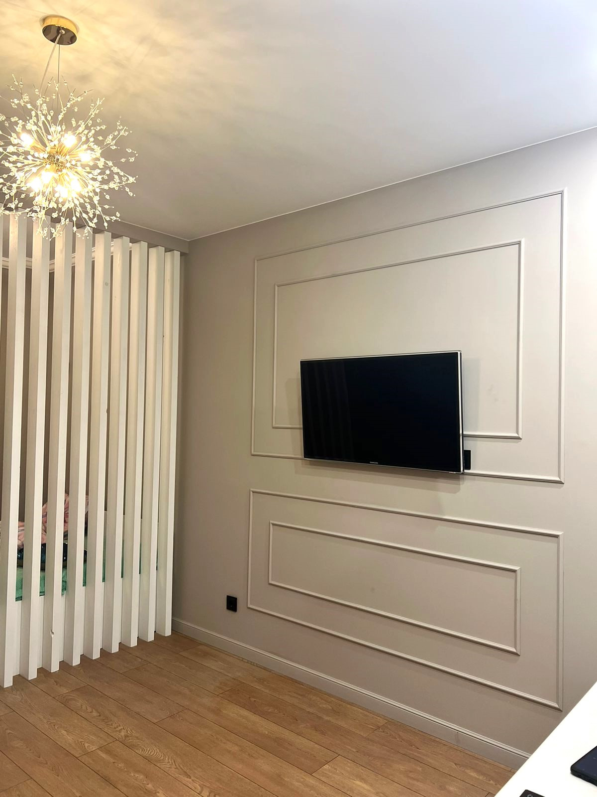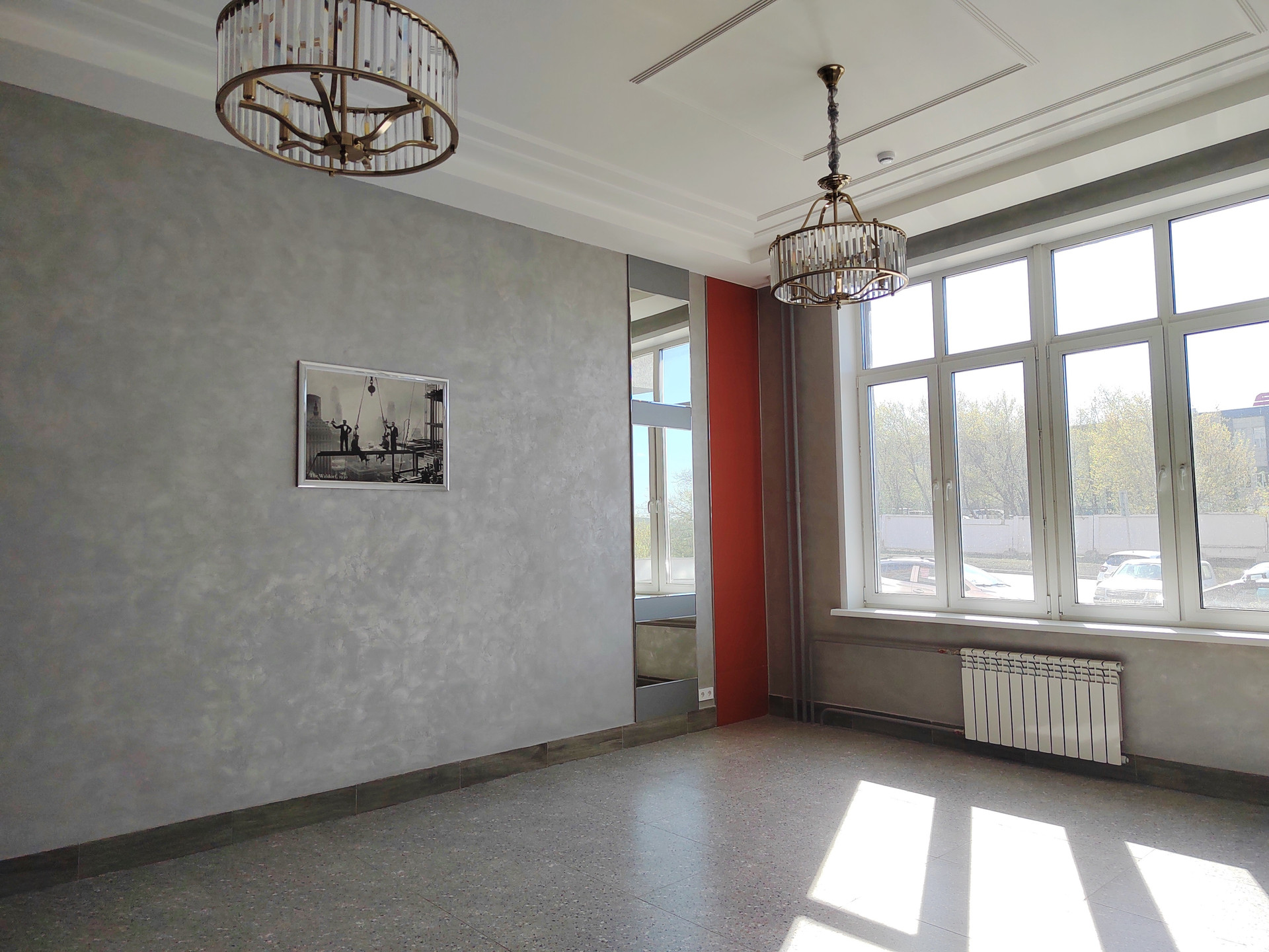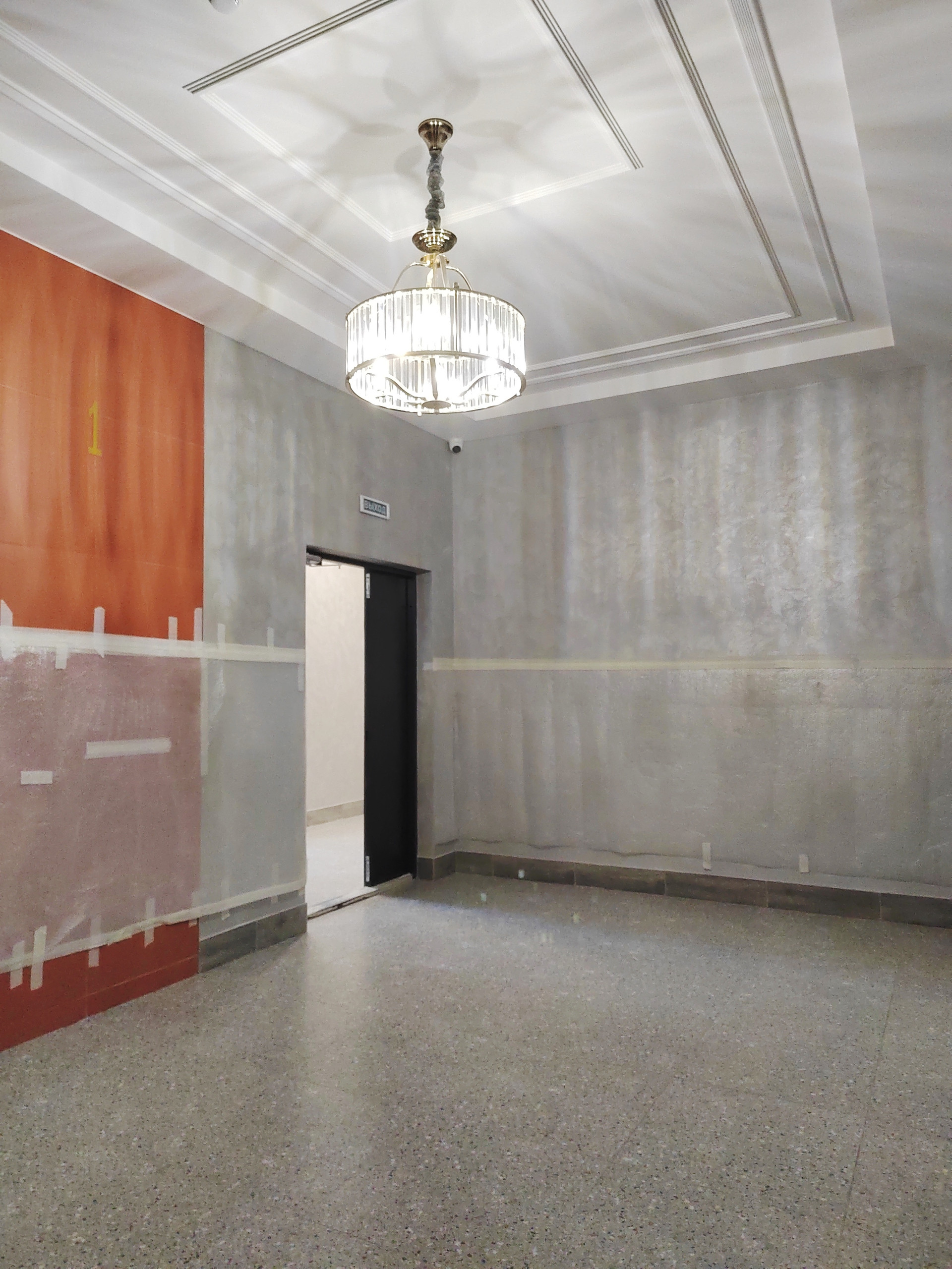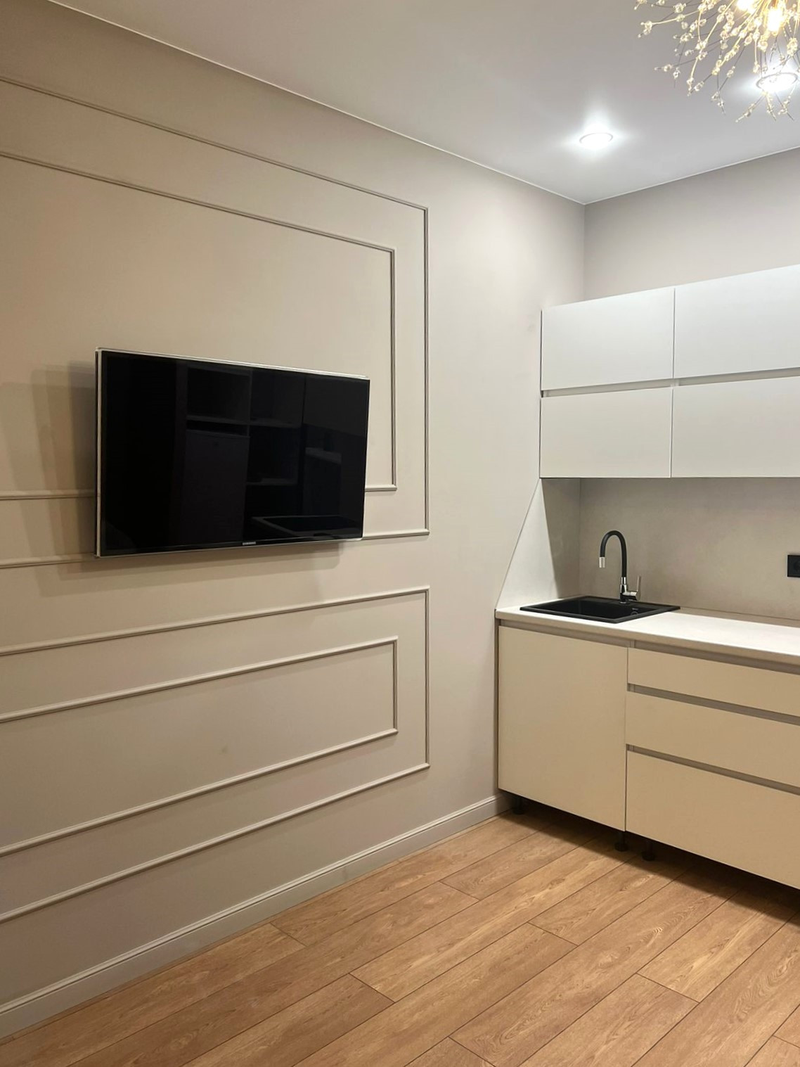 Стены выровнены под маяки, потолок натяжной со встроенным освещением, добавляющим шарма и уюту.