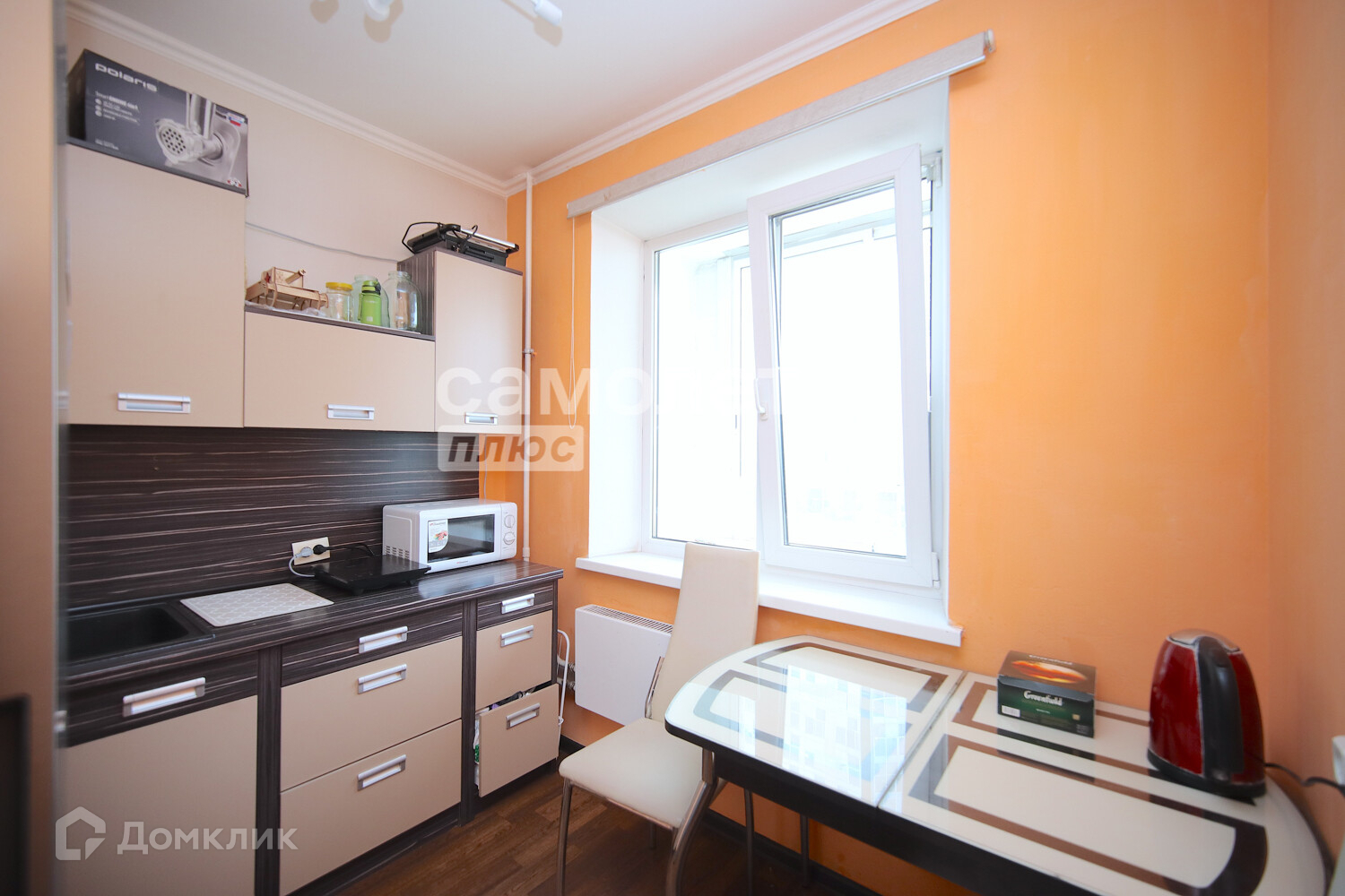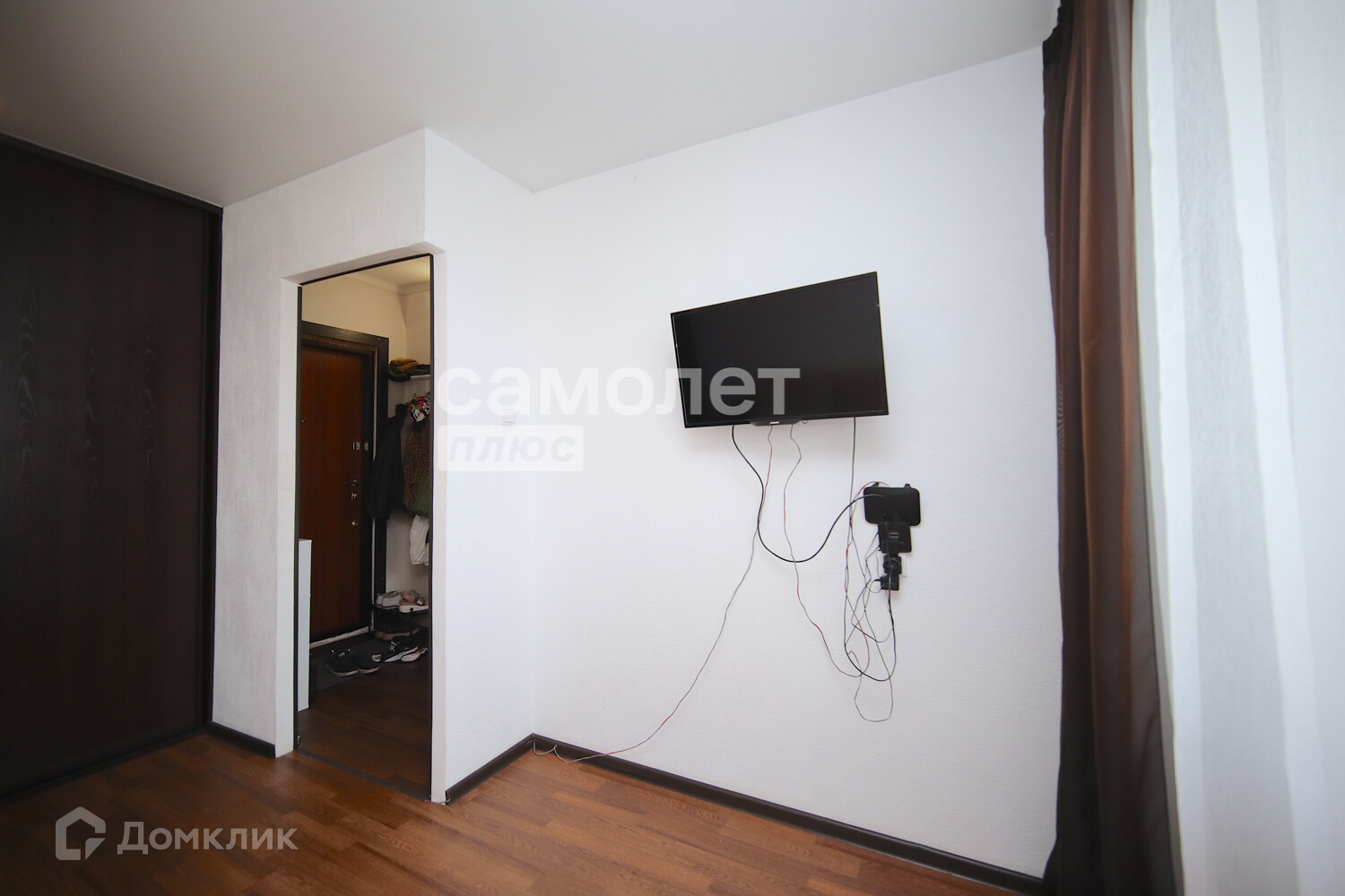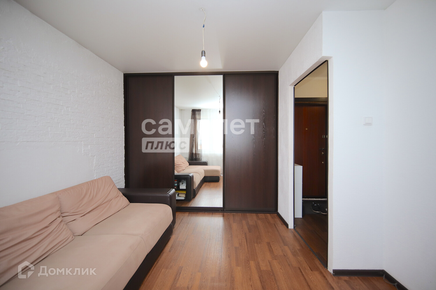 В комнате есть встроенный шкаф-купе, также остается диван, в кухне - кухонный гарнитур и обеденный стол.