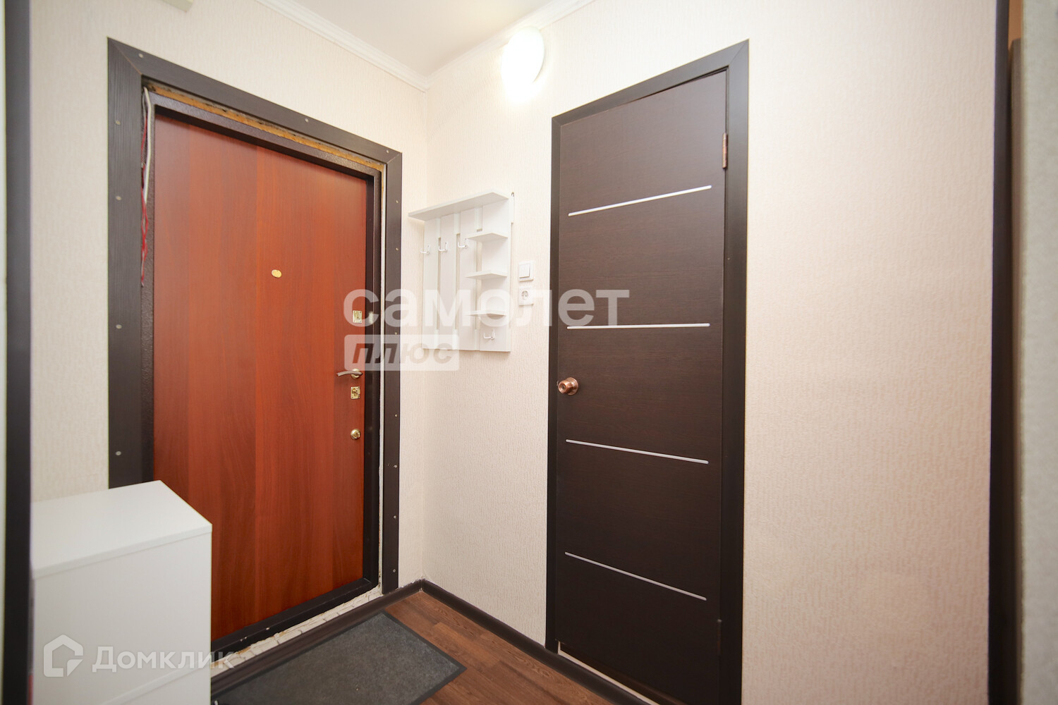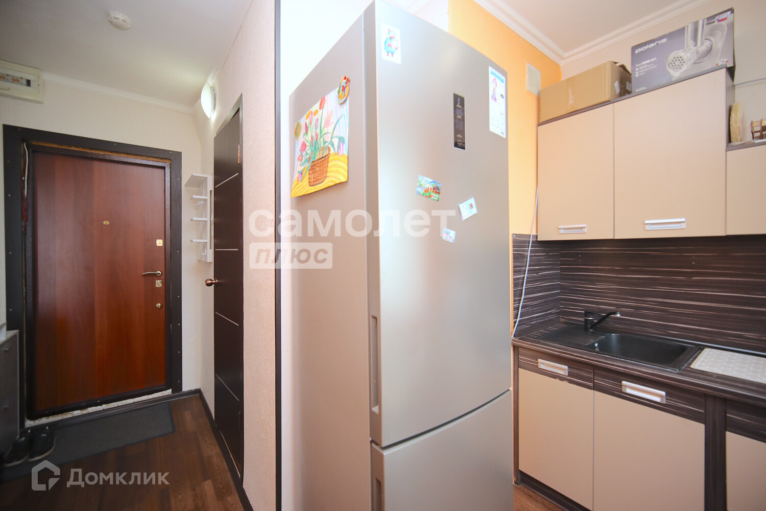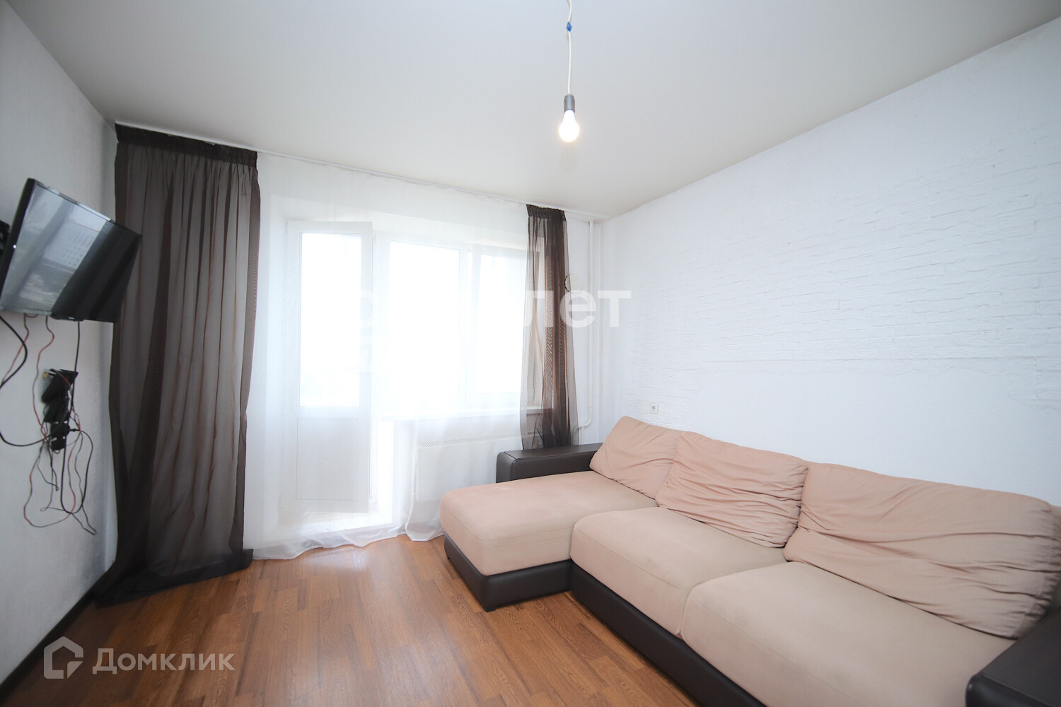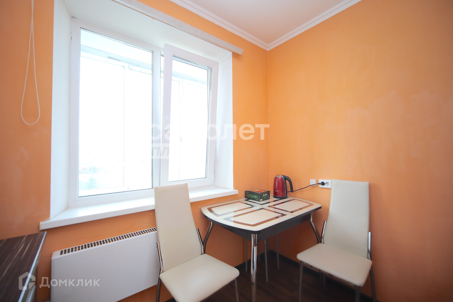 В комнате есть встроенный шкаф-купе, также остается диван, в кухне - кухонный гарнитур и обеденный стол.