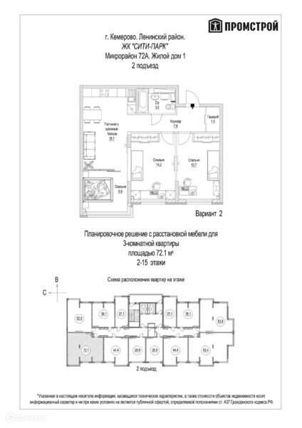 3-комнатная квартира, 72.1 м2, этаж 12 / 15, на продажу в Кемерово, микрорайон 72А, 1