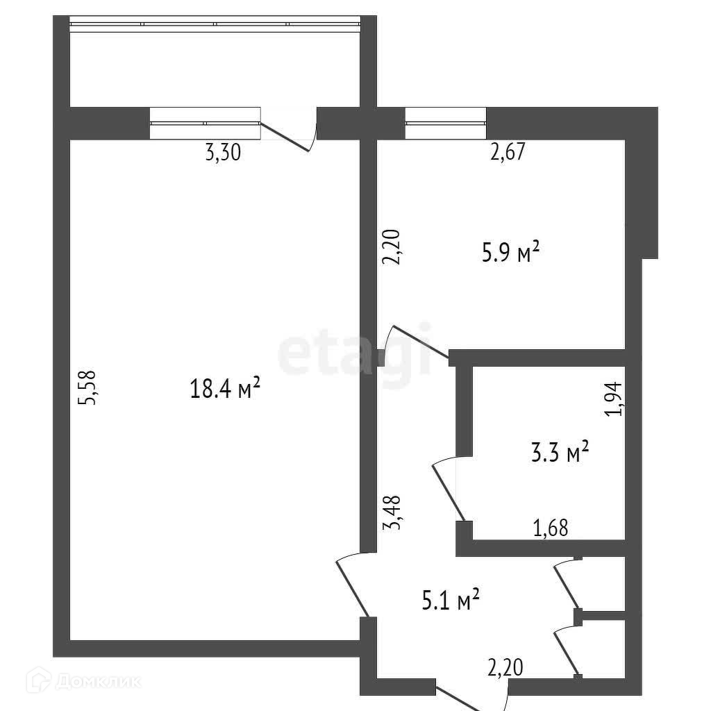 Площадь квартиры 33,4 кв.м. ,жилая 18,4 кв.м, площадь кухни 5,9 кв.м.